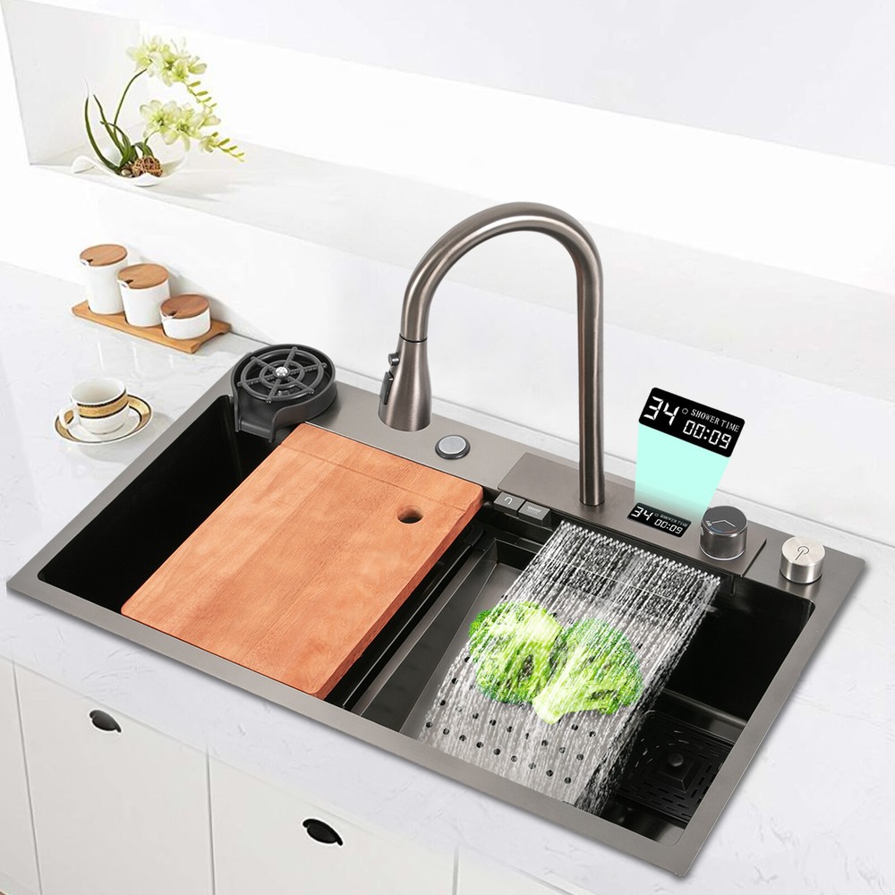 Kitchen Sink Stainless Steel 32"x18'' Drop-in Large Basin Kitchen Sink W/ Faucet Description This 201 stainless steel sink adopts a nano-electroplating process, with exquisite workmanship, which is wear-resistant and corrosion-resistant. Its enlarged and deepened sink not only alleviates splashing problems but also increases space utilization for washing large quantities of cookware. It can not only be used as a traditional sink but also can hold a cutting board for chopping vegetables and meat. With it, you can enjoy a more convenient and healthier life. Key Features Build to Last: The premium 201 stainless steel, as well as the exquisite nano-electroplating process, make this product wear-resistant, heat-resistant, corrosion-resistant, and not easy to rust and deform, ensuring a long service life. Large Sink Size: It is large (31.5*18.1*7.9 inches) and can accommodate a large number of plates, dishes, and pots at once. Moreover, it prevents splashing when washing fruits and vegetables. Washing Assistant: The 360° pull-out faucet, three water dispensing modes, and the waterfall spout make the product a wide range of cleaning and more convenient to use. The smart temperature display allows you to easily monitor water temperature and improve the safety of use, and the hydroelectric design doesn't require an external power supply, which is energy-saving and efficient. Humanized Design: The anti-condensation coating prevents condensation in the sink and thus prevents moisture in the kitchen cabinets, and sound-deadening pads reduce noise. Additionally, the right-drain design effectively increases the utilization of cabinet space underneath the sink. Multi-functional: The double-rail design of this sink helps you achieve efficient cooking. It converts into a work platform with the flexibility to place the mobile cutting board and draining basket without taking up countertop space, which greatly saves your workspace and makes it easier and more efficient for you to wash vegetables and dishes. Quick Drainage: It has deflector slots at the bottom for good drainage, effectively preventing water from accumulating inside. It comes with a convenient knob, removable strainer, and a large-diameter drain that allows large amounts of water to drain quickly while preventing food debris from clogging the pipes. Easy Installation: The simple structure and complete set of mounting accessories allow for fast and accurate installation. In addition, different mounting methods can meet your different needs. Easy to Clean: The smooth surface and round corner allow you to easily clean it without leaving dead corners of dirt accumulation. Ideal Gift: This product is stylish and high-quality and can be used as an ideal housewarming, birthday, and holiday gift for parents, friends, and loved ones. Good Customer Service: We stand behind all our guests and look forward to assisting you with your purchase. It is our pleasure to answer your confusion and questions. The end of the story between us is not "we sell and you buy". Details High-pressure Cup Washer: With it, you can operate with one hand, cleaning cups faster and more convenient, while freeing your hands. Water Purification Faucet: The product comes with a separate water purification faucet, and you can connect it to a water purifier (not included) for clean water. Narrow Edge: This design saves space and meets a variety of installation methods. Drain Pipe: It can be bent freely to suit the installation position, reducing restrictions on use. Arcs Shape: The rounded and smooth edges not only add to the aesthetics of the product but also improve the safety of use. Application This product can be widely used in homes, restaurants, laundry rooms, basements, bars, kitchens, food trucks, dessert shops, coffee shops, hotels, garages, gardens, pet shops, etc. for cleaning tableware, vegetables, fruits, pets, etc. Specification Color: Black Style: Modern Shape: Rectangular Material: 201 Stainless Steel Process: Nano-electroplating Assembly Required: Yes Cold Water Pipe Length: 60cm/ 23.62 in Hot Water Pipe Length: 60cm/ 23.62 in Downpipe Length: 60cm/ 23.62 in Faucet Height: 40cm/ 15.7in Sink Size: 80*46*20 cm/ 31.5*18.1*7.9 in Gross Weight: 13kg/ 28.66 lbs Package Size: 86*53*28 cm/ 33.86*20.87*11.02 in Package Included 1* Sink 1* Digital Pull-out Faucet 1* Cutting Board All Accessories for Installation Notes Please note that the main water outlet switch needs to be turned off after each use. Please do not let soft iron, hard or rusty objects contact with the sink for a long time. Please do not wash items in the sink with strong acids and bases. Please clean the sink after each use and wipe it dry. Please allow the slight color difference caused by the shooting light and the 1-3 cm error due to manual measurement, and make sure you do not mind before ordering. Payment Delivery details Terms of sales About us Contact us Payment We accept ebay payment 。 Fees such as import duties, taxes are not included in the item price or shipping costs. These charges are the buyer's responsibility. Delivery details Shipping: 2-9 working days to: USA Terms of sales We maintain high standards of excellence and strive for hundred percent customer satisfaction. Feedback is very important to us. We hope that you contact us immediately before you give neutral or negative feedback, so that we can address your concerns. It is impossible to address issues if we do not know about them! About us Your satis faction is our ultimate goal. We work hard to earn your trust and future business. Our certified technicians have tested each item before shipping. The unit comes with 1 year limited warranty on all manufacturing defects. a) If you receive a defective item, you may return it or ask for a discount. Please contact us within 14 days after you receive the package. b) What you returned must be intact and in its original packaging as re? u. Customer is responsible for shipping costs of the ret