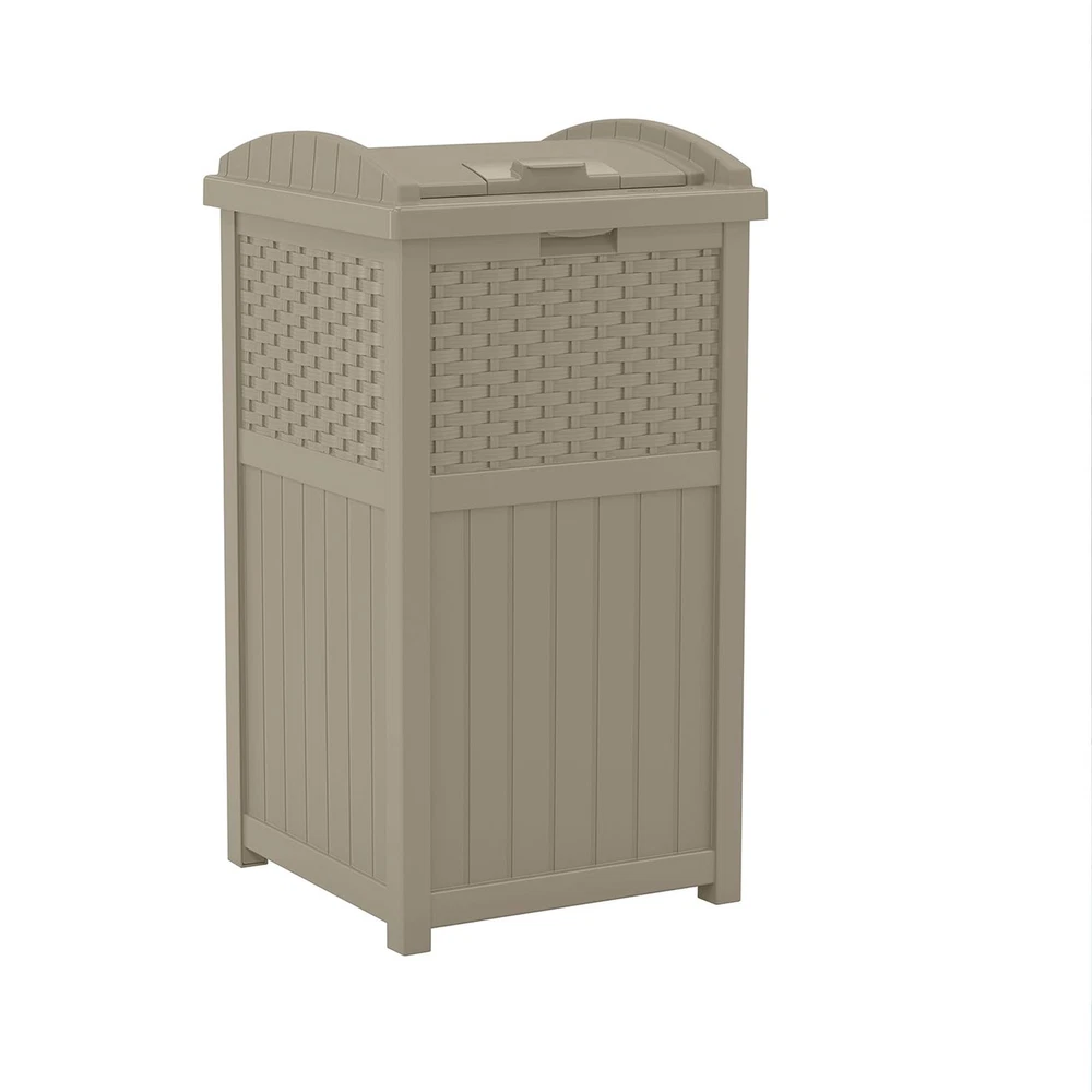 Keep unsightly garbage and recyclables out of view with the TRASH HIDEAWAY Refuse Container. The decorative yet functional design is compatible with standard 30-33 gal. garbage bags, ensuring ease of use. Plus, the unit features a stylish, contemporary wicker-style design that will look great on any patio or deck, beautifully complementing most furniture. Additionally, the TRASH HIDEAWAY technology features a secure latching design to help keep trash in and critters out. When it comes to cleanup, there's no better solution for your space. OUTDOOR TRASH CAN WITH LID: Outdoor trash can has a capacity of 30 to 33 gallons that is ideal for backyards, patios, or decks DURABLE: Constructed with durable resin that resists fading and keeps water out through every season FUNCTIONAL DESIGN: Lid is hinged for easy access and, latches securely so garbage stays in the bin, keeping your backyard area clean DECORATIVE: With a wicker design, this dark taupe can is an attractive solution for your refuse that will match most outdoor décor COMPACT SIZE: Trash can is built to maximize function while minimizing impact to your living space (measures 15. 75" x 16" x 31. 6")