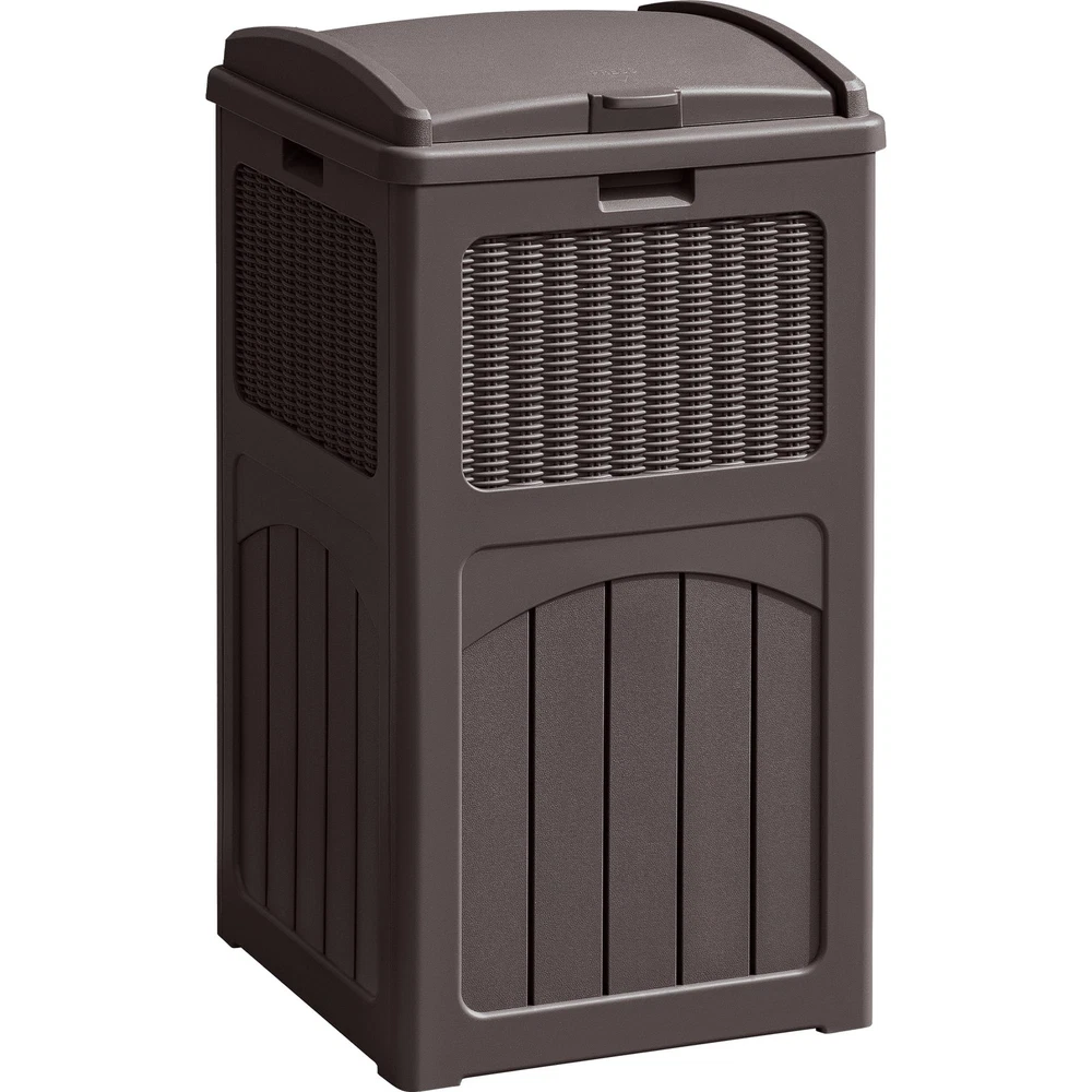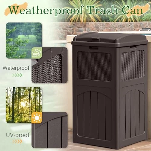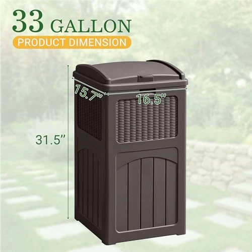 33 Gallon Outdoor Trash Can for Patio Feature: The trash is in imitation rattan weaving design. Made of high quality resin material, the trash can is waterproof and UV proof. And it is suitable to be used as a mailbox. Specification Color: Dark Brown Package Dimensions: 31.69"(L) x 17.72"(W) x 7.87"(H) Package includes: A trash bin A manual of installation and usage Notice: There may be some differences between photos and items in term of color, because of the influence of lighting during the shooting or the settings of the computers’ display screen. Outdoor Patio Trash Can: Designed with imitation rattan weaving patterns, this outdoor waste bin not only looks beautiful, but also has strong practical functions. It is waterproof, UV-resistant, fade and warp-resistant, and can meet the needs of different scenarios Multi-Functional Use: This resin outdoor trash can withstand the effects of various outdoor elements, preventing the entry of water and dust. It can also be used as an outdoor storage bin, suitable for patio, swimming pool and other multi-scenario use needs Large Storage Space: This trash can has a storage capacity of 33 gallons and measures 16.5”(L) x 15.7”(W) x 31.5”(H). It can fit garbage bags in 30-33 gallon Dual Lid Desin: On the top, there is a securely latched lid, and you can easily open it by simply pressing the position with the logo “press” printed. You can easily change the garbage bag by lifting the external lid. Also, the external lid holds the trash bag in place so it won't move around easily Easy to Assemble: The trash can is easy to assemble within 10 minutes with no screws needed