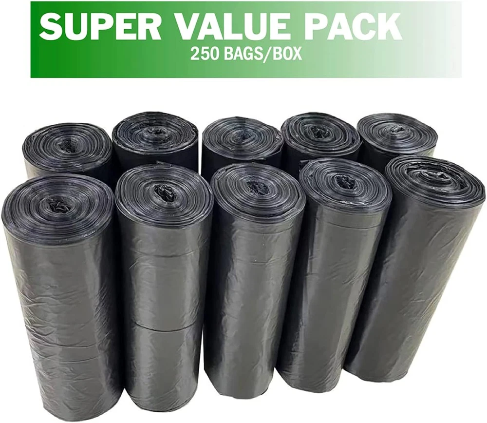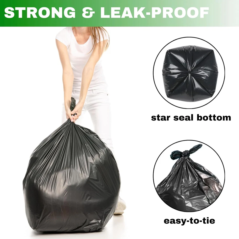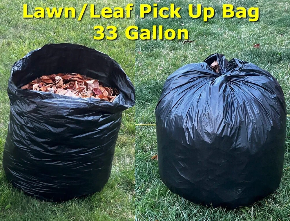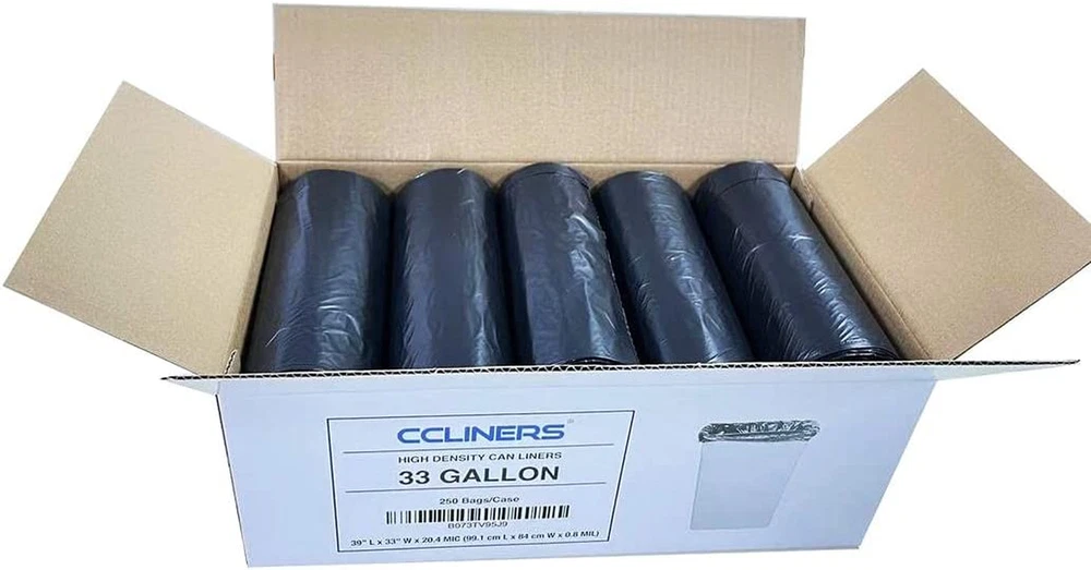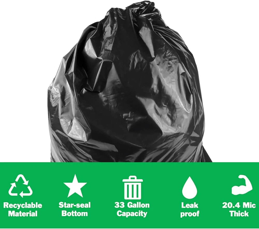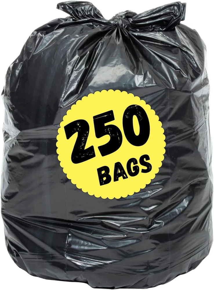 Durable HDPE Material: Made from thick, durable HDPE plastic for long-lasting use. Large Capacity: Each bag measures 33 gallons, providing ample space for trash disposal. Trash Bag Variety: Pack of 250 black plastic bags ideal for commercial and industrial waste management. Convenient Size: With a capacity of 33 gallons, these trash bags are perfect for large trash cans. Easy to Use: Simply place the trash bag in your trash can and tie the open end to secure it in place. Product Description VALUE PACK Each box contains 33 gallon capacity 250 trash bags that provide a great solution to all of your waste management needs. Our bags are made from quality high density material for durability while maintaining low cost of production to offer you the best deal possible RECYCLABLE MATERIAL Our bags are made of recycled plastics and resins to help your business incorporate green initiatives into your daily operation. This helps to provide great resistant to puncturing, spills and tearing. These bags are 20.4 microns thick and are suitable for light-medium duty trash disposal. Main Features: 33 Gallon Capacity (39" L x 33" W) Super Value Pack - 250 Bags/box Reinforced star-sealed bottom 20.4 Microns thick - Medium Duty Convenient Packaging - 10 Rolls/box Features: SUPER VALUE PACK: To provide good quality bags at an affordable prce, we used a high density material which has the right thickness for light-medium weight garbage. This thinner construction makes this liner easier to store and help you reduce the amount of plastic waste you home/business generates. MULTIPURPOSE: This 33 gallon (33" x 39" , 20.4 micron ) capacity can liner is perfect for a variety of applications from household to industrial use. It can be used in kitchens, restrooms, offices, restaurants, hotels, amusement parks, retail stores or outdoor recreation centers. STAR SEAL BOTTOM: Featuring a star seal construction at the bottom, this trash bag helps eliminate leaks, messes, and spills. In addition, this makes it easier to remove the trash bag from the bin and then carry it to the dumpster much easier as compare to flat-bottom can liners. MEDIUM-LIGHT DUTY: This bag is meant to be used for non-sharp objects . However, its construction makes it more puncture-resistant & capable of holding a larger quantity of medium duty waste. With a resilient & reliable construction, this trash bag is perfect for all your waste management challenges. About Us We are a small family owned business based in the USA. Our mission is to focus on providing quality products along with excellent shopping experience. Our business provides a wide variety of affordable premium quality household products to make your day-to-day life hassle-free.
