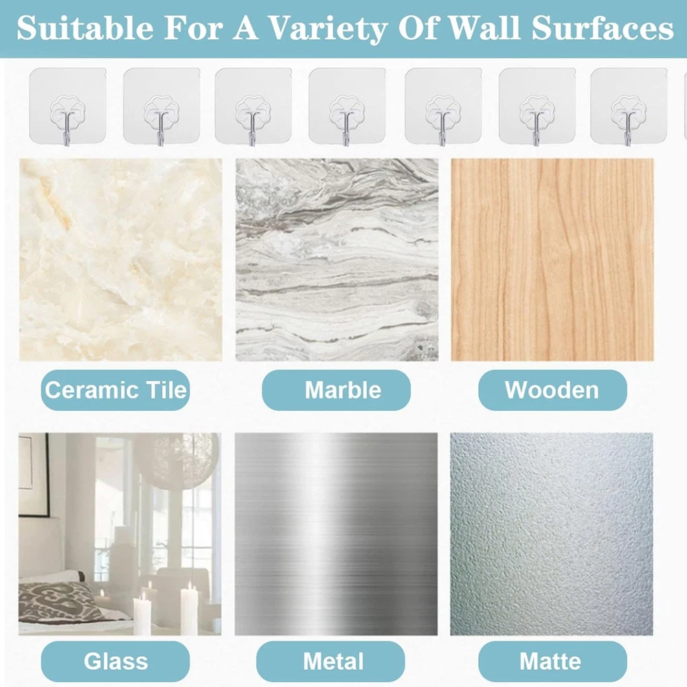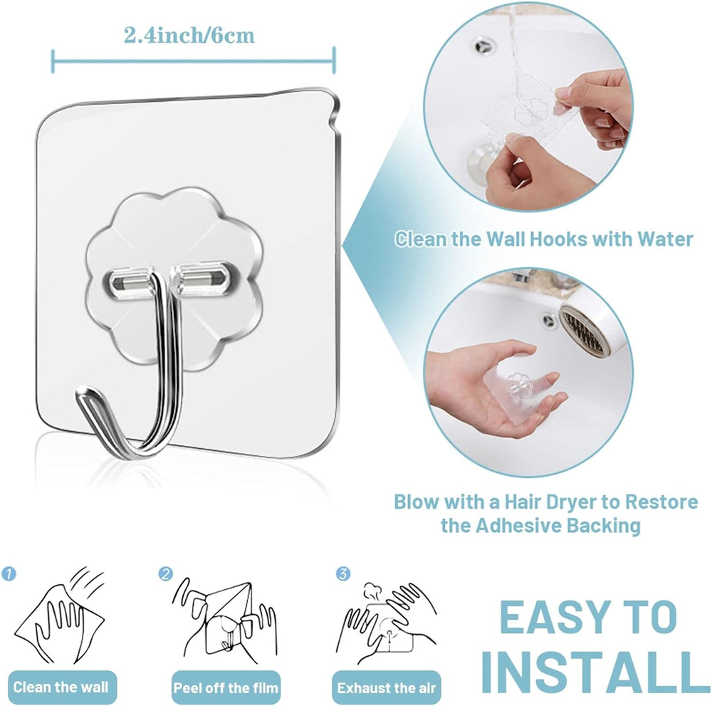 ✅VALUE ADHESIVE HOOKS - Set of 10 self adhesive kitchen wall hooks are widely applied in the kitchen, bathroom, bedroom, living room, entrance, and other places which help to improve your lifestyle, meeting your needs. ✅UTILITY HOOKS - The adhesive hooks are made of stainless steel and PC which features anti-rust and anti-corrosion, these utility hooks are super durable for wet environments, great for long-term use. ✅HEAVY DUTY WALL HOOKS - Fine workmanship, these utility adhesive hooks are with strong sticky backing to provide a large loading capacity of 33lbs/15 kg, it’s not easy to fall off & great for hanging heavy items.Please do not hang fragile items such as mirrors. ✅ EASY & QUICK INSTALLATION - No drilling and no nails required,Self adhesive wall hooks only take few seconds to finish the installation, you can easily attach the utility wall hooks to any smooth surface like glass, metal, wooden door, ceramic tile, stainless steel and more.But it is not suitable for painting walls and wallpaper. ✅BUY WITH CONFIDENCE - These self adhesive hooks are great for hanging tableware, cookware, keys, coat, hat, towels, hanging photo frames, small plants, and more items. All these adhesive wall hooks are well made, feel free to contact us 24 h-support services if there is an issue with our utility hooks. Product Description 10 PCS Adhesive Wall Hooks No more mess in your kitchen, bedroom, or any corner in the house! 10 pieces of adhesive wall hooks help to get everything organized which not only brings you a neat and clean environment but also allows you quick access to the item you want. Made of 304 stainless steel and PC, these wall hooks are anti-rust which is super durable for long time use, while the strong adhesive backing offers an excellent performance in loading capacity of 33lb/15 kg to hang the heavy items. Hanging your tableware, flatware, gardening tools, car repair tools, keys, clothes, towels, and more, these super adhesive wall hooks help to bring more convenience to easy your home lifestyle. FOR KITCHEN The adhesive hooks help to hang your kitchenware and cutlery easily, with quick access. FOR BATHROOM Hanging your towels, shower brush, hair drying towel, and other bathroom accessories. FOR LIVING ROOM Bringing more convenience, great for hanging keys, handbags, shopping bags and more. FOR BEDROOM Expand your wardrobe, great for hanging clothes, hats, coat, scarf, no more mess. Reasons for choosing our wall hook Sticking directly, the seamless, powerful load-bearing capacity of 33lb/15kg for holding most heavy items. The adhesive hooks can be stick on the door, bathroom, bedroom, dining room, anywhere you need them. Super adhesive, holding power, the hook of round corner design convenient for cleaning. No screws or nails are used to prevent damaging the walls, just tear and stick, quick & easy to install. How to delete: Heat it with a hair dryer, then slowly remove it from the side without leaving a trace.