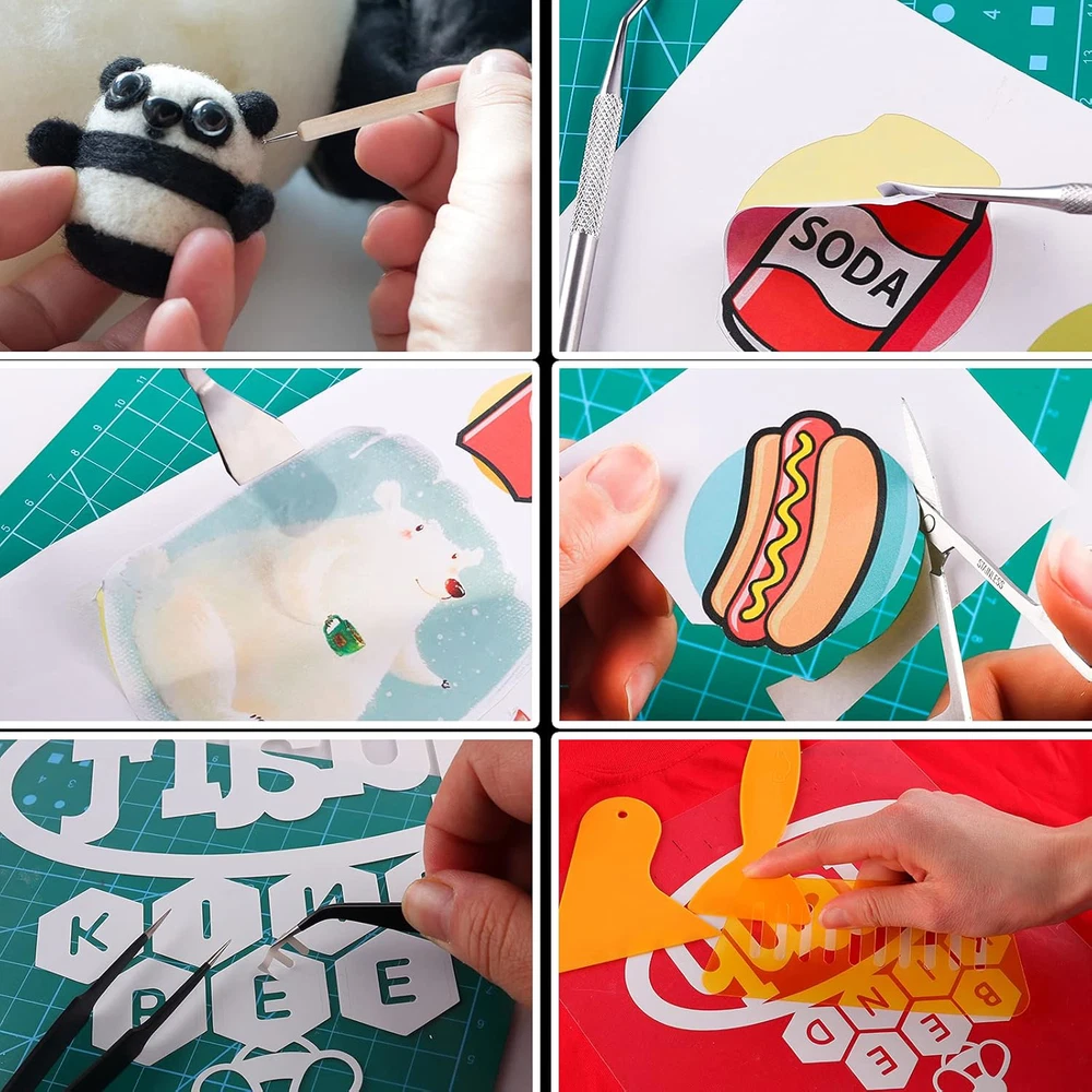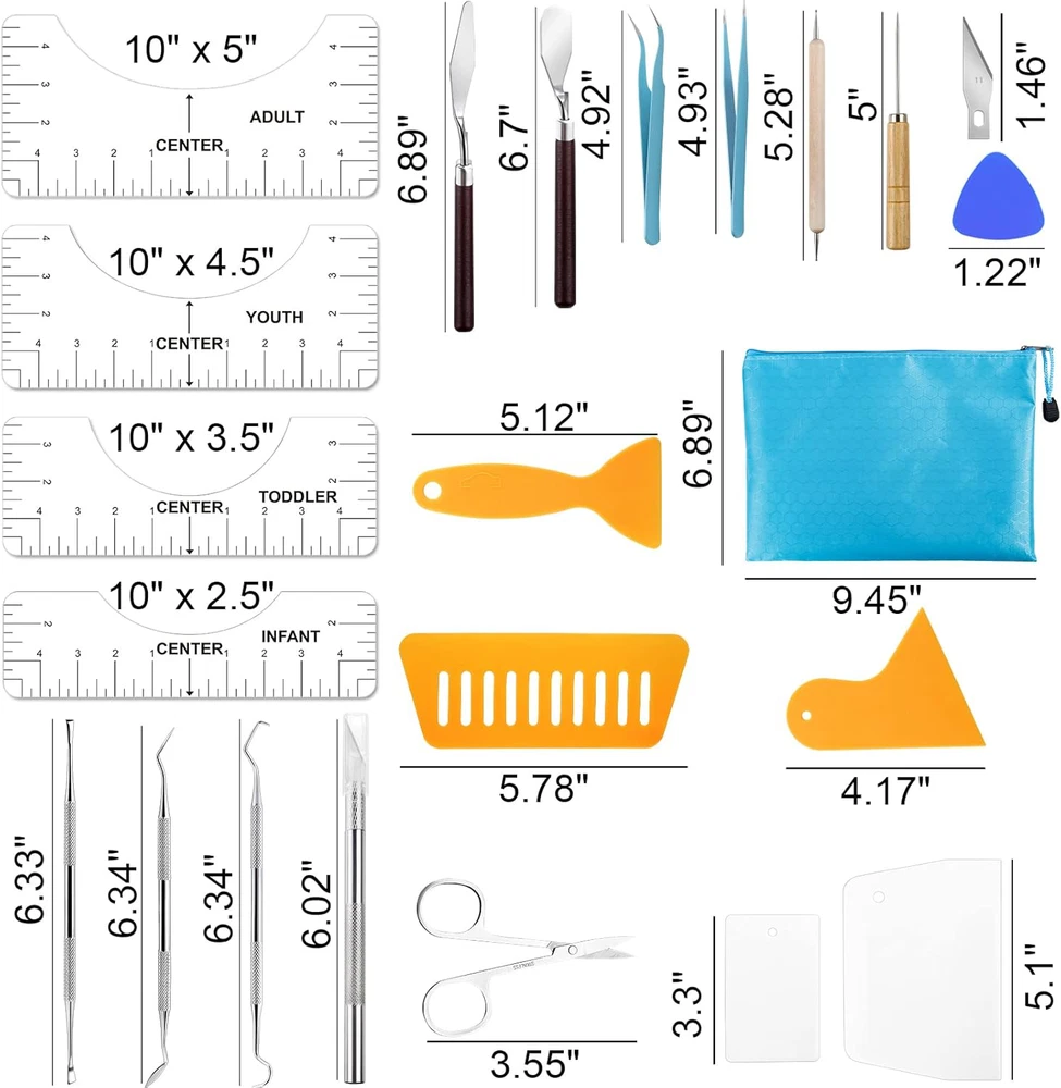 33pcs Vinyl Weeding Tools with T-Shirt Ruler Guide,Craft Tools Set for DIY Heat ???Package Content???: 4pcs sewing rulers, 2pcs tweezers, 2pcs spatulas, 1pcs tracing pen, 3pcs hook weeders, 1pcs stainless steel scissors, 1pcs awl, 5pcs scrapers, 1pcs triangular slice, 10pcs blades, 1pcs carving knife and 1pcs storage bag. ???Practical Function???: The weeding tool set can retain and remove different areas of vinyl accurately, so that you can complete your work efficiently. ???Premium Quality???: Made of high-grade stainless steel, plastic . Durable enough for beginners and DIY amateurs. ???Wide Applications???: They can be used for debris remover, wax carving, embroidery, card stock, DIY art work, rhinestone inlay, etc. This kit will maximize your craftsmanship! ???After-Sales Service???: If you encounter any problems during use, please contact us as soon as possible, and we will provide you with professional services until you are satisfied.