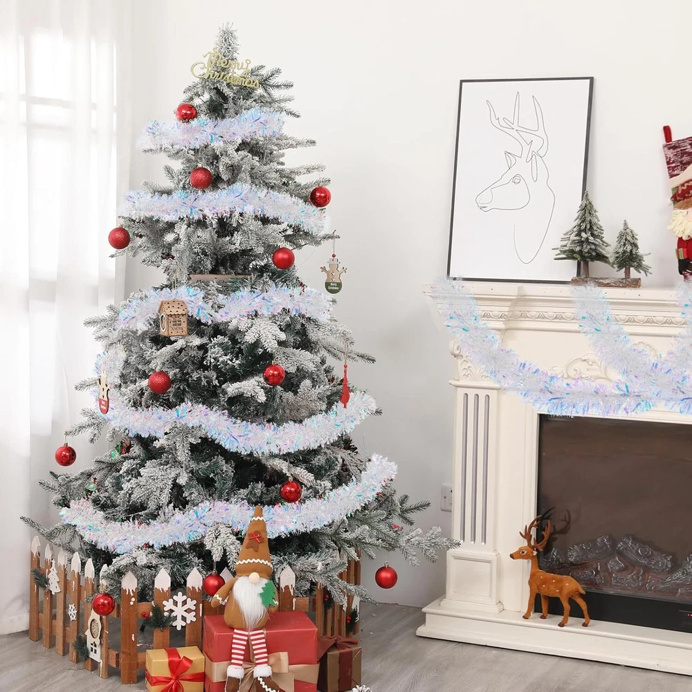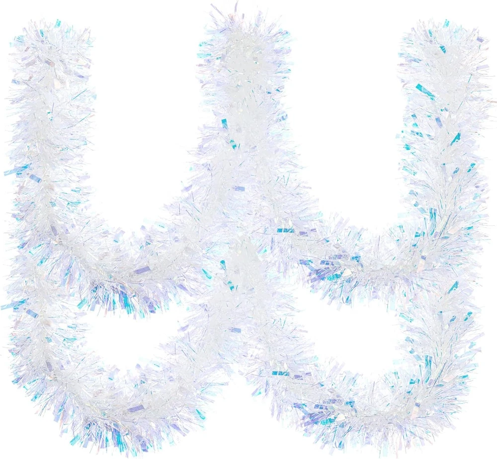 33FT Christmas Tinsel Garland Iridescent Metallic White, White Product Details Shape: Runner Manufacturer: Gloreyan Package Dimensions: 7.64 x 4.25 x 4.17 inches Item Weight: 7.4 ounces Country of Origin: China Item model number: 01 Brand: Gloreyan Color: White Material: Plastic Item Length: 393.7 Inches Is Artificial Garland: Yes Size Information: The Christmas tinsel garlands measures approx. 33 feet/10 meters in length and 3.5 inch/9 cm in width.Very dense and thick ,and sufficient length to meet your daily and holiday use. Material: The Iridescent Christmas garland is made of premium PVC material, durable and no easy to break, lightweight and reusable. Premium Material make it look thicker than usual.High quality foil material makes them glitter and bright. Perfect for Christmas Valentine's Day, New Years and parties,etc. Easy to Use: The Christmas tinsel garland can be cut in a suitable length what you want, and you can hang them on door, window, fence, banister, counter tops, railing and mantle, etc. Exquisite Design: These white hanging garland is designed with bright foil which make the hanging garland look glitter and sparkling in light. Exquisite design, bring interesting and romantic holiday atmosphere to your party. Wide Application: The pink tinsel garland is suitable for Christmas, Halloween, wedding, new year,Valentine's Day, parties and more;perfect for decorating home, gardens, bushes, flowers, Christmas tree, walls, hedges, banisters, doorways, windows, posts, tables, counter tops, railing,mantle,etc. Gloreyan 33FT Christmas Tinsel Garland for Christmas Tree Decorations Wedding Birthday Party Supplies Specifications: Material: Pvc material and wire inside Color: Iridescent White Length: 33Ft/10M Width: 3.5in/9cm Feature: bright Foil design; can be cut into any length Widly Used:Perfect for Christmas,New Year,Valentine‘s day,wedding and so on.