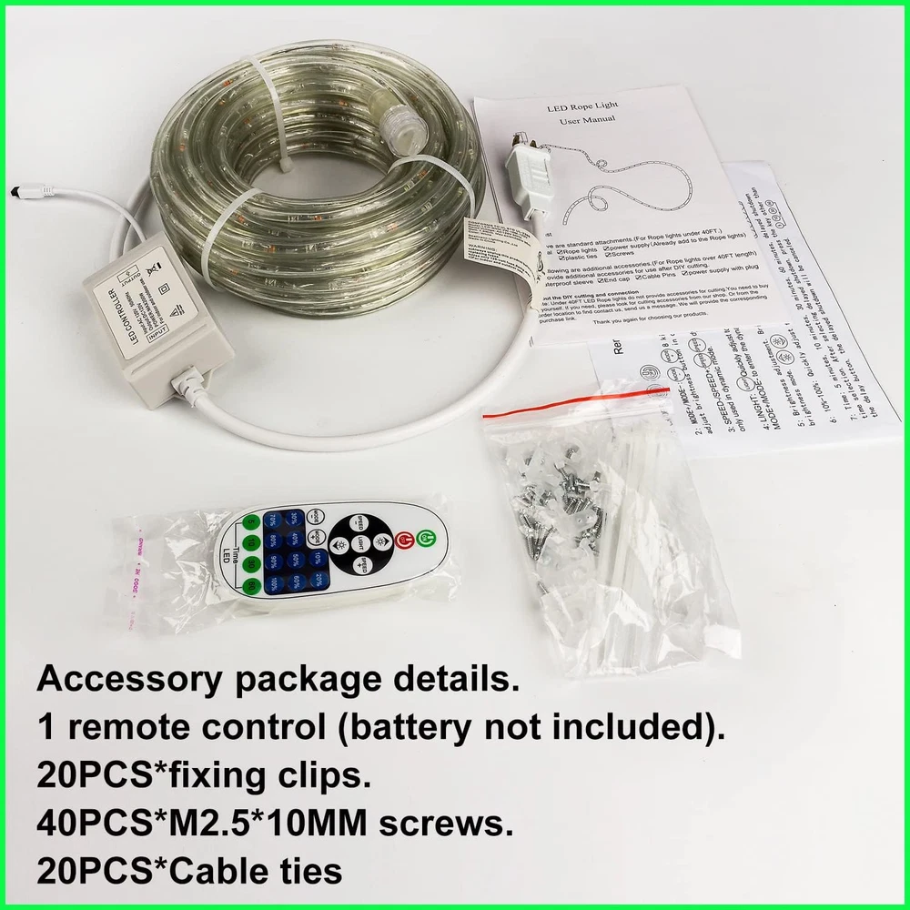 Store New Arrivals Add to Favorite View Feedback Contact Fast deliveries to the customer's home Quality customer service John Make the customers happy! 33FT Rope Lights Outdoor with Remote,Cuttable Connectable, 300Leds Strip Lights with Adjustable Brightness Waterproof with Plug for Patio,Christmas Decoration. (Green) Description 🌟Flexible and Connectable Design: Our LED rope lights are crafted with a high-quality clean tube that ensures the safety of the fairy lights and allows effortless bending into various shapes, enabling easy recycling for future use. The end-to-end connectable feature enables you to connect up to 3 sets, resulting in an impressive total length of 300ft. With this extensive coverage, you have the freedom to fulfill all your creative lighting decor needs. 🌟8 Modes & Safe Operation: Experience a diverse range of lighting options with 8 different modes, including Combination, In waves, Sequential, Slo-glo, Chasing Flash, Slow fade, Twinkle Flash, and Steady on. Conveniently switch between modes using the plug's button to create the perfect ambiance for any occasion. Safety is our priority, as evidenced by the two built-in fuses in the power plug, providing short circuit protection, making these lights highly reliable and reassuring. 🌟Auto Timer & Memory Function: Embrace energy efficiency and convenience with the rope lights timer function. Set them to stay on for 5 - 60 minutes and automatically turns off, saving energy and your time. 🌟Durable and Waterproof Construction: Designed for outdoor use, our LED rope lights are encased in a transparent and thick round PVC tube, ensuring 360 full illuminating and strong resistance to heat. This durable construction allows the lights to withstand various weather conditions with ease. With an IP65 waterproof rating, they are suitable for both indoor and outdoor decorations. 🌟Versatile Usage: Our LED rope lights are not only perfect for enhancing Christmas decorations, party decor, and weddings but also ideal for daily and holiday use. Illuminate cabinets, bedrooms, ceilings, walls, and utilize them as captivating background lighting. Create a delightful holiday atmosphere in your daily life by wrapping them along the pool deck, awning, or any desired location. Product Description This 33FT Remote control Led Rope Lights comes from BEATINEON company in Ca,US.tube is made of clear PVC,Internal all copper wire.Rope lights have a diameter of 2/5in and 9 LEDs/Foot.Total 300Leds.360degrees of light,with infrared remote control,from 5-60 minutes timer on/off function.It can be connected,cuttable,IP65 waterproof.ETL certification,safety and Lifespan more than 50,000H. is ideal for Xmas,Easter,Halloween,Independence day,parties,pool,weddings,outdoor events etc. This led string lights comes with an infrared remote control for ease of use. Pointing to the controller within 16.5FT range, you can easily control the on/off of your Tube Lights. quick setting to 10%-100% deck lights brightness. Set the light off time from 5-60 minutes. There are 8 modes to change the rhythm of the rope lights.These settings will be remembered by the chip when the lights are turned off. No need to repeat the settings, smart, convenient. This rope light can be cut. 3.3FT has a cut mark. Please note. Under 66FT the tube light is not supplied Free accessories for use after cutting.We supply the applicable accessories for sale, please purchase them yourself. (ASIN:B0BN7PT34Z) With remote control/Timing Off this led string lights comes with an infrared remote control for ease of use. Pointing to the controller within 16.5FT range, you can easily control the on/off of your Tube Lights. quick setting to 10%-100% deck lights brightness. Set the light off time from 5-60 minutes. There are 8 modes to change the rhythm of the rope lights.These settings will be remembered by the chip when the lights are turned off. No need to repeat the settings, smart, convenient. waterproof/energy efficient This patio lights outdoor waterproof and very energy efficient, have a diameter of 2/5in and 9 LEDs/Foot.Total 300Leds.with only 0.55 watts per foot, The whole lights is only 17 watts.but the light is very brighting.suitable for many occasions.Rope lights can be used as a decorative atmosphere for Christmas, parties, weddings. Also perfect for daily use. illuminate your anywhere you want to decorate. cuttable/linkable more This outdoor led rope lights it Can be cuttable.3.3FT/each with cuttable markings.If you purchase more led rope lights, you can easily link them together. Up to 330FT can be linked. Note: Free Accessories for cutting and then linking are not provided below 66FT.You need to purchase the attachment for cutting the connection by yourself. if you cut multiple times, you need to buy More additional accessories (ASIN:B0BN7PT34Z) Very Bright but energy efficient The whole lights is only 17 watts This outdoor patio lights Very bright, with only 0.55 watts/foot, 9 LEDs/Foot.Total 300Leds. Want to change the brightness of the light at certain times? Yes. Our light strings ensure that they can provide sufficient brightness. We also consider that some customers need to use a lower brightness at some times.Buy our string lights. There is no need to spend extra money buying a dimmer. Our dimming function is included as standard.And we supply dimming from 10% to 100%. Package included: 1×33ft Rope Lights with plug and Remote control(Batteries not included). 20PCS*fixing clips. 40×M2.5*10 Screws. 20×Plastic Ties. Accessories for cutting are not included, please purchase your own (ASIN:B0BN7PT34Z). Suitable for multiple space, indoor or outdoor Waterproof, anti-glare clear tube light. Whether in the yard, pool, outdoor party, wrapped around the stairs or placed above the ceiling in the kitchen, living room.It will all help to Creating a positive atmosphere Beatineon is a brand of luxurious lighting products, wedding decoration, and home decoration lighting in Cali