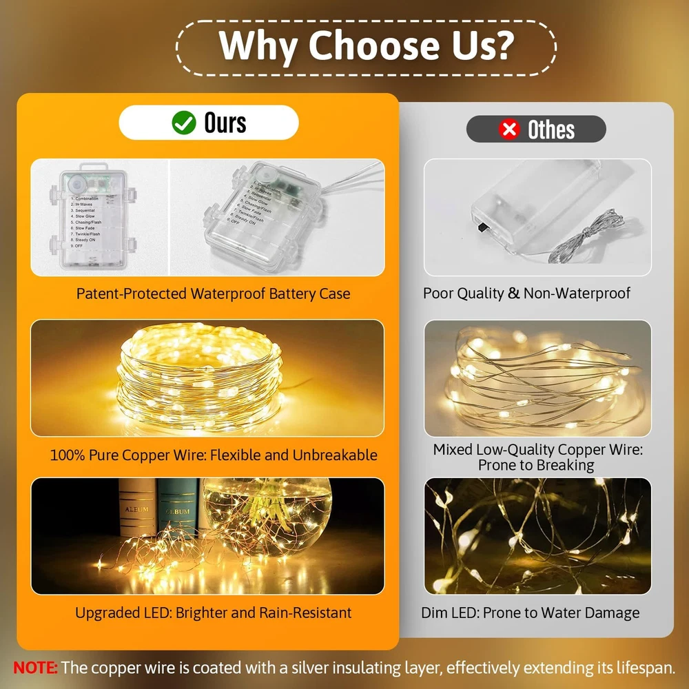 33ft 100 LED Fairy Lights Battery Operated with Remote, Battery Powered String Lights, Waterproof Twinkle Fairy Lights for Bedroom DIY Party Wedding Indoor Outdoor Christmas Decorations 1 PACK Remote Control Fairy Lights: The Multifunctional battery operated lights come with an upgraded remote control for added convenience. You can use the remote to switch between 8 flashing modes, adjust brightness, and set a timer (6 hours on, 18 hours off) to meet your different lighting mode and brightness needs Waterproof LED Fairy Lights: Fairy lights battery operated are perfect for outdoor use, shining brightly regardless of rain or damp conditions. Especially during Christmas, battery string lights can create a dazzling light show no matter the weather Flexible Copper Wire: Fairy lights battery operated feature 100% pure copper wire, unlike many on the market that use alloy wire disguised as copper. This genuine copper wire can be bent over 1,500 times without breaking and easily shaped Led fairy lights into any design you prefer. Enjoy DIY fun with family and friends Ultra-bright: Twinkle lights battery operated use bigger and brighter LED compared to fairy lights. String lights battery powered have an LED lifespan of over 100,000 hours, far exceeding the other fairy lights. High-quality string lights enhance your Christmas experience, allowing you to adjust the lighting with a remote control to create a dazzling Christmas light show tailored to your needs Wide Application Fairy Lights: Twinkle lights battery operated can easily cover large-scale scenes like yard, garden, fence, rooftop, patio, party, wedding, and bedroom making battery string lights ideal for indoor outdoor decor. Led fairy lights also add a touch of elegance to items such as mason jar, bouquet, centerpiece, closet, wreath, and mirror. Battery powered fairy lights are also an excellent choice for Christmas decor