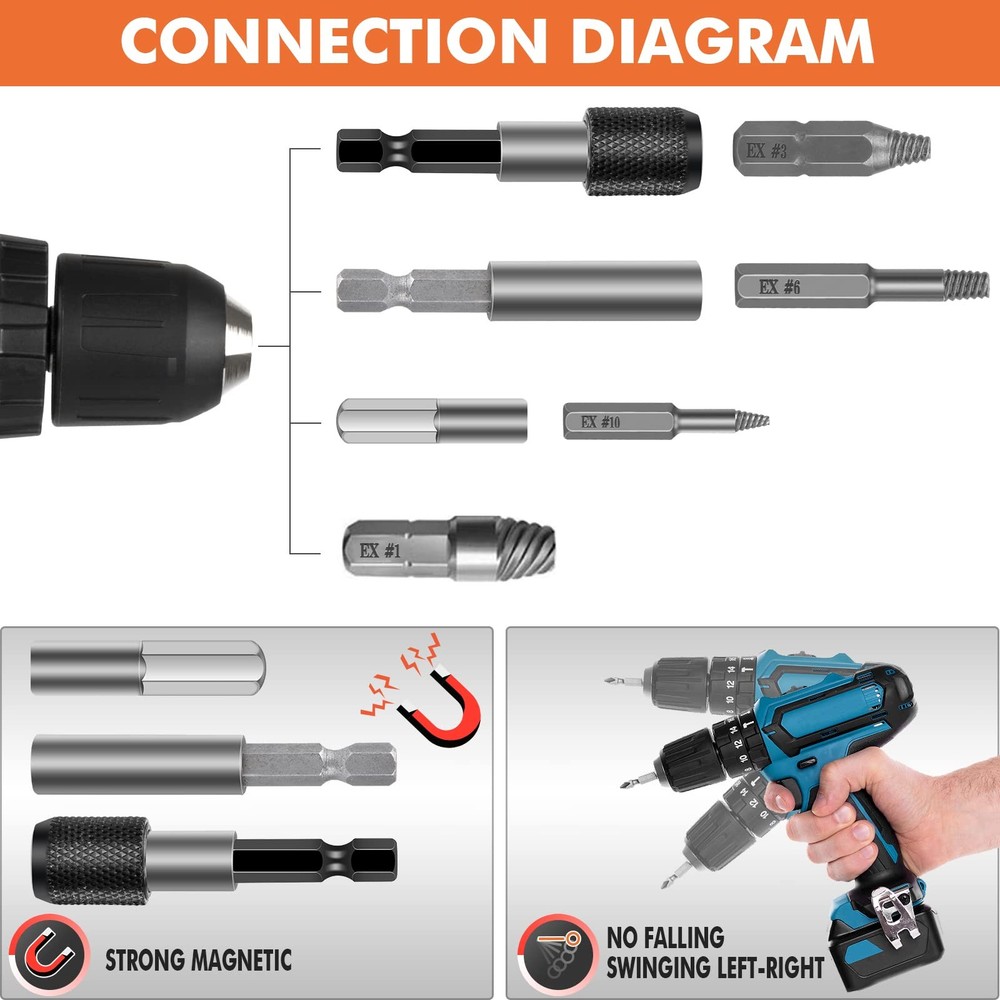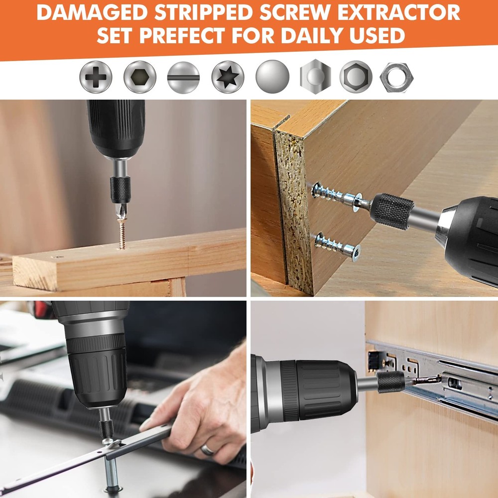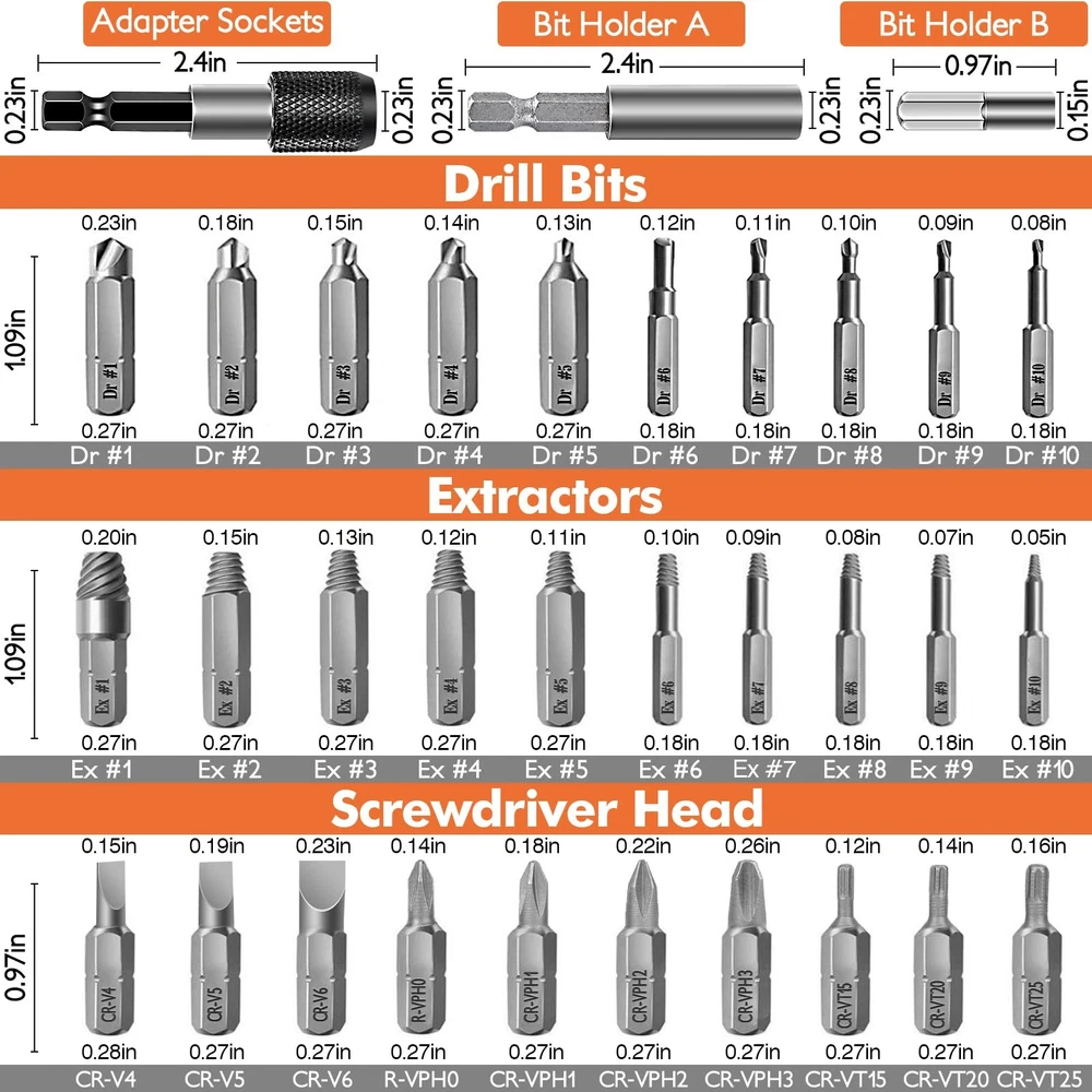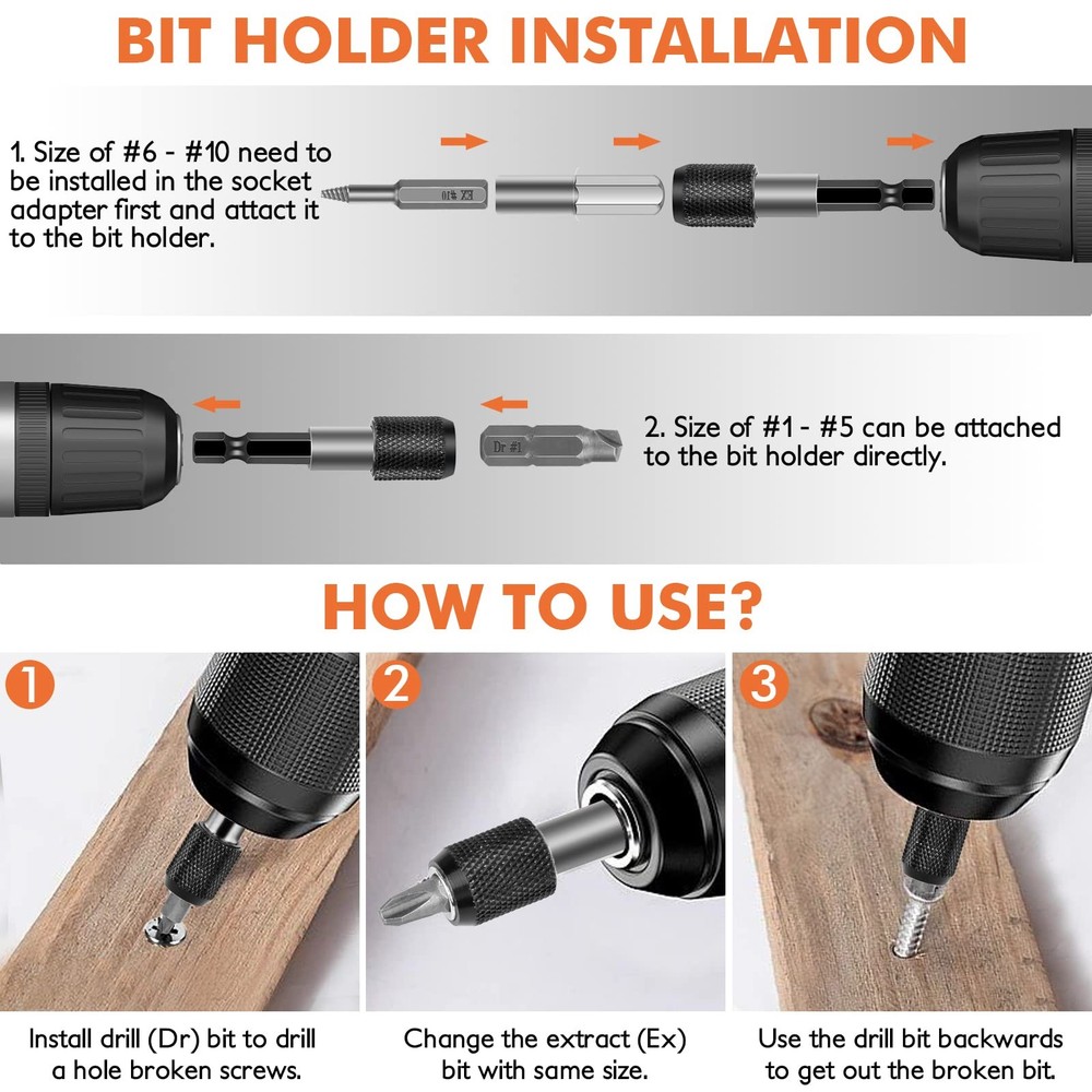 Warm Tips: Please drill a hole first when the break screw surface is smooth. Otherwise the drill bit will slip. Must be vertical and low speed when drilling, reverse use this bit, drill the first hole deeper will easier to take out. It is bettert to use electric hand drill, instead of hammer drill mode! Must be low speed during use! High Quality Hard Material - Made from hard steel, super hardness and long service life. Multiple Sizes - 33 pack damaged screw extractor set has different sizes of Drills and extractors, which provide multiple choices. Magnetic Extension Bit Holder - The upgraded magnetism bit holder can prevent tips from falling, fit all standard electric drills. Safe Storage And Portable Storage Box - ADP, bit holder, drills and extractors are have their slots. Stored neatly and orderly in a 4x5x1 inch box, wery convenient to carry. Good Helper For Most Damaged Screws - The extractor bit set is designed for troublesome stuck screws and bolts. Suitable for all bolts, machine screws, lag bolts, wood screws, hex bolts, sheet metal screws and other screws. How To Use The Bolt Extractor Set? Please note first: the size of #6 - #10 needs to be installed in the socket adapter first, and then attach it to the extension bit holder (size #1 - #5 can be attached to the extension bit holder directly). 1. Install drill (Dr) bit to drill a hole in broken screws. 2. Change the extract (Ex) bit with same size. 3. Use the drill bit backwards to get out the broken bit. Screwdriver Bits Model: Phillips screw: PH0, PH1, PH2, PH3 Slotted screw:4.0, 5.0, 6.0 Torx screw:T15, T20, T25 Package Included: 20 damaged screw extractor(Ex#1 - #10, Dr#1 - #10) 10 screwdriver Bits 1 Socket Extension Bit Holder 1 Extension Adapter 1 Adapter High Quality Material --- Screw extractor set is made of high speed steel, high hardness, durable and has a long service life. Easy to remove damaged screws. ⚠️NOTE: Install on an electric hand drill, not a hammer drill, at low speed. Easy to Use --- Stripped screw remover is can remove in one step. First choose a rotor that is smaller than the damaged screw, turn out a clean hole, then choose an extraction rotor of the same size as you are removing the damaged screw. Our Guarantee & Package Inclusion --- If you are not satisfied with the extractor set you received, please contact us within 45 days for a return. You will receive 10 drill bit set (Dr#1-#10), 10 screw extractors (Ex#1-#10), 10 screwdriver bits, complete with drill holder and adapter socket. Versatile --- Stripped screw extractor set suitable for most types of screws such as socket head cap bolts, lag head screws, wood screws, hex head screws, machine screws, sheet metal screws, lag head bolts, hex head bolts, etc. Portable & Perfect Gift --- Bolt extractor set size :3.9 x 5.07 x 1 inches, and quality carrying case make sure you don't lose one! Great birthday gift, Father's Day gift for dads, husbands, and crafters.