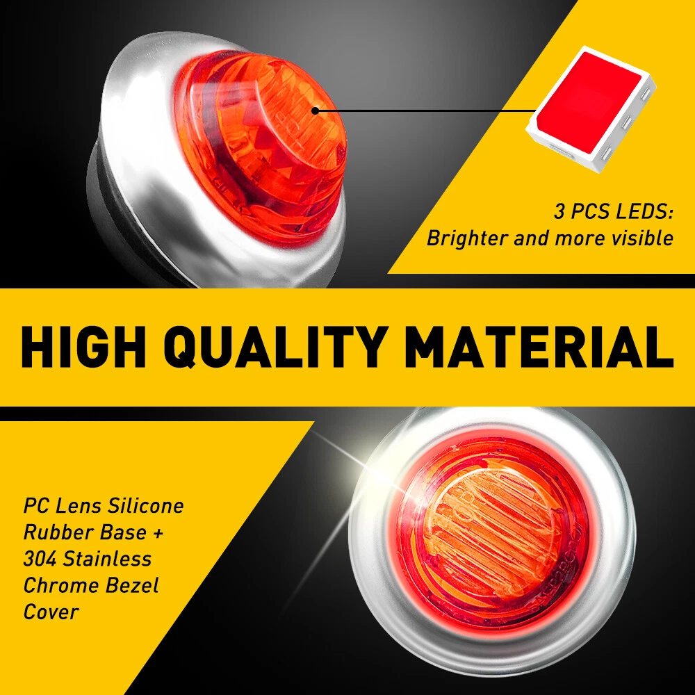 Brand: AUXITO Fitment: For Pickup,truck trailer,boat,Lorry,Van,caravan Placement on Vehicle: Front, Rear, Left, Right Application 3: For Ford Ranger/Focus/F150/250/350/450/550/650/750 .etc Fitment Type: Direct Replacement To Fit: Side Indicator, Sidelight Lighting Technology: LED Fit for: Universal For most 12V Vehicles Heavy trucks gtin13: Does not apply Modification Description: 304 Stainless Chrome Bezel Cover Size: 3/4" Type: Side Marker Clearance Light Led Quantity: 3 LED Style: Decoration Lights Voltage: DC 12V Color: Amber, Red Suitable For: Side Marker Light Manufacturer Warranty: 2 Years Waterproof: IP67 UPC: Does not apply Lens Color: Amber/Red Features: For truck trailer,boat,bus,Lorry,Van,caravan Application 1: For JEEP Wrangler/grand cherokee/Rubicon/Compass .etc Application 2: For Chevrolet Colorado/Silverado 1500/2500/3500HD .etc Manufacturer Part Number: LED Side Marker trailer light