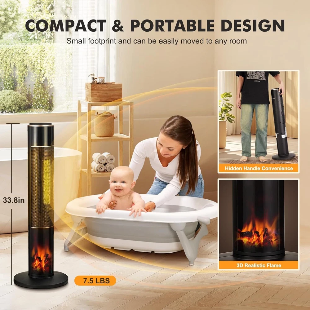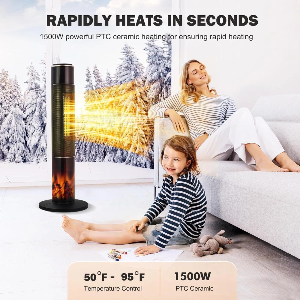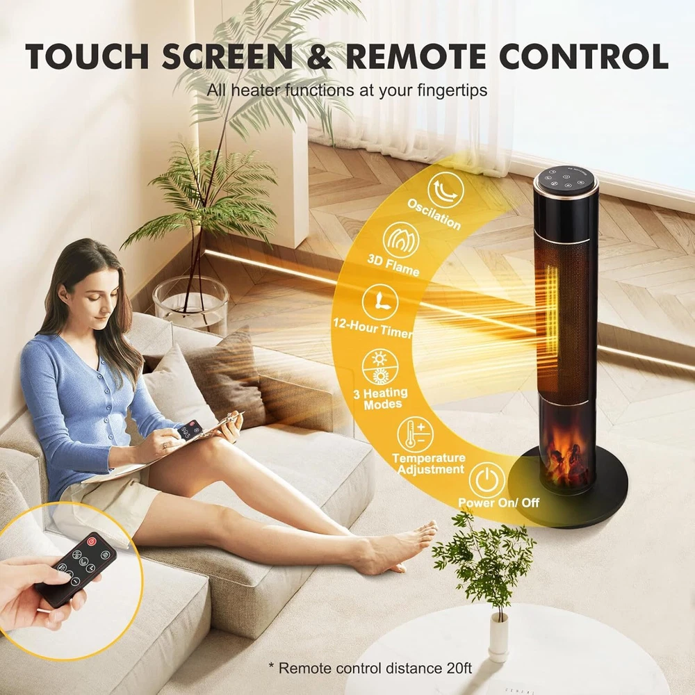 34" Electric Tower Space Heater 1500W With Flame & Thermostat & Timer & Remote