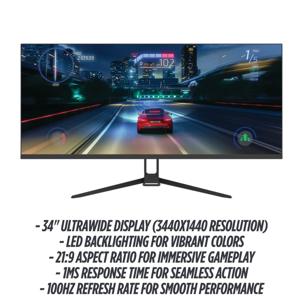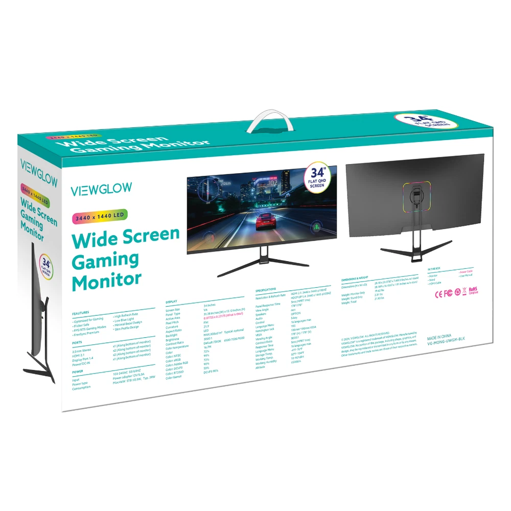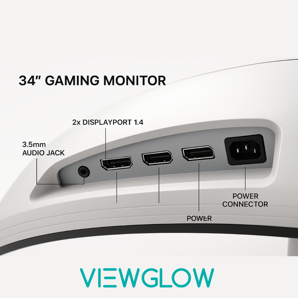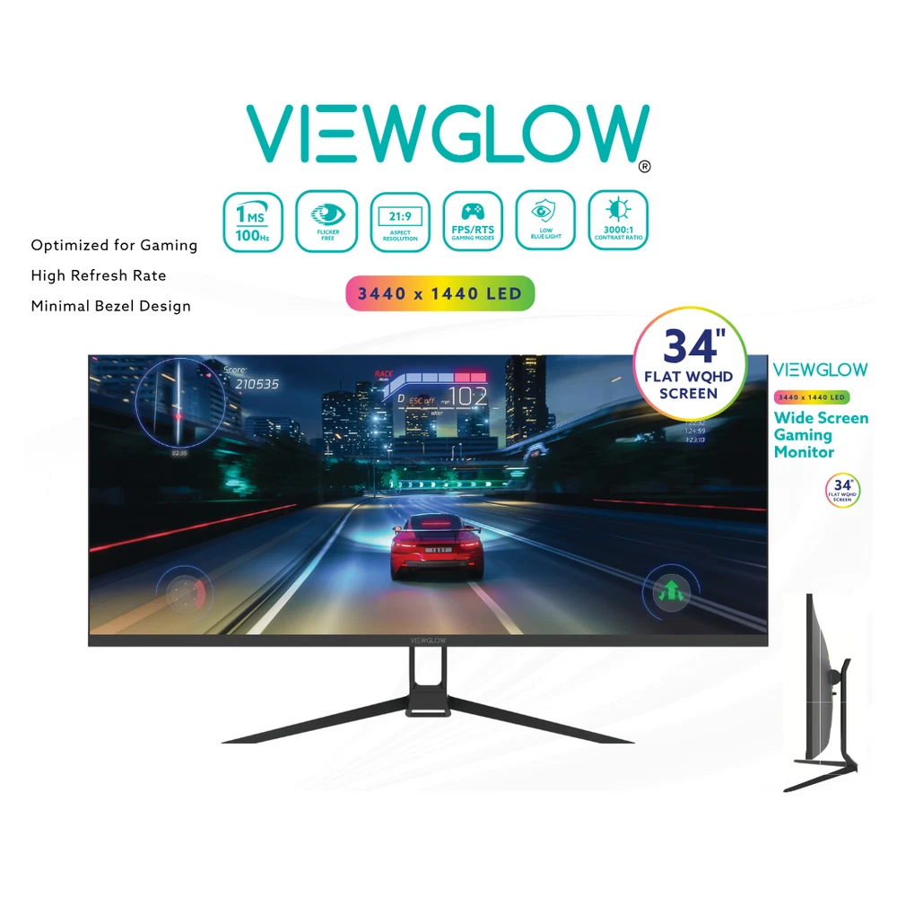 Experience Immersive Gaming with ViewGlow Discover unparalleled visuals with the ViewGlow 34" Gaming Monitor, designed to elevate your gaming experience. Key Features - 34" ultrawide display (3440x1440 resolution) - LED backlighting for vibrant colors - 21:9 aspect ratio for immersive gameplay - 1ms response time for seamless action - 100Hz refresh rate for smooth performance Upgrade Your Gameplay Level up with ViewGlow's stunning visuals, rapid response, and silky-smooth refresh rate. Unlock your gaming potential and dive into immersive adventures. Take Your Gaming to the Next Level Experience the future of gaming with ViewGlow. Unlock unparalleled immersion, precision, and performance. Ports 3.5mm Stereo (1) HDMI 2.0 - (2) Display Port 1.4 - (2) Power/DC-IN - (1)