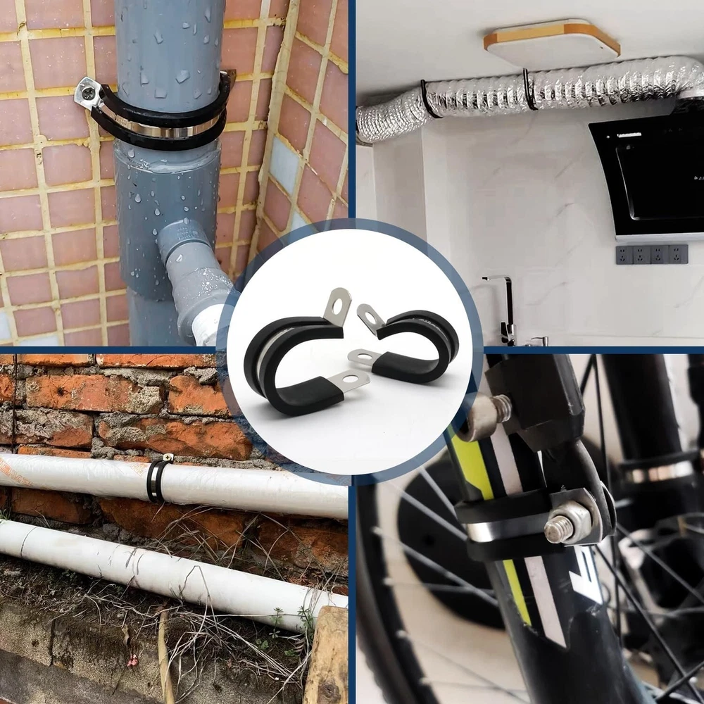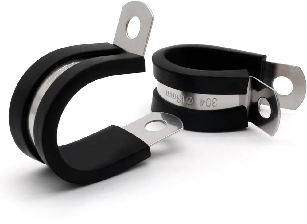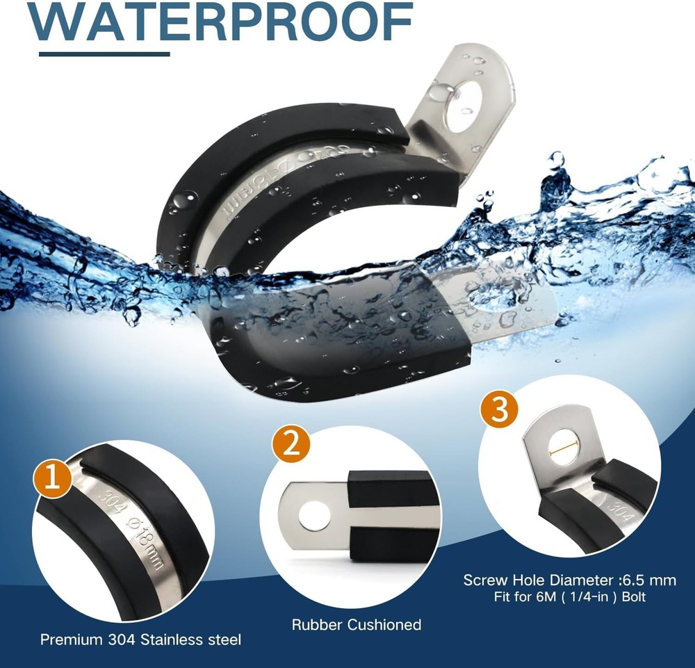 Package includes 20 pieces 3/4 inch cable clamp. Made of 304 stainless steel and sturdy rubber for long-lasting durability and strength. Easy-to-use clamp design securely holds wires, pipes, cables, hoses, and tubing in place; tighten it with M6(1/4") screws. Wire clamp for automotive, marine, electrical wiring, and cable management, providing a sturdy and reliable hold, even in saltwater/air environments. Metal rubber clamps have a P-shaped design making the clamps flexible and stabilized. Easy to twist, bend and manipulate during fitment.