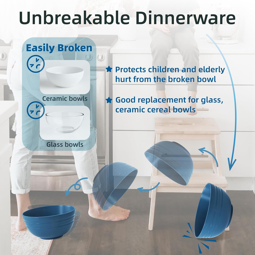 🌾【Wheat Straw Fiber Bowls】Homestockplus cereal bowl made of natural organic wheat straw fiber, food-safe,100% BPA free, non-toxic, odorless and environmentally friendly. No harmful chemical materials. Exquisite color matching,it‘s healthy and beautiful tableware for your family 🌾【Versatile Bowl】34 ounces capacity ,it's deep enough that food does not spill.Perfect for cereal, salad, fruit, noodle and much more. Great for party, picnic, camping, and everyday meals at home or outdoor ✅【Premium & Unbreakable & Made To Last】The premium materials ensure safe use.The unbreakable bowl protects children and elderly hurt from the broken bowl, it's a good replacement for glass, ceramic cereal bowls ✅【Dishwasher & Microwave Safe】 These microwave safe cereal bowls are very easy to clean, you can wash them into your dishwasher. And they work great in microwaves without getting too hot. [ Note: The temperature resistance reaches up to 220 degrees Fahrenheit (110℃).] ✅【Space and Storage Saving Design】The flat bottom design can stand firmly in the cabinet,easy to stack compactly without occupying much space of your kitchen cabinet and disk rack, hence avoid toppling risk Product Description Homestockplus Wheat Straw Fiber Cereal Bowls Our dinnerware are maded of wheat straw fiber provides you with a naturally, beautiful and practical option. Homestockplus is committed to creating durable and attractive bowls set. The wheat straw fiber bowls are food safety, BPA-Free, sturdy and durable, stackable for space saving. And our products are made of natural and come in several different sizes bowls, cups and bento box. Take care of the environment, starting from the reuse of natural products. High Quality and Durable Unbreakable and Lightweight Easy to clean and Storage Stackable and Space Saving Diameter: 6.7 inch Capacity: 34 oz Quantity : 8 packs Weight: 4.45 oz You need a non-toxic odorless and unbreakable cereal bowls for your family Homestockplus Wheat Straw Fiber bowl is a good choice for you Versatile Bowls: Deep enough bowls are perfect for cereal, salad, soup, pasta, ramen etc. Meet your daily needs at home, party or outdoor activities. Dishwasher Safe: wheat straw fiber Bowls are very easy to clean in your dishwasher. Microwave Safe :Work great in microwaves without getting too hot. Sturdy & durable , a perfect replacement for glass and ceramic bowls Take Care of the Environment You'll love this hassle-free wheat straw fiber bowls set. They contain no harmful materials or additives. 100% nontoxic and BPA free Lightweight & Durable The bowls are very lightweight, making them easy for little hands to hold on to.Great for outdoor dining for the family, including little one. Nonbreakable & Sturdy Our dinnerware sets are made of wheat straw which is natural material and is a smart alternative to plastic. No worry about falling down again. Perfect choice for your home. Dishwasher Friendly Clean up is fast with Wheat Straw bowls. Our bowls are perfect for families who wants to spend less time cleaning and more time making memories. Microwave Safe They work great in microwaves without getting too hot.Note: The temperature resistance reaches up to 220 degrees Fahrenheit (110℃) . Stack well They stack well within each other to make them easy to store and take up less space in the cupboard.