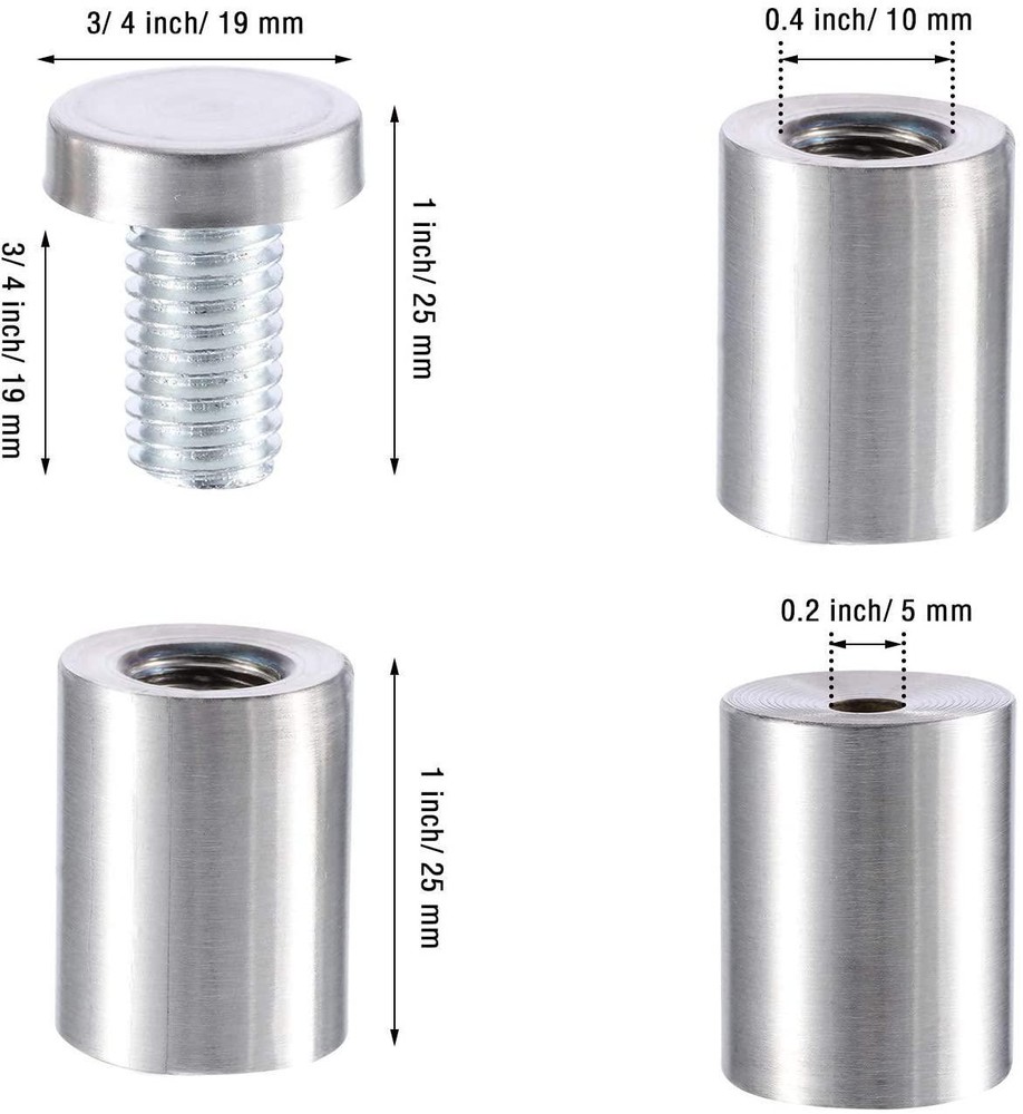 CONTACT US DIRECTLY FOR FREE & PREPAID RETURNS 3/4 X 1 Inch Sign Holders Standoff Screws Wall Mount Hardware Advertising Glass Description Mounting Type Wall Mount Color Silver Brand EBOOT Material Stainless Steel, Rubber Item Weight 300 Grams Item Dimensions LxWxH 6.3 x 2.76 x 0.79 inches Package includes: you will receive 24 pieces Standoff screws: the length of screw is about 1 inch/ 25 mm, diameter is about 3/ 4 inch/ 19 mm, screw thread length is about 3/ 4 inch/ 19 mm Stainless steel screw: the screw was made by stainless steel, strong and durable Feature: each standoff screw has the install screw and expansion screws, easy to install, protects your signs against scratches Suitable: the wall standoffs screws are good choice for office, supermarkets, shops, markets, such as glass sign, acrylic sign, indoor and outdoor advertising boards Package includes: you will receive 24 pieces sign holder standoff screws, each standoff screw has 2 pieces rubber cushion to protects your signs REVIEWS The product came very well packaged. I'm very happy. thank you for everything. Seller strongly recommended. This is great! I definitely recommend! Product looks amazing Delivery was fast. Excellent seller, great communication. I advise everyone