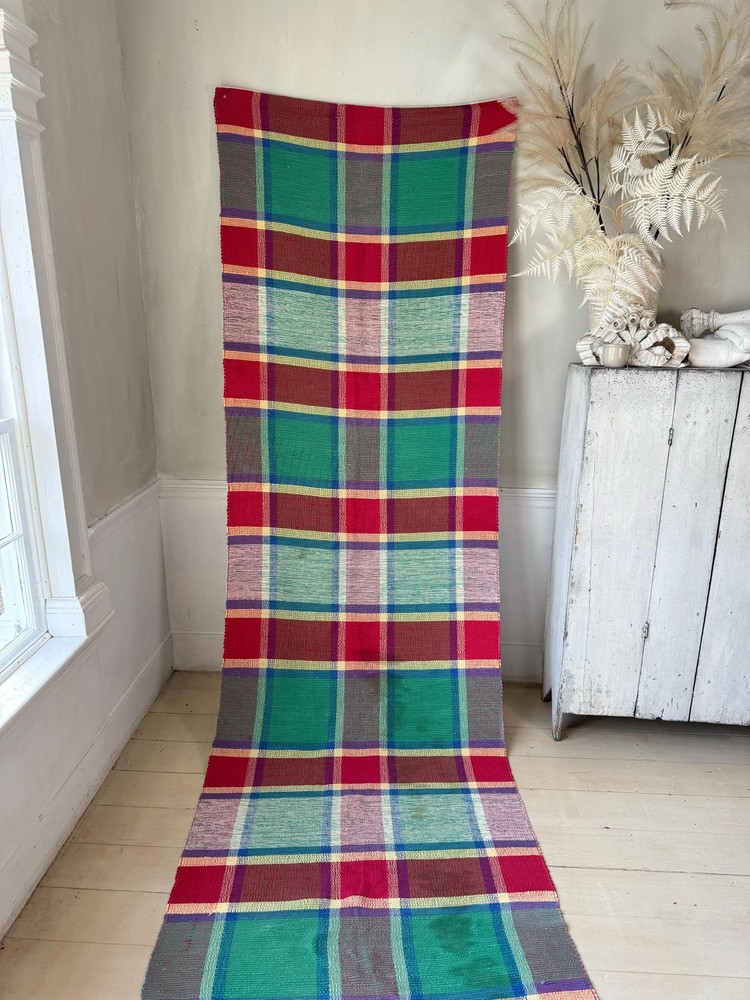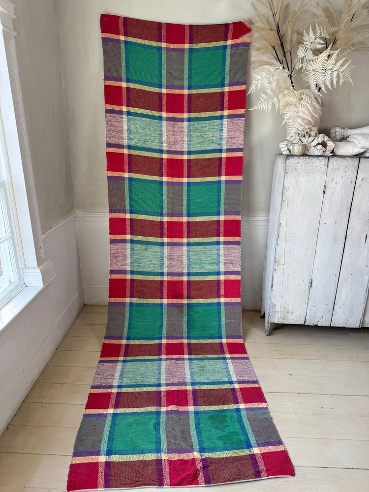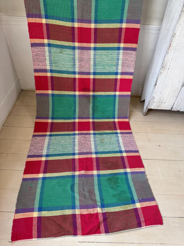 Welcome To The Textile Trunk ~ please follow us on Instagram , we are @textiletrunk ~ ~*~ I’m so excited to share this beautiful handwoven European rag rug! Each piece tells a unique story, woven from strips of leftover fabric, creating a stunning array of colors and textures. Rag rugs like these were cherished household items, made to be both practical and beautiful, offering warmth and personality to any space. Rag rugs have a long history in European homes, particularly in rural areas where resourcefulness was essential. These rugs were traditionally made using remnants of old clothing or fabric scraps, repurposed into durable and decorative floor coverings. Each rug reflects the creativity and skill of its maker, with patterns that vary from simple stripes to intricate designs. This tradition of upcycling materials speaks to the timeless appeal of sustainability, a value we hold dear today! This charming rug would be perfect for a farmhouse, cottagecore, or rustic interior, adding a touch of history and warmth to your space. Use it as a runner, accent rug, or wall hanging—it’s as versatile as it is lovely! Not only do I feel so lucky to share these amazing works of art for use in our homes today, but this also supports eco-friendly practices by giving old materials a new life through upcycling and creative reuse! MEASUREMENTS Approximately 3.4 yards long by 36 inches wide ! Super wide for these beauties!~ CONDITION This textile is in as found, not freshly laundered condition. There are some marks in the bottom half, please use the zoom feature to see them exactly. I've reduced the price of this bolt because I'm not sure that they will clean or not !~It will certainly get lighter with cleaning but may not disappear Otherwise Lovely with only light signs of time and use. This textile can be dry cleaned, easier to take to have it cleaned as it's difficult to do in a home washing machine!~ This bolt has a seam around the middle around 3 yards ish!~ Inventory: RR641