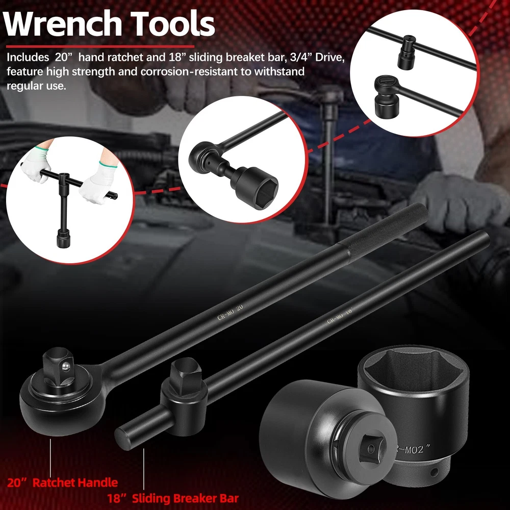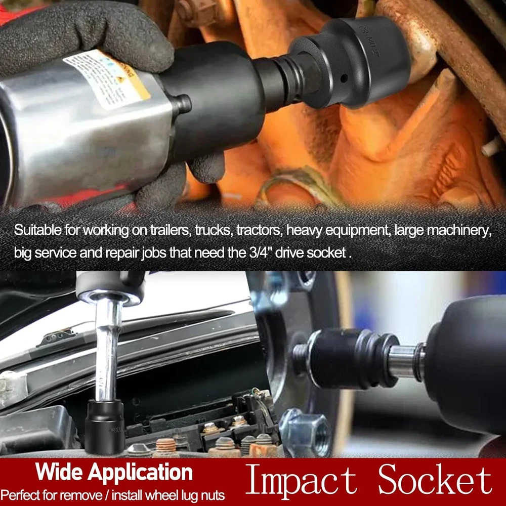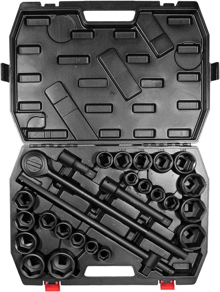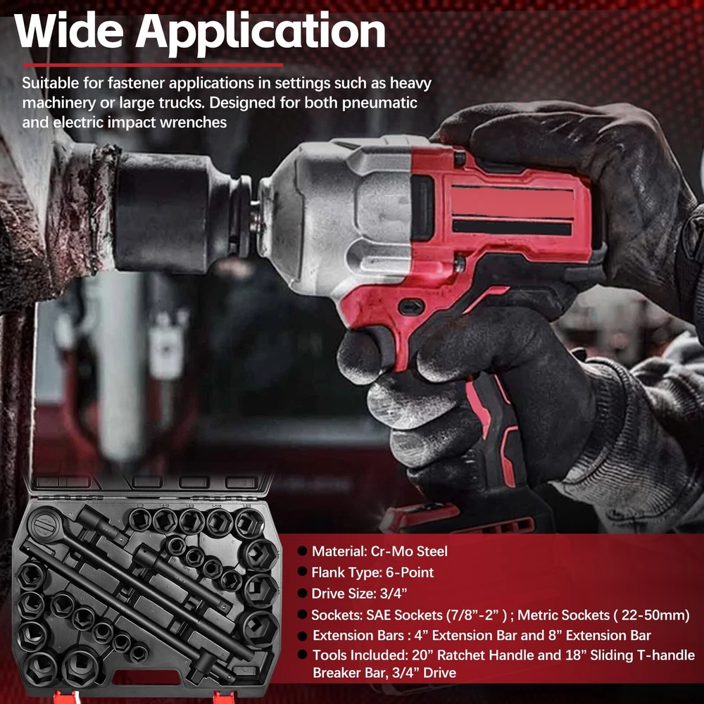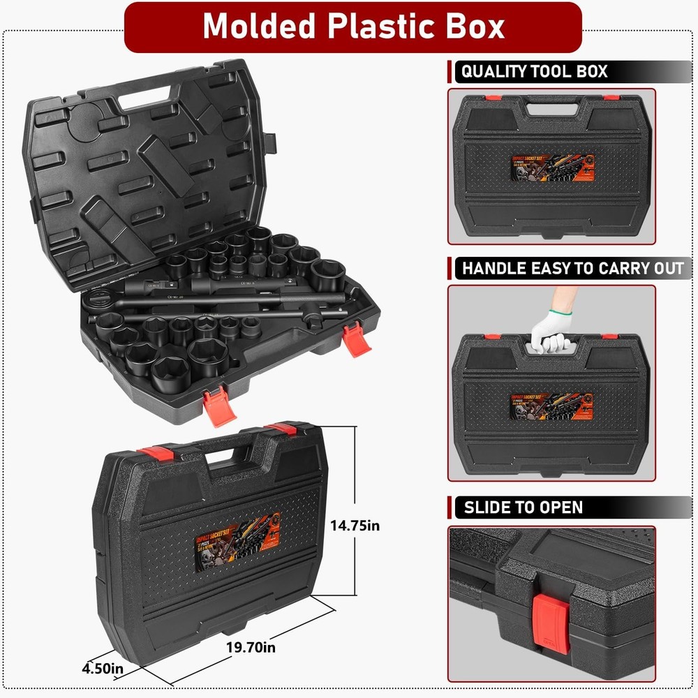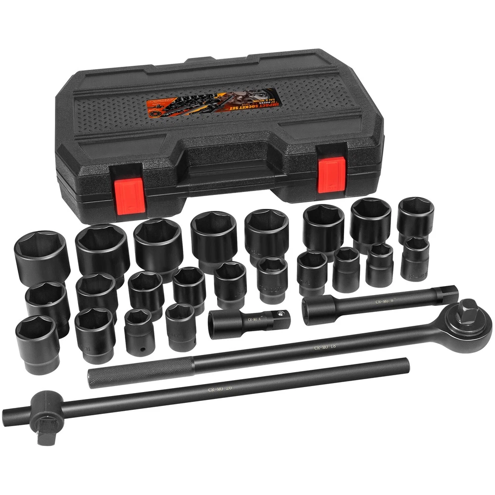 3/4-Inch Drive Jumbo Master Impact Socket Set, SAE & Metric Shallow-Socket Tool 3/4" Drive Impact Socket Set, 27-Piece Standard SAE (7/8" to 2") and Metric (22 to 50 mm) Size, 4" and 8" Extension Bar, 18" Sliding T Bar and Hand Ratchet Bar, CR-MO Shallow Socket 6 Point APPLICATION -- The 27 Pcs 3/4-Inch Drive SAE and Metric Impact Socket Set Suitable for working on trailers, trucks, tractors, heavy equipment and large machinery, big service and repair jobs that need the 3/4"-inch Drive Socket Set. FUNCTION -- This Impact Socket Set with adapters and ratchet handle is perfect for removing and installing wheel lug nuts, particularly suitable for most trucks, RVs, and other heavy-duty vehicles. Precisely machined impact socket set provides extreme levels of torque changes. 6-POINT SOCKET -- 6-point, high-torque design that contacts and grips the stronger flat sides of nut or bolt head, not the weaker corners, prevents any rounding off corners. This means your fasteners are protected and so are your sockets. FEATURES -- Standard Impact Sockets. Drive Size: 3/4", Measurement Standard: SAE and Metric, Flank Type: 6-Point, Color: Black. Package quantity: 27 Pieces TOP QUALITY -- Manufactured from heat-treated Chromium-vanadium steel CrV steel for superior performance. Long lasting durability heavy duty coating used on sockets to protect them from all the dirt, oil, and grease that could potentially break down the socket quality. Corrosion-resistant, wear-resistant, and rust-resistant. PACKAGE CONTENT -- 27 Pieces Impact Socket Set includes: 12 x standard SAE sockets: 7/8", 15/16", 1", 1 1/8", 1 3/16", 1 5/16", 1 3/8", 1 7/16", 1 5/8", 1 3/4", 1 7/8", and 2". 10 x Metric sockets: 22 mm, 24 mm, 27 mm, 30 mm, 32 mm, 36 mm, 38 mm, 41 mm, 46 mm, and 50 mm. 2 x Extension Bars (4" and 8"), 1 x 18-inch Sliding T Bar, 1 x 18-inch hand ratchet bar. 1 x Carrying Case. Payment Delivery details Terms of sales Contact us Payment Orders will be ship out within 1-3 business days after payment has cleared. Delivery details Orders from Saturdays, Sundays or holidays will process on next business day and will be ship within 24 hours. Some shipments could take longer subject to your local customs authorities. We only ship to confirmed ebay addresses. Your ebay address MUST MATCH your Shipping address Terms of sales We accept 60 days return guarantee for all Items If you are unsatisfied with something you bought from us, you may send it back within 60 days of receipt, and we shall be happy to exchange or refund. Contact us If you have any question, please email contact me, we can solve all the problem. Brand Unbranded Type 3/4" Drive Impact Socket Set Manufacturer Part Number 02499A Material Chrome Vanadium Steel OE/OEM Part Number 02499A Number in Pack 27 Set or Single Item Set Socket Type Impact Tools Included Extension, Ratchets, Sockets System of Measurement SAE, Metric Size See the detail Drive Type 6 Point Drive Size See the detail
