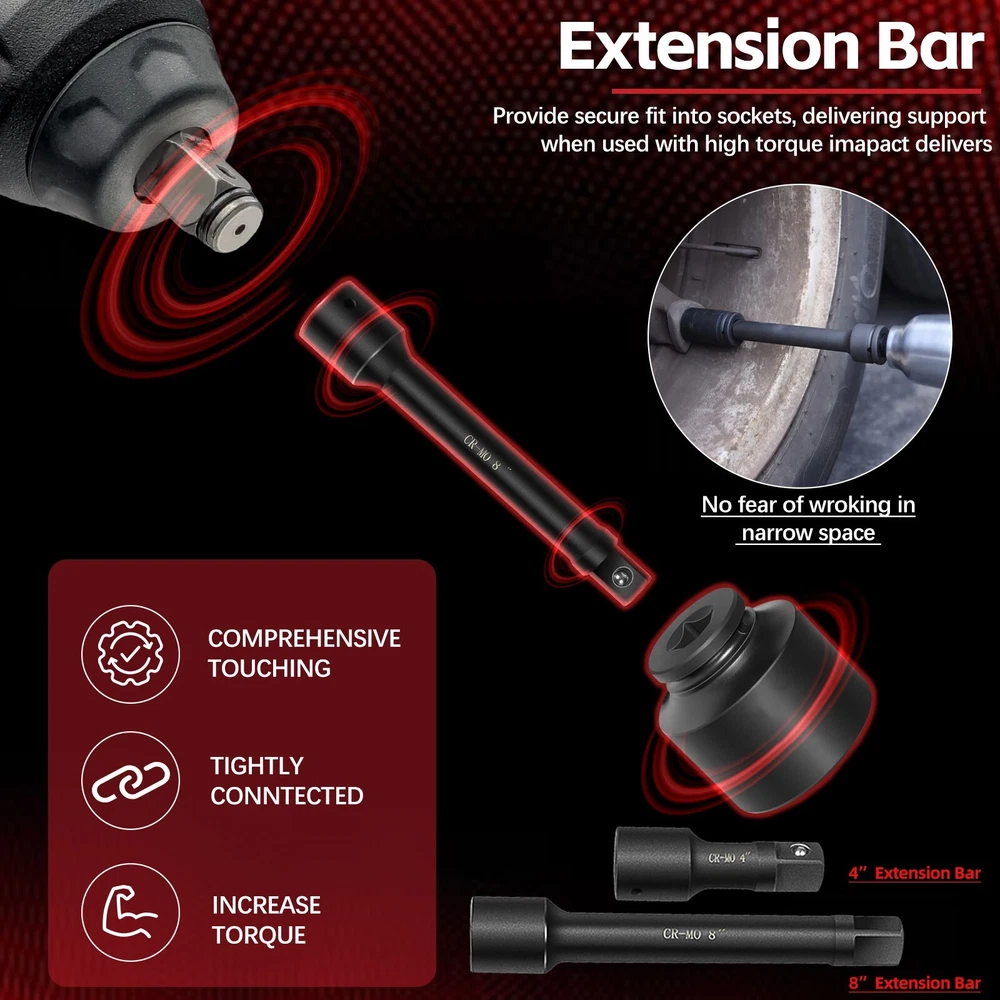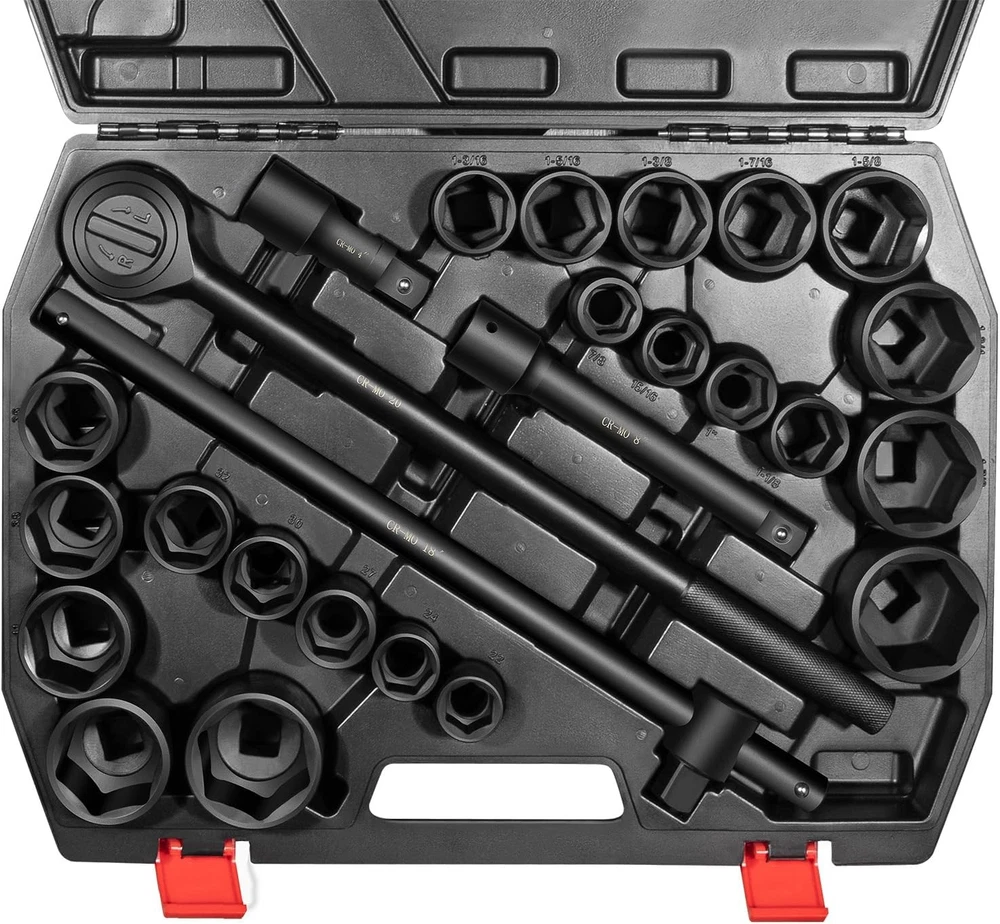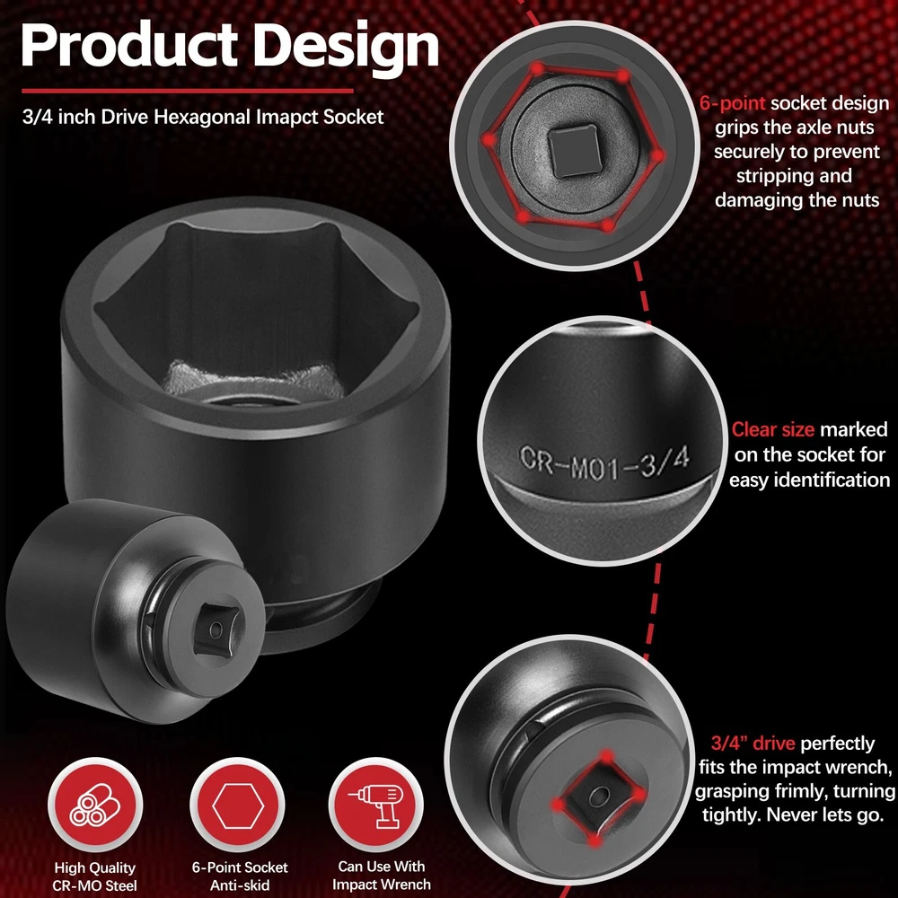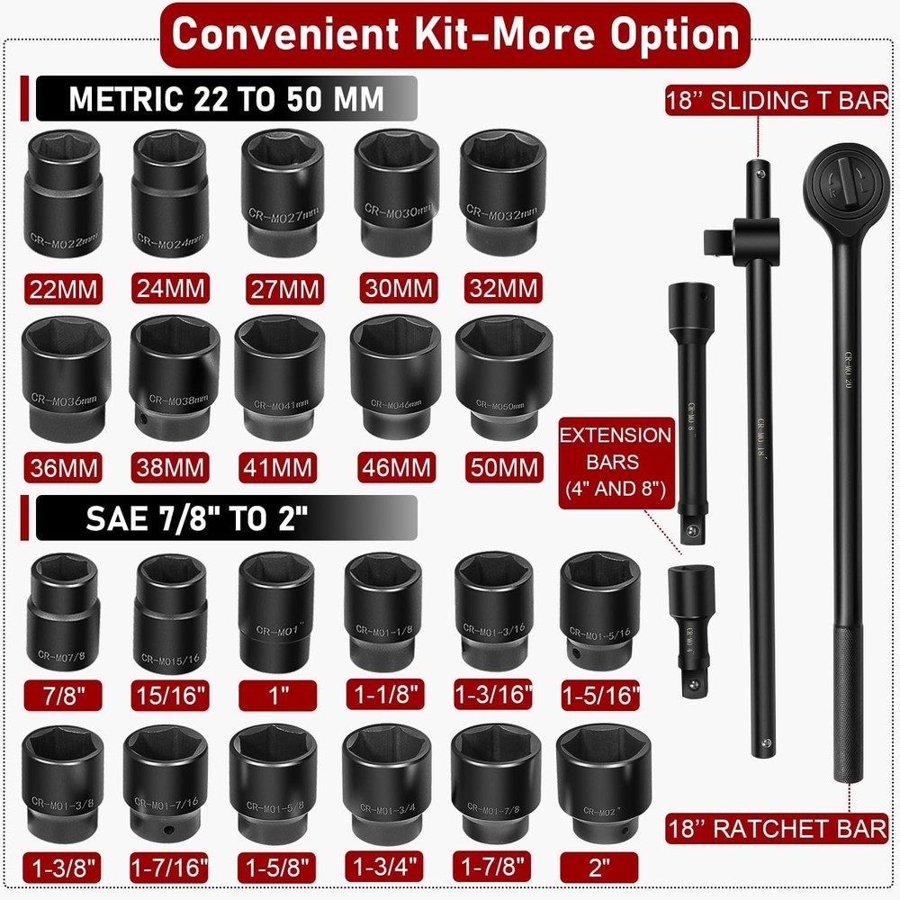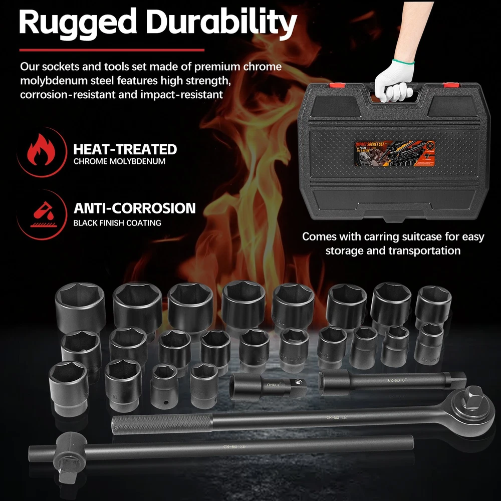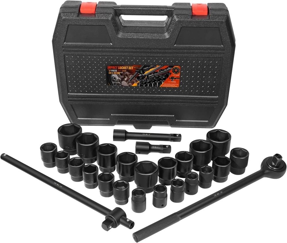 3/4-Inch Drive Jumbo Master Impact Socket Set, SAE & Metric Shallow-Socket Tool 3/4" Drive Impact Socket Set, 27-Piece Standard SAE (7/8" to 2") and Metric (22 to 50 mm) Size, 4" and 8" Extension Bar, 18" Sliding T Bar and Hand Ratchet Bar, CR-MO Shallow Socket 6 Point APPLICATION -- The 27 Pcs 3/4-Inch Drive SAE and Metric Impact Socket Set Suitable for working on trailers, trucks, tractors, heavy equipment and large machinery, big service and repair jobs that need the 3/4"-inch Drive Socket Set. FUNCTION -- This Impact Socket Set with adapters and ratchet handle is perfect for removing and installing wheel lug nuts, particularly suitable for most trucks, RVs, and other heavy-duty vehicles. Precisely machined impact socket set provides extreme levels of torque changes. 6-POINT SOCKET -- 6-point, high-torque design that contacts and grips the stronger flat sides of nut or bolt head, not the weaker corners, prevents any rounding off corners. This means your fasteners are protected and so are your sockets. FEATURES -- Standard Impact Sockets. Drive Size: 3/4", Measurement Standard: SAE and Metric, Flank Type: 6-Point, Color: Black. Package quantity: 27 Pieces TOP QUALITY -- Manufactured from heat-treated Chromium-vanadium steel CrV steel for superior performance. Long lasting durability heavy duty coating used on sockets to protect them from all the dirt, oil, and grease that could potentially break down the socket quality. Corrosion-resistant, wear-resistant, and rust-resistant. PACKAGE CONTENT -- 27 Pieces Impact Socket Set includes: 12 x standard SAE sockets: 7/8", 15/16", 1", 1 1/8", 1 3/16", 1 5/16", 1 3/8", 1 7/16", 1 5/8", 1 3/4", 1 7/8", and 2". 10 x Metric sockets: 22 mm, 24 mm, 27 mm, 30 mm, 32 mm, 36 mm, 38 mm, 41 mm, 46 mm, and 50 mm. 2 x Extension Bars (4" and 8"), 1 x 18-inch Sliding T Bar, 1 x 18-inch hand ratchet bar. 1 x Carrying Case. Payment Delivery details Terms of sales Contact us Payment Orders will be ship out within 1-3 business days after payment has cleared. Delivery details Orders from Saturdays, Sundays or holidays will process on next business day and will be ship within 24 hours. Some shipments could take longer subject to your local customs authorities. We only ship to confirmed ebay addresses. Your ebay address MUST MATCH your Shipping address Terms of sales We accept 60 days return guarantee for all Items If you are unsatisfied with something you bought from us, you may send it back within 60 days of receipt, and we shall be happy to exchange or refund. Contact us If you have any question, please email contact me, we can solve all the problem. Brand Unbranded Type 3/4" Drive Impact Socket Set Manufacturer Part Number 02499A Material Chrome Vanadium Steel OE/OEM Part Number 02499A Number in Pack 27 Set or Single Item Set Socket Type Impact Tools Included Extension, Ratchets, Sockets System of Measurement SAE, Metric Size See the detail Drive Type 6 Point Drive Size See the detail