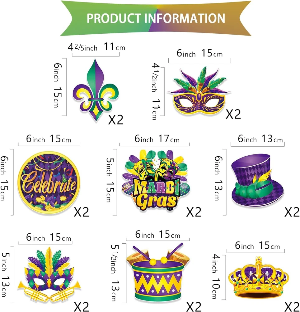 Cartoon Character: Mardi Gras Shape: Irregular shape Country of Origin: China Color: Green, Purple, Gold Item Weight: 3.84 ounces Included Components: Birthday Banner, Cutouts, Mardi Gras Decor Hanging Swirls Pattern: Mardi Gras Theme: Mardi Gras Type: Does not apply Brand: Does not apply Material: Cardstock, Paper Occasion: Birthday