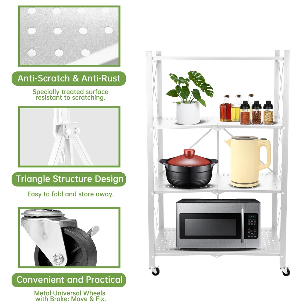 Store category Sign Up Now ! You may also like Product Description Bullet Points: Heavy Duty and Stable: Manufactured with quality materials and reinforced with sturdy joints, our foldable storage shelves can withstand heavy weights without shaking or wobbling Maximize Space Efficiency: Optimize storage space and turn narrow areas into spacious places with foldable storage shelves. Enjoy the charm of instantly doubling your storage space and make the most of every inch to keep your belongings organized Excellent Craftsmanship: Built with thickened material and a special baking process that produces scratch and rust-resistant panels, our foldable storage shelves showcase exquisite craftsmanship that won't easily peel off. Enjoy long-lasting durability and excellent quality Designed with Wheels: Equipped with alloy swivel wheels, the Rolling Shelf can be easily moved and firmly fixed in place with its built-in braking function, ensuring its 360 rotated without damaging the floor or causing slips Extensive Application: Our foldable storage shelves are ideal for organizing all sorts of spaces, from cramped laundry rooms to cluttered garages and pantries. With sturdy metal construction, they're ideal for storing tools and large appliances, so you can clear out more room and get more done. Transform your small space into a storage haven with our portable shelf. Made of high-quality materials and coated with a special baking process for durability, this shelf features alloy swivel wheels for easy maneuverability. Perfect for pantries, turn any narrow area into a spacious place for belongings. Specifications: White folding model Number of layers: 4 layers Material: Carbon steel Total length including wheels: about 71cm/27.95 inches Total width including wheels: about 36cm/14.17 inches Total height including wheels: about 125cm/49.21 inches Shelf: about 69.5x31cm/27.36x12.2 inches Features: Can be folded at any time Packing List: 1* Rolling Utility Shelf Notes: 1. Due to different lighting and screen settings, the item color may be slightly different from the picture. 2. Due to different manual measurements, please allow a 1-2cm difference in size. Payment Delivery details Terms of sales About us Feedback & DSRs Payment Before you palce an order, please kindly make sure that you have a paypal account. We accept PAYPAL payment only. Payment should be completed within 2 days after auction closed, or unpaid dispute will be filed for an closing auction. An unpaid case will be filled after 4 days. Delivery details We ship to your eBay address. Each package will be shipped to US by UPS Regular Parcel with tracking number. Please check your shipping address carefully before checkout, it can't be changed if order completed. All items will be shipped within 1-2 business day upon receipt of payment.Orders placed on weekend will be shipped within 3 days. If you do not receive your item in 7-10 business days.please contact us immediately for further assistance. We will be responsible for any damages or losses incurred in the shipping process. About us We maintain high standards of excellence FIVE STAR and strive for 100% customer satisfaction! Positive Feedback is very important to us. We hope that you contact us immediately Before you give us neutral or negative feedback, so that we can satisfactorily address your concerns. We promise to offer the lowest price and high quality produce. Our working time: From Monday to Friday(9:30 am to 18:00pm), we don't working on holidays ,hope you can understand and know that , thank you. Please always talk to us via ebay Message. We appreciate your business and look forward to growing our e-Bay sales with satisfied customers. Feedback Contact us If you have any questions, please feel free to contact with us by ebay Message during our business hours ( 9:30a.m. to 5:30 p.m.), or email us through eBay, we will try our best to help you to resolve it. For any presale or after-sale questions,please do feel free to email us! Due to the time difference, each email will be replied within 1 working day,and weekend will be delayed a bit. Feedback