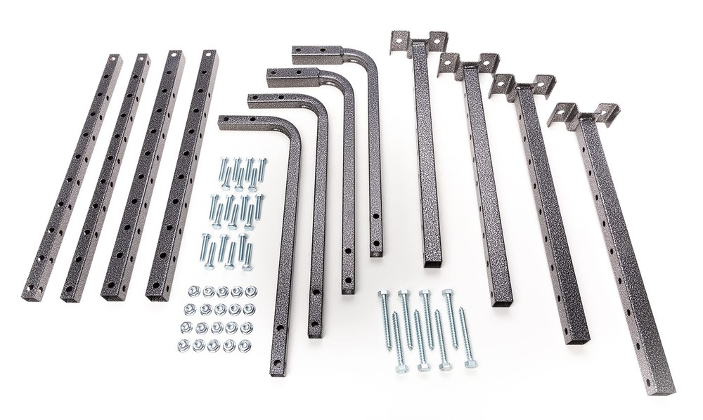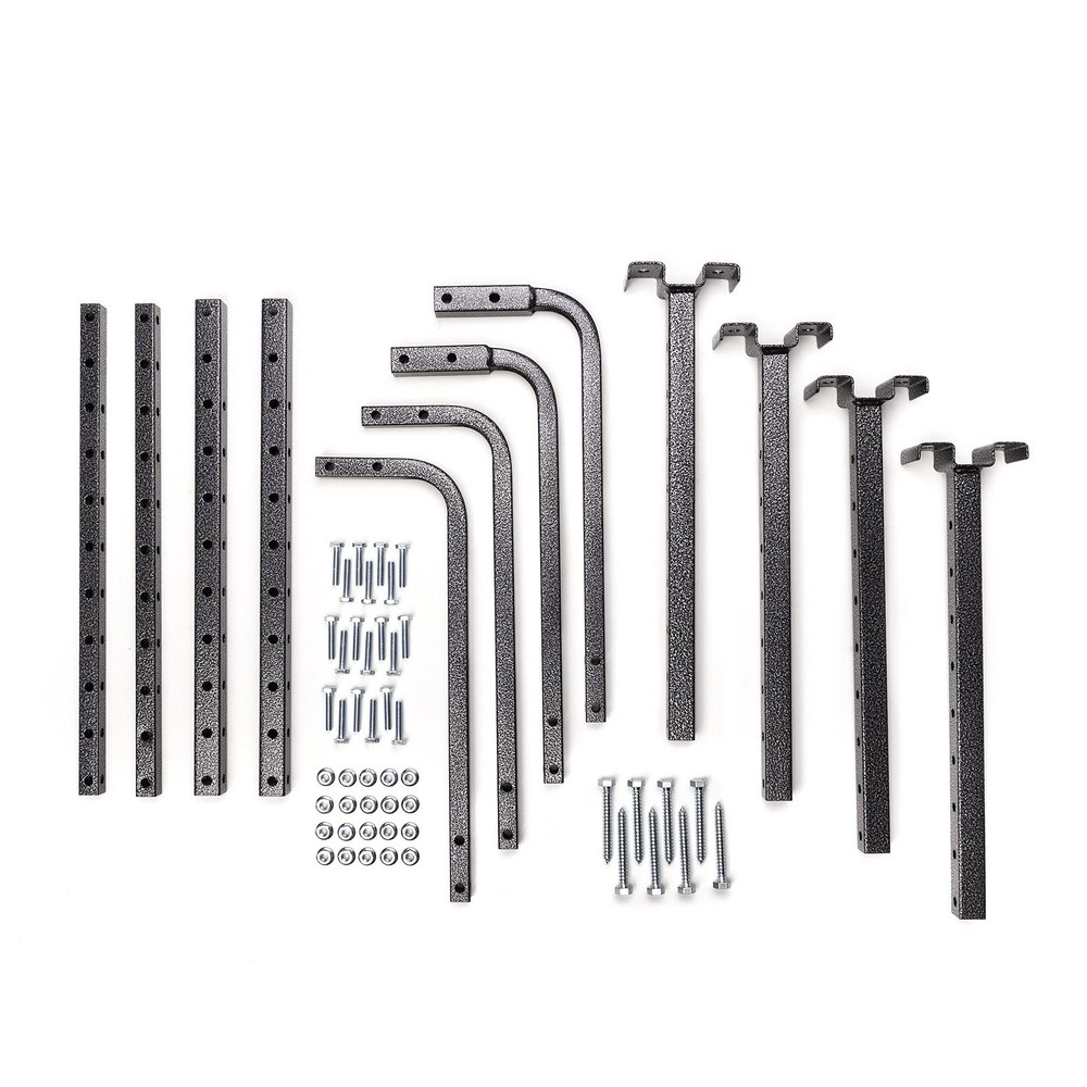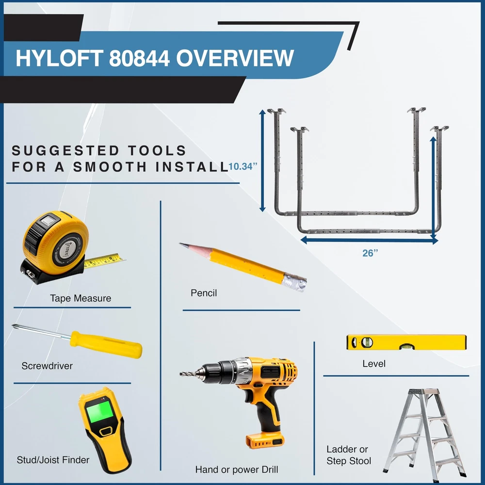 Maximize Garage Space Efficiently: Use this ceiling storage for garage to free up valuable floor space. Ideal for bins, luggage, and bulky items with over 30 cubic feet of storage capacity Durable Hanging Garage Storage Rack: This compact adjustable hanging garage storage rack is built with heavy-duty, powder-coated steel, designed for durability and long-lasting performance Versatile Ceiling Storage Solution: Adjustable ceiling storage unit fits most joist configurations, with a height range from 17 to 26 inches, and width from 24 to 34 inches, making it adaptable to various garage setups Heavy-Duty Garage Storage Racks: Store up to 250 pounds of evenly distributed weight with these sturdy garage storage racks, perfect for ladders, kayaks, seasonal items, sports gear, and more Comprehensive Garage Organization System: Enhance your garage organization and storage with this easy-to-install garage shelving heavy duty system, featuring all necessary hardware for a hassle-free setup
