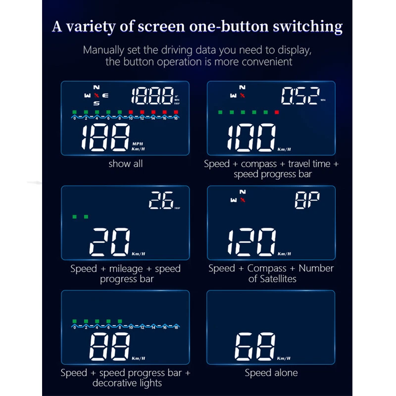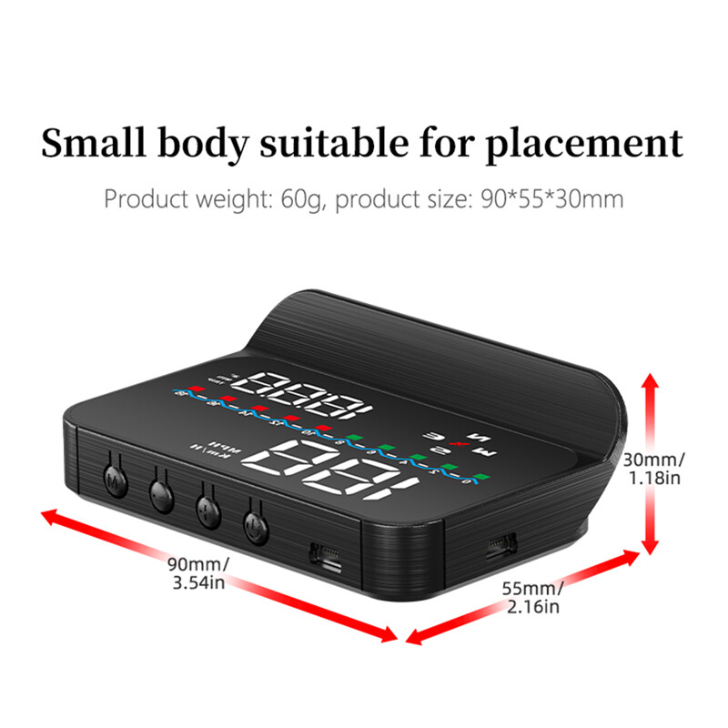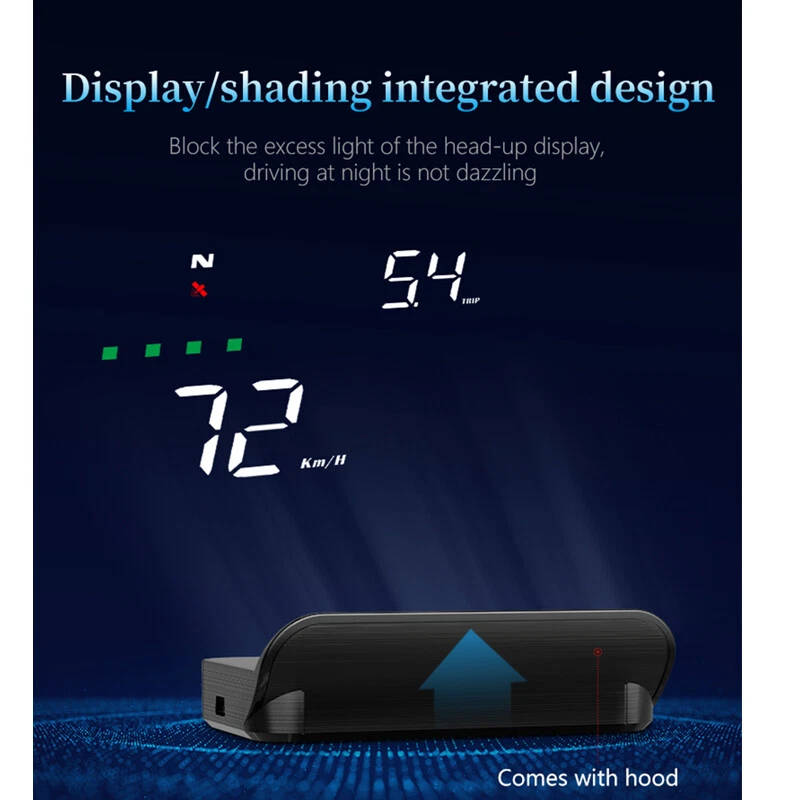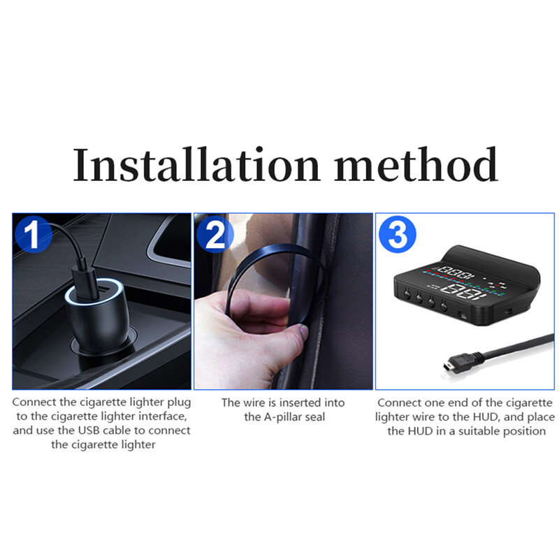 Description HUD Specifications: working voltage DC5V Working current 40mA sleeping current 15mA Speed range 0-400KM Real time precision The same as satellite Satellite positioning time Cold start: 30s, hot start: 1s HUD size 90*55*30mm 12V car charger 1000mA HUD weight 160g HUD Main Functions&Features: Available for any car, easy to install, plug and play Screen 3.5 inch HD display Multi-color design makes the screen more abundant and easier to read Nano-technology to eliminate double reflections,more clear. Rich Contents: speed,compass, speed alarm,free switch between km and miles Auto power on/off: HUD start and off with vehicle started and shutdown, effective protection of the car battery;retaining the manual switch mode,more easy to control HUD. Automatic and manual brightness adjustment mode,driving without glare. Methods of pasting the film: Spray some water on the place that the film will be pasted on,and then use a dry cloth to clean it; Take off the back side(marked 1) of reflection film,then paste it to the window glass. After you have adjusted the location, you can use a scratch board or something else flat to slick the film and squeeze the water inside out until there is no bubble or water in it. Take off the protection film (marked 2) of the reflection film. If the film cannot display the whole information, please adjust the non-slip mat to move the position. Solution for Common Problems Feature: HUD screen without any display,and no power Check the car charger cable if it is tight, pull down repeatedly inserted multiple times, check the HUD switch if it powers on. If there still no display please try another car to test and analyze whether the car cigarette lighter interface is bad, if it is a bad cigarette lighter, please try to connect the cable line to the car battery. No speed ,auto powers off after 5 minutes. The default auto powers off time is 5 minutes, if there is no speed, HUD will power off after 5 minutes,it built-in vibration switch, as long as there is a slight vibration it will powers on. Inaccurate Speed When HUD is power on,vertical press the wave button 5 seconds to enter into the menu options, here menu options shows 0,parameter shows 107,up or down the wave button to increase or decrease the value according to the difference until it shows correct one.After adjustment, vertical press in 5 seconds to save it. HUD see not clearly under the sunlight. Check whether the HUD host protective film is torn,and please stick the reflection film on the windscreen. wrong operation lead to crashes. Or inaccurate datas Do a reset setting. Package Included: 1 x HUD host 1 x charger 1 x non-slip pad 1 x reflective film 1 x manual