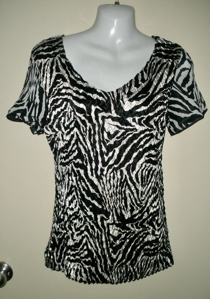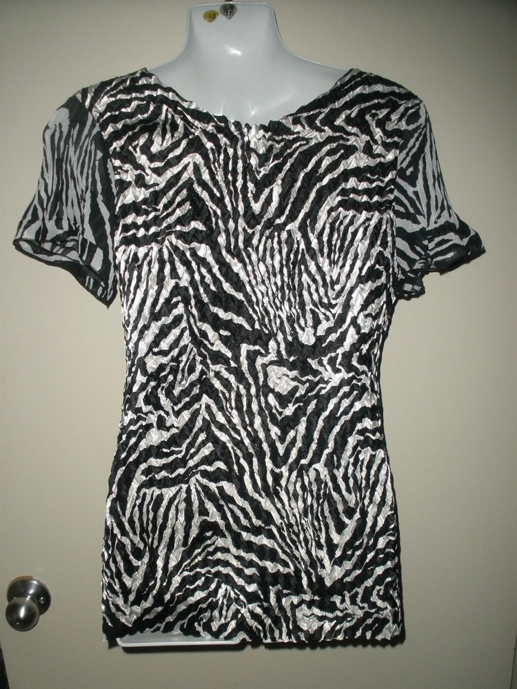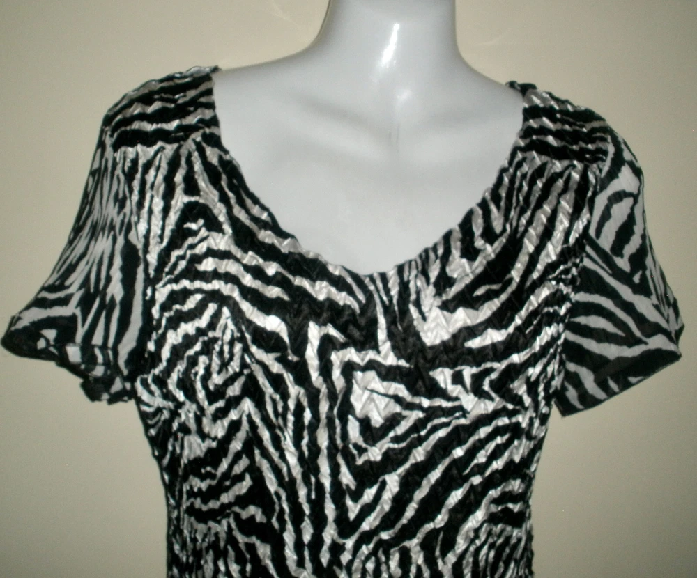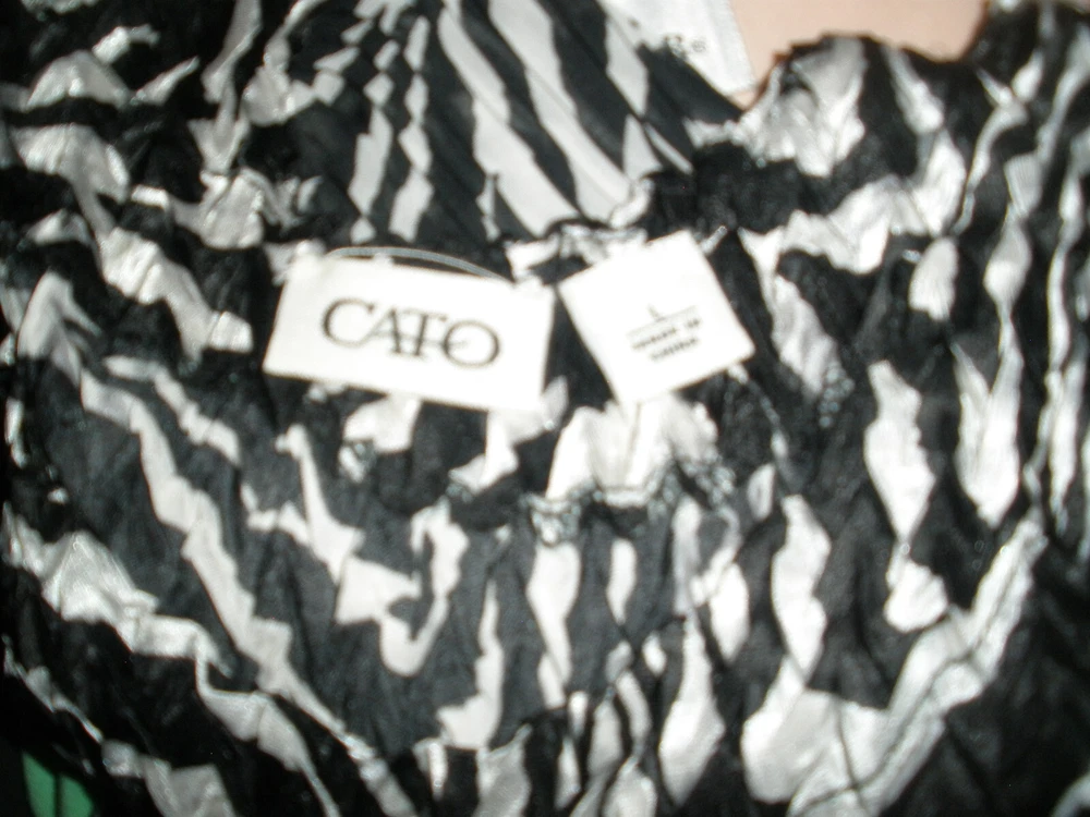 This is for Cato Blouse It is preowned, It has no rips, tears or stains. It is made of polyester The shirt is black and white. It has a zebra stripe pattern that is an all over design. IT has v neckline. It has crinkle pleat design that allows for lots of stretch. IT has shorter sleeves. It measures armpit to armpit laying flat is 17". It measures down the back 22". It is a size Large If you have any questions or problems - before or after. Please message me.