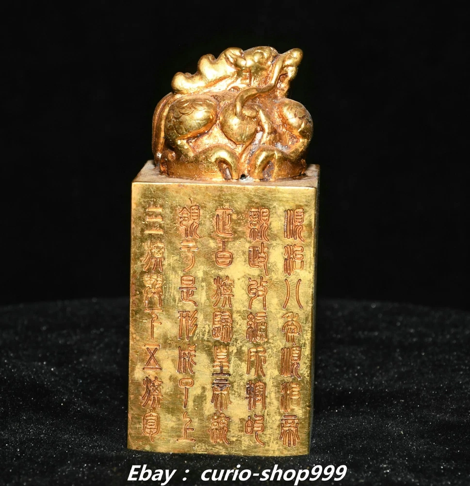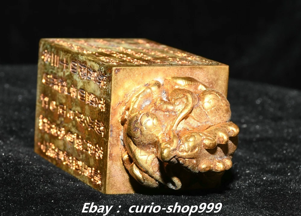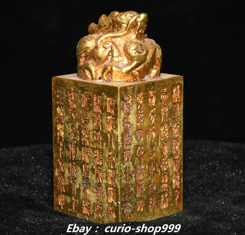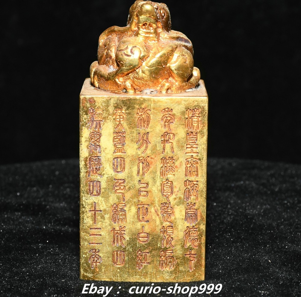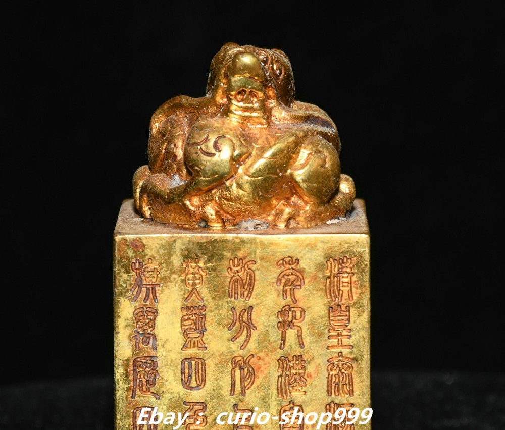 **** Welcome to our antique & Collectable Shop : Porcelain**** Description: Here is 3.5" China Dynasty Copper Gold Inscription Dragon Loong Beast Seal Stamp Signet . It is in good condition, and was created by skilled craftsmen in traditional style with fine handcrafts.This is a great piece of valuable collection, a valuable personal alter or a very good present. the handwork is very fine with incredible detailling. Don't miss out this chance to get it.Wish you good luck! . Material : Copper Gold Size : Heigh t 3.5 Long 1.6 B readth 1.6 (inch) Condition Perfect Condition. Perfect, with no scratches, flaws or repairs. Weight: 1.2 KG----included the weight of packing materials Shipping cost to all over the world countries in Free Honored Customers: We are selling the collectibles products and crafts in Beijing ,China since 1993 and collected them all over the world all the time . In our shop the bronze sculpture, animal, vase, urn, flowerpot,Incense Burner.Table chair sets. Militaria goods. buddha statues, Bodhisattva Statues, Buddhist Ritual Items etc is our speciality .Many of the items we sell come from our own personal collection and have been in our family for a very long time .My great-grandfather was the first in this family to start collecting art & antiques when he still lived in San Xi and Tibet around 1922 ,some of the paintings he once collected can now be seen in museums around the globe.We won't make money from t he shipping cost, if you dislike the item when you receive it,we can refund all of your money to you within thirty days. Please confidence for bidding . We recommend the combine shipping and offer you an big price discount if you order more items together ! 2024.10.3 四 号