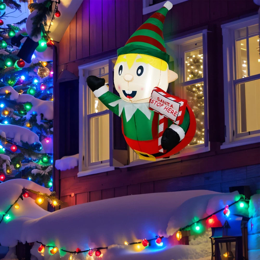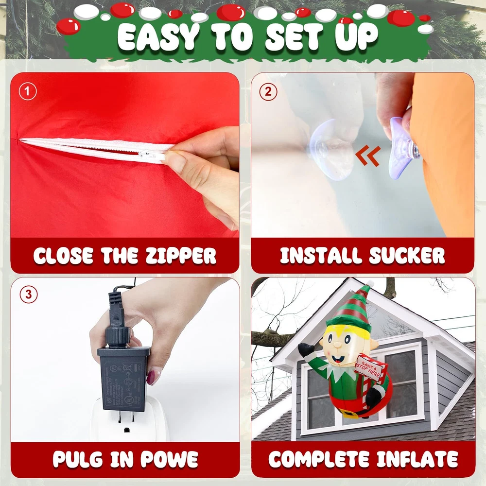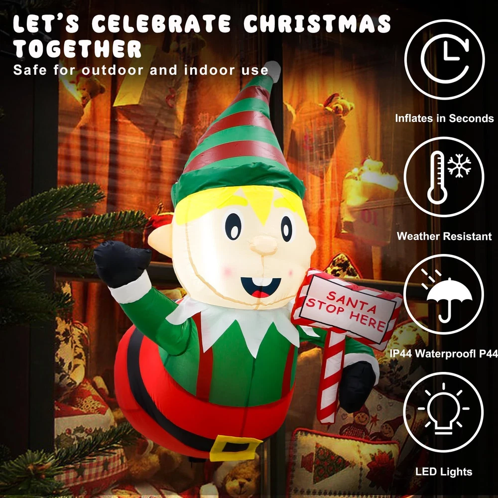 Eye-Catching Outdoor Decoration: The Christmas inflatable Elf is designed to look like they are poking out of a window, holding road signs that read "Santa Stopped Here", can attract the attention of Santa and invites him to come and give gifts and luck to the children. The vibrant colors and adorable design of the leprechaun instantly bring a festive and cheerful atmosphere to your yard or lawn. It's a fun and creative way to bring joy to all Super Bright LED Lights: The Christmas inflatables Decoration has 2 built-in LED lights, and the soft, warm light creates an inviting and festive atmosphere that will delight your family, friends, and neighbors. The energy-efficient LED lights ensure a long-lasting glow throughout the entire holiday season High-Quality Material: The Christmas outdoor inflatable is made of premium polyester which is weatherproof and fad-resistant, weighs, and has no smell. The funny Christmas inflatables elf comes with 3 suction cups for attaching it to windows. Securely hold the Christmas elf in your outdoor space even when it's windy or lightly snowing Easy Setup and Stored: Equipped with a powerful waterproof built-in fan and a Plug with UL Certification. Simply plug it in, and the elves with the guidepost Inflatable will be fully inflated in seconds. When deflated, easy and compact to without needing a lot of space Perfect for Various Occasions: The Christmas inflatable yard decorations are the builder of winter happiness, and the best model for Christmas indoor outdoor home lawn garden decorations, Christmas event decorations, Christmas night activities, party favors Christmas props, classroom decorations, and more