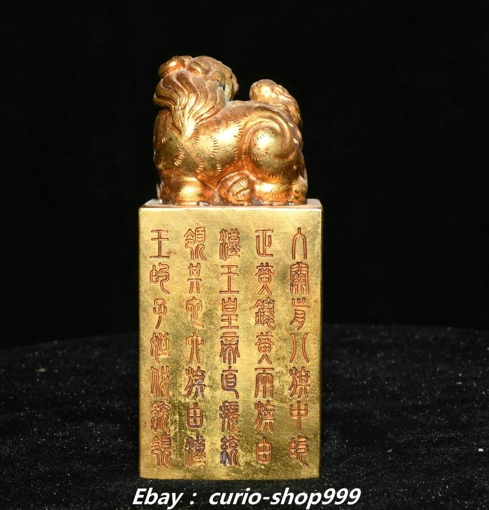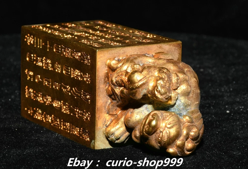 **** Welcome to our antique & Collectable Shop : Porcelain**** Description: Here is 3.5" China Dynasty Copper Gold Inscription Dragon Beast Pixiu Seal Stamp Signet . It is in good condition, and was created by skilled craftsmen in traditional style with fine handcrafts.This is a great piece of valuable collection, a valuable personal alter or a very good present. the handwork is very fine with incredible detailling. Don't miss out this chance to get it.Wish you good luck! . Material : Copper Gold Size : Heigh t 3.5 Long 1.6 B readth 1.6 (inch) Condition Perfect Condition. Perfect, with no scratches, flaws or repairs. Weight: 1.2 KG----included the weight of packing materials Shipping cost to all over the world countries in Free Honored Customers: We are selling the collectibles products and crafts in Beijing ,China since 1993 and collected them all over the world all the time . In our shop the bronze sculpture, animal, vase, urn, flowerpot,Incense Burner.Table chair sets. Militaria goods. buddha statues, Bodhisattva Statues, Buddhist Ritual Items etc is our speciality .Many of the items we sell come from our own personal collection and have been in our family for a very long time .My great-grandfather was the first in this family to start collecting art & antiques when he still lived in San Xi and Tibet around 1922 ,some of the paintings he once collected can now be seen in museums around the globe.We won't make money from t he shipping cost, if you dislike the item when you receive it,we can refund all of your money to you within thirty days. Please confidence for bidding . We recommend the combine shipping and offer you an big price discount if you order more items together ! 2024.10.3 四 号
