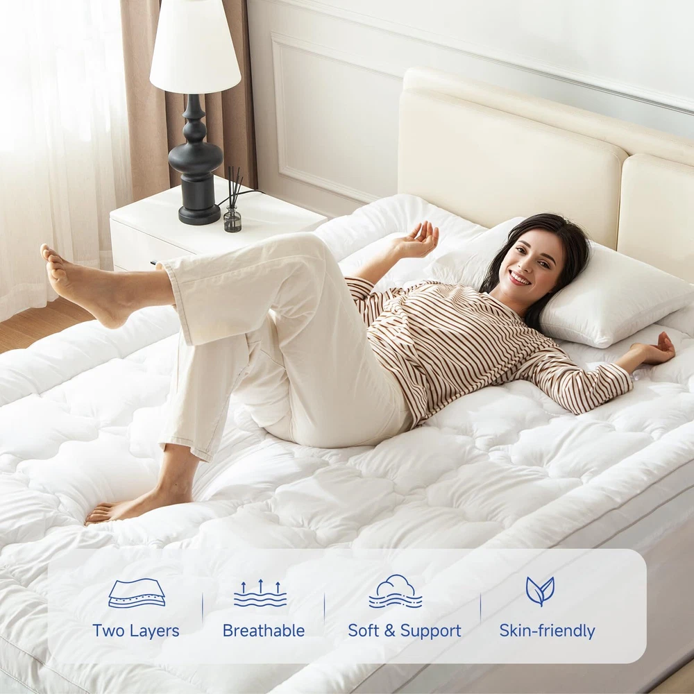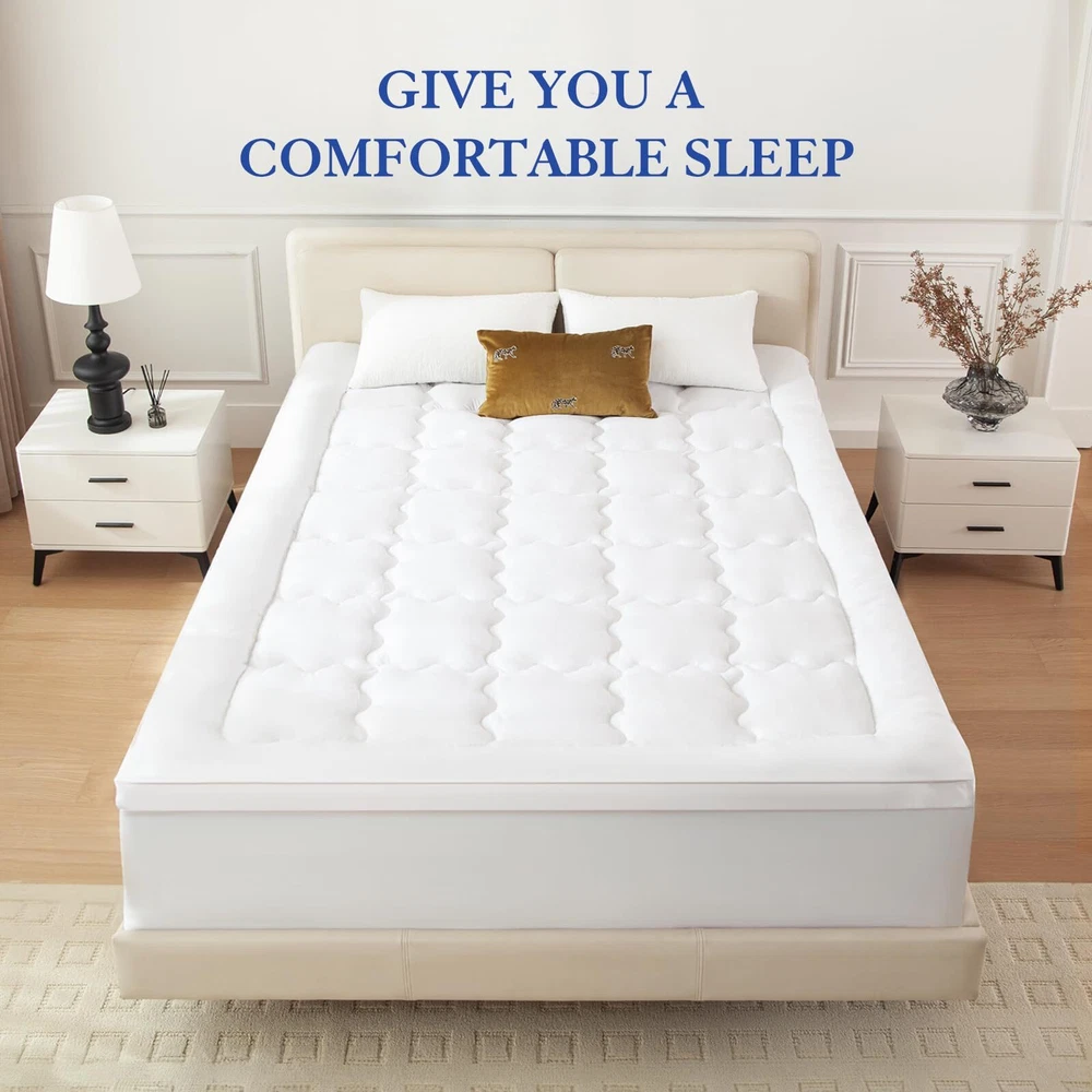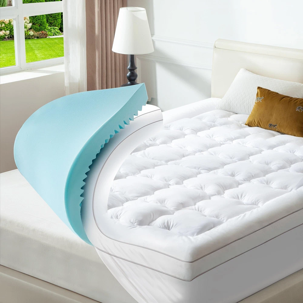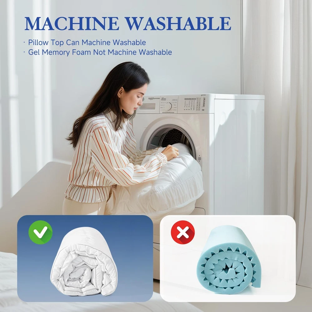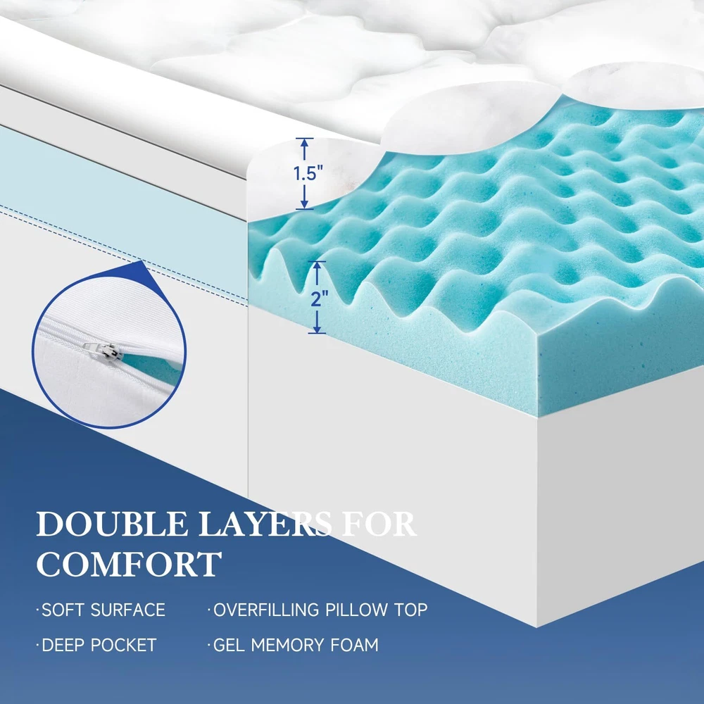 【2 In 1 Dual Layer Design】The dual layer mattress topper is 2 inches cooling gel egg crate memory foam plus 1.5 inches down alternative pillow top mattress pad. It can become a 3.5 inches thick mattress topper, which not only fluffiness and comfy, but also has strong support. It's like getting a new mattress, and multifunctional use, such as guest room, camping, RV, and futon mattress, et. 【Removable & Comfort Mattress Topper】This egg crate memory foam pad and pillow top mattress have a zipper in the middle that can be taken apart, and each can be used separately. The microfiber fabric quilted down alternative pillow top provides an extra of fluffy softness and makes it feel like you're sleeping on a cloud. It feels luxurious and pampering and you are like sleeping at the finest resort and spa, which provides you a very comfortable nights sleep. 【Cooling Gel & Support Memory Foam】We injected gel factor into the memory foam to take away excess heat, it does not make you hot at night. In addition, the cooling gel memory foam mattress topper conforms to the curve and shape of your body and made your body is well supported and cradled to added cushion. It's enough to make a real difference in the quality of your sleep, and sleeping longer. 【Easy Install & Machine Washable】The memory foam mattress topper features a 360°all-around elastic skirt and up to 18 inches deep pocket, which fits your bed perfectly and easy to install. The removable pillow top mattress topper can machine washable in cold water and also can be tumble dried on a low temperature. 【Package and Service】Due to vacuum packaging, it may look thinner after opening the package, please take it in a well-ventilated place 48-72 hours to completely fluff out and allow the smell of new foam to dissipate. If there are any problems about the mattress topper after arrival, please contact us and we will promptly reply and solve your problems!