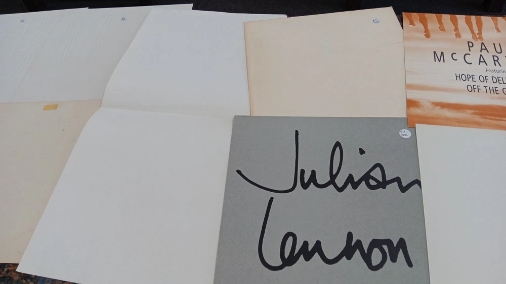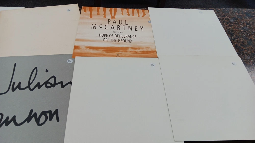 Lot of 35 album cover flats (not albums with records). Price sticker on back of flats. Some might be two sided. Please see all the pictures for condition, some might be wrinkled, have pin holes, edge wear, tape, were put on a wall, or have writing on them. Pictures of backs included. 35 flats in total. You will receive the flats pictured: 5 - George Harrison 1 - Paul McCartney 1 Beatles Rock n Roll 1 Beatles 1 Julian Lennon - Scret 1 Julian Lennon - Valotte 4 Led Zeppelin - Coda 1 Led Zeppelin - BBC Sesions 1 Deep Purple 2 Queen - Flash Gordon 1 Bob Dylan 2 The Police 1 Ironhorse 2 Billy Thorpe 2 Whitesnake 2 Utopia 2 Touch 2 Yes 1 Cats 1 Blue Brothers 1 Jackson Band - Beat Crazy