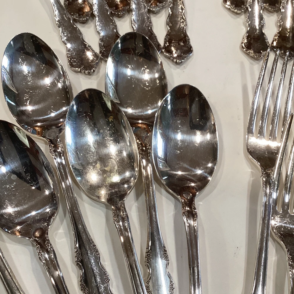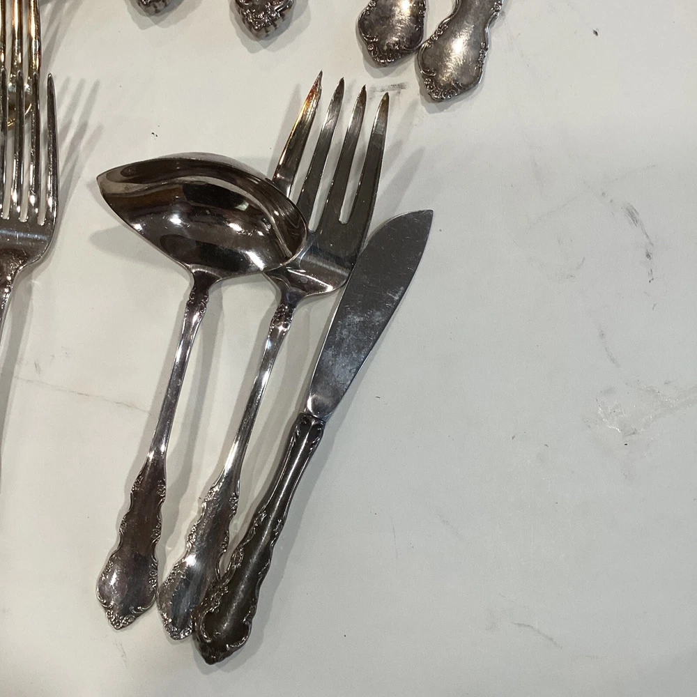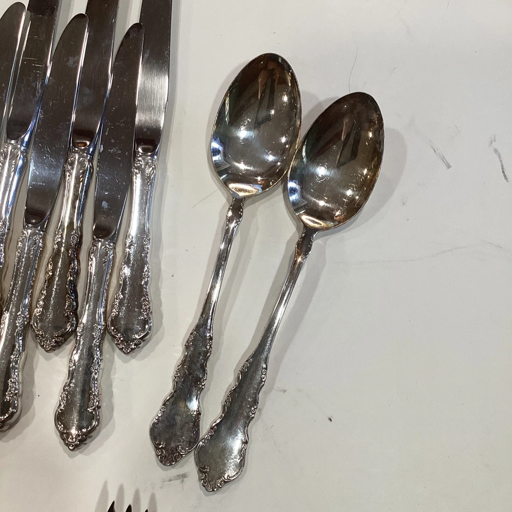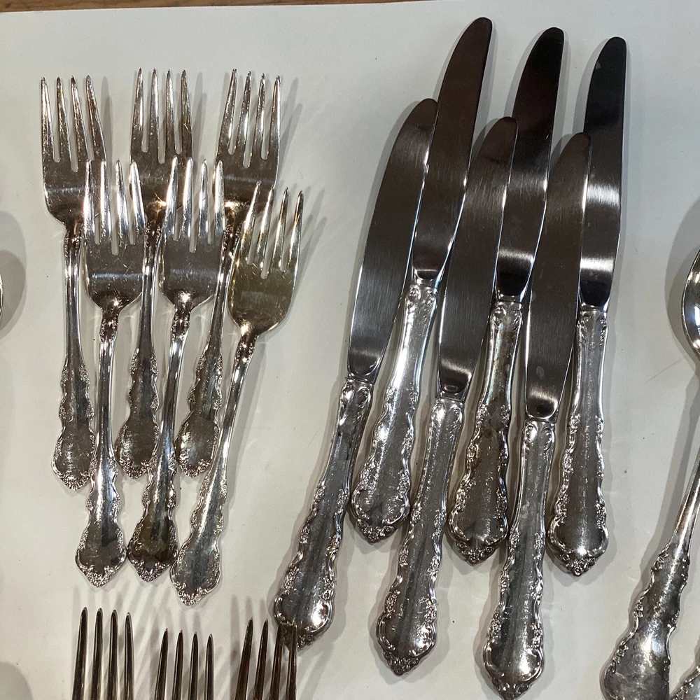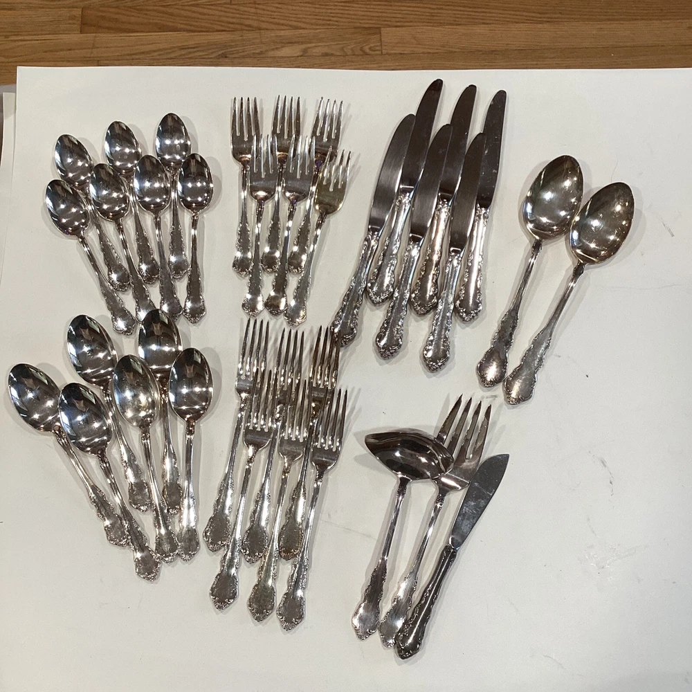 Set of 35 vintage from 1953 Reed & Barton Dresden Rose cutlery set These have minor discoloration they need to polished or cleaned. - 6 knifes - 7 small teaspoons - 6 spoons - 6 forks - 6 salad forks 1 ladle 2 serving spoons 1 serving fork 1 butter knife These need to be polished or cleaned Thank you for shopping send a offer