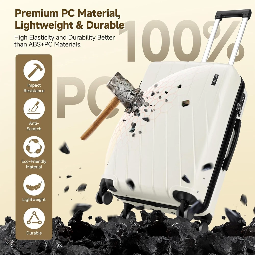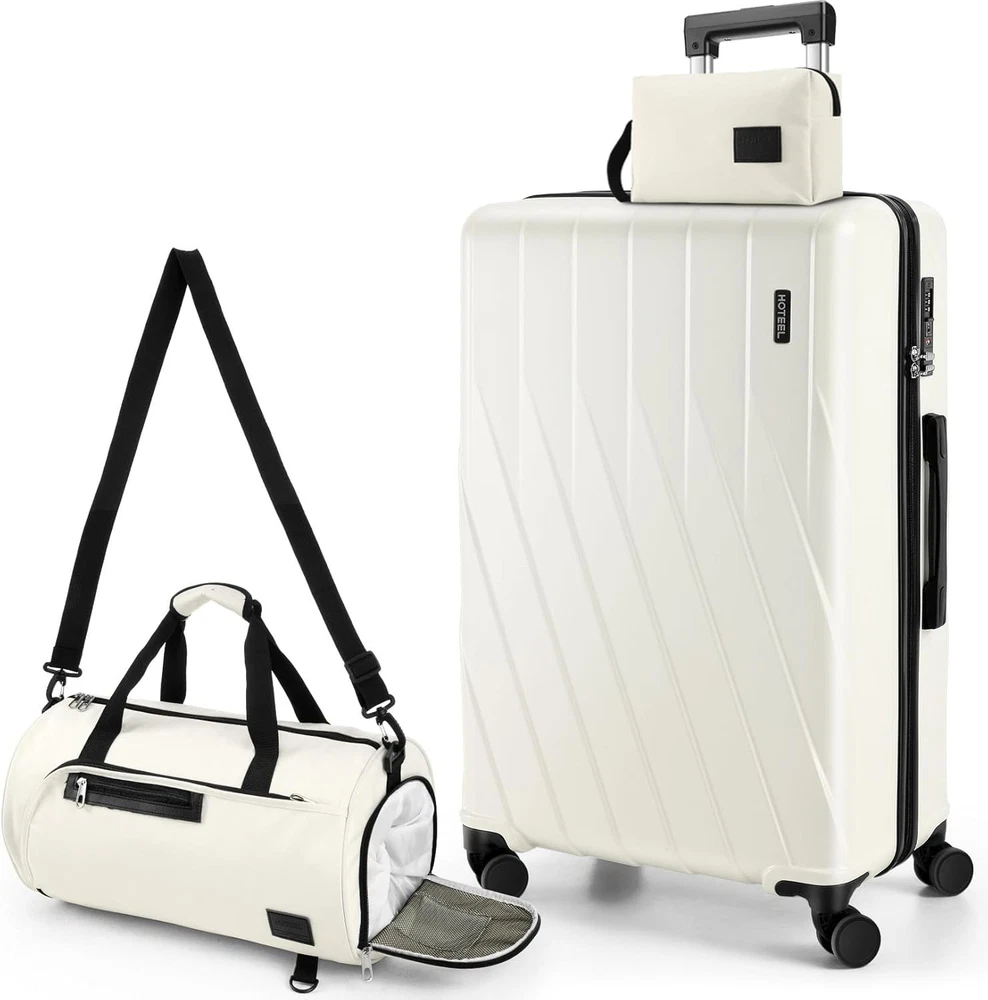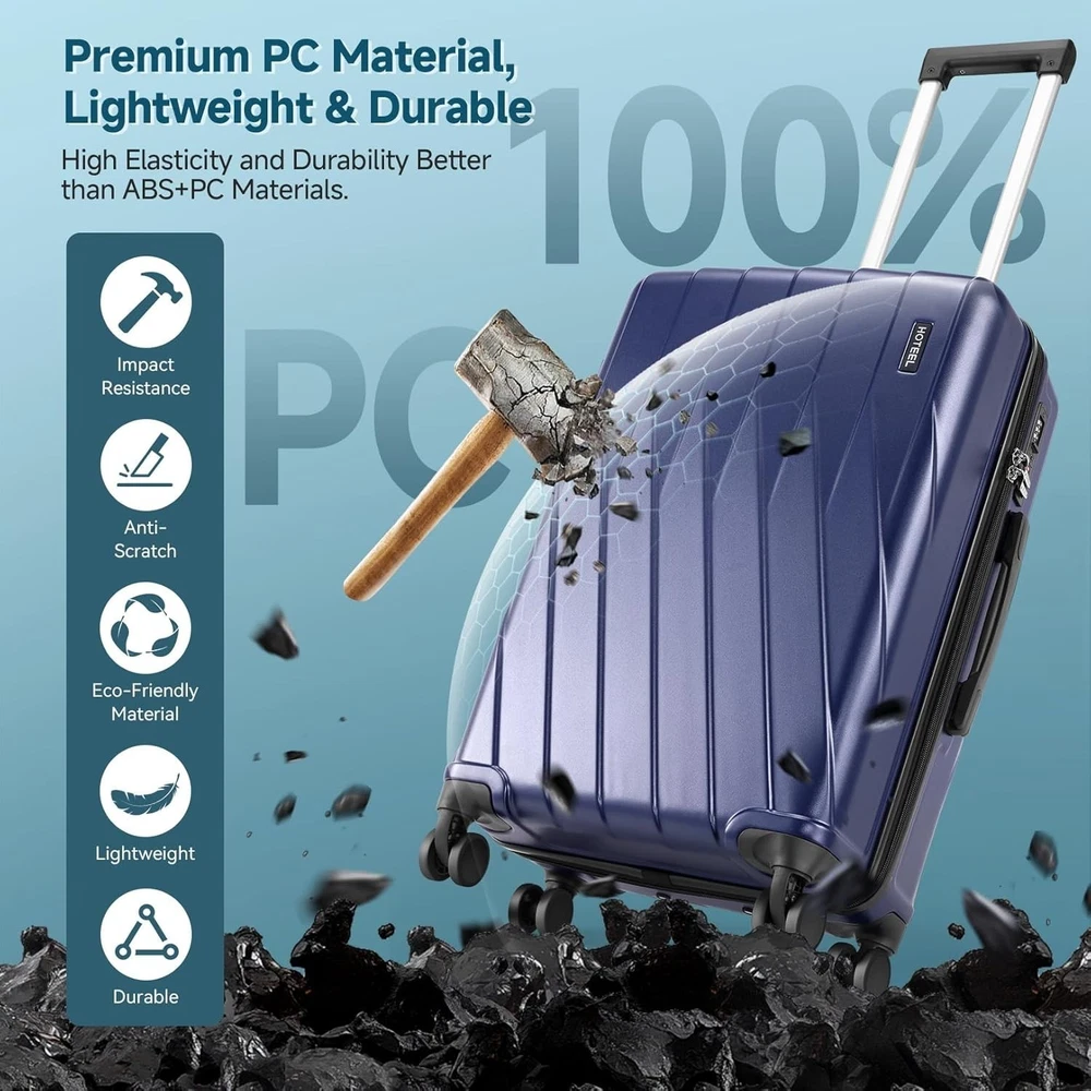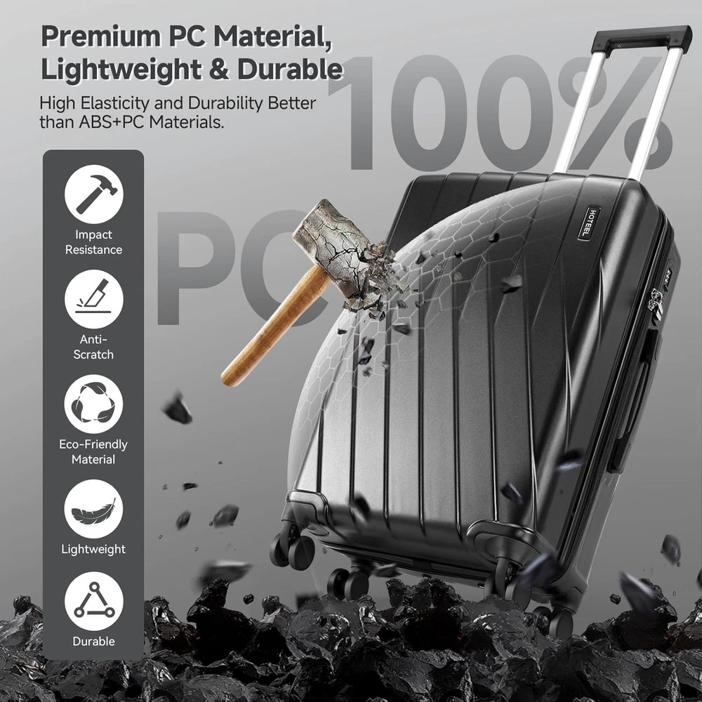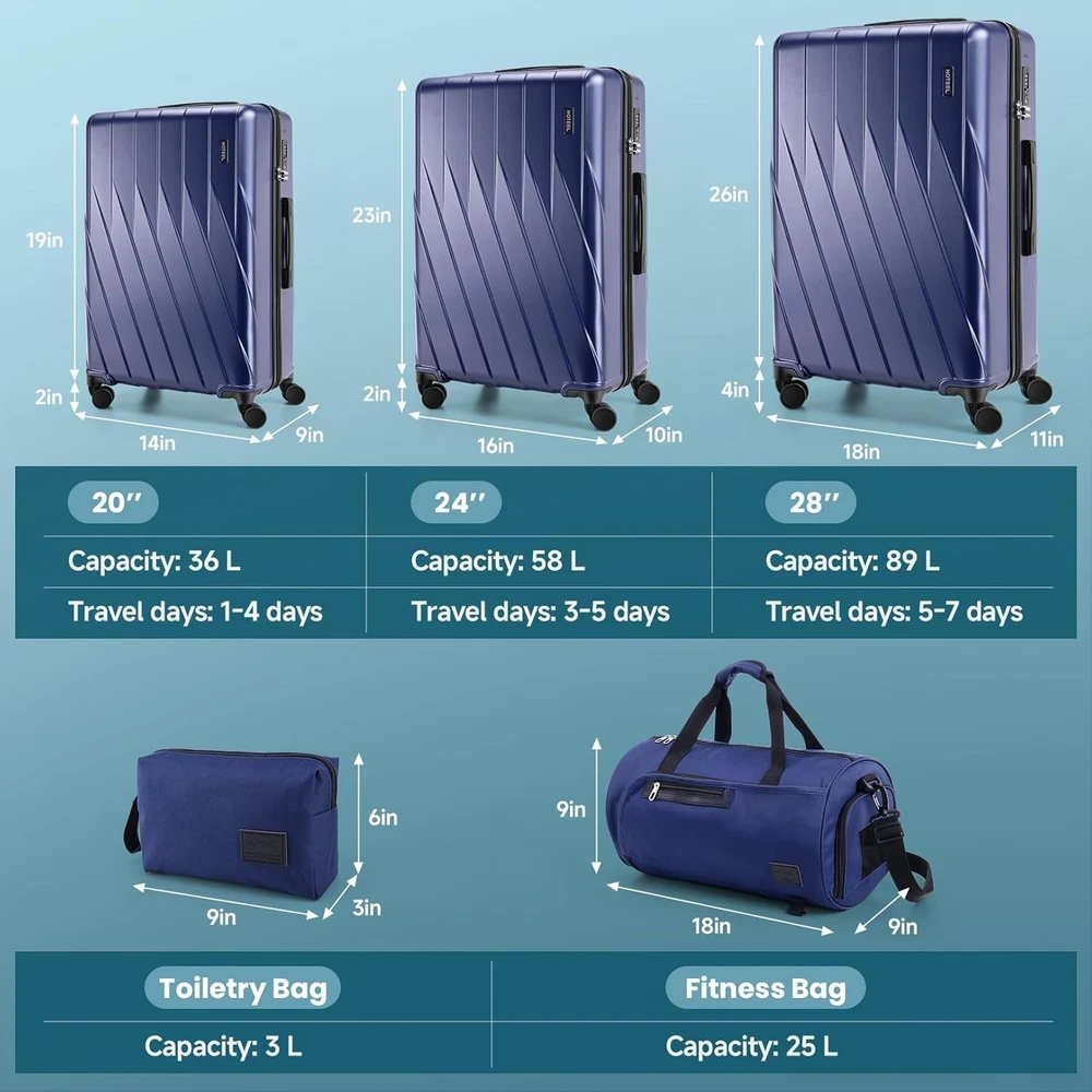Product description 【Premium 5-Piece Luggage Set & 4-Year Warranty Service】Hoteel 5 piece luggage set includes 20" carry on luggage, a 24'' checked suitcase, a 28'' large suitcase, multi-function fitness bag, and a toiletry bag. You can combine them freely to meet the needs of family or friends traveling and long-distance travel. ✔️Hoteel suitcase set includes 4-Year Limited Warranty and 90-day standard return period, and you can always contact us to replace any damaged parts, such as wheels, handles. Contact us on Amazon if you need help for your purchase. 【100%PC Extra Durable Suitcase】This Hoteel hardside luggage is made of high-quality 100%PC materials, which is known for its lightweight, high elasticity and durability, maintaining maximum reliability even under violent impacts and scratches, keeping your luggage looking good and long-lasting after your trip. Better than ABS+PC and ABS materials. The lightweight luggage is equipped with three-stage adjustable telescopic handle and top/side handles for comfortable use. 【Super Smooth Double-Wheel Spinner Wheel】The spinner wheels on this luggage sets feature a double-wheel structure, with a total of 8 wheels to help the hardshell suitcases move smoothly over various complex roads, allowing you to move freely even in crowded areas. Compared to single-wheel, double-wheel spinner wheel move more quietly, smoothly, and stably, and less likely to tip over when pushing or pulling. 【YKK Explosion-Proof Zipper & TSA lock】 The travel suitcases with wheels is equipped with YKK explosion-proof zippers, which have passed 3,000 durability tests and resistant to be punctured by sharp tools, effectively protecting your privacy and security. TSA-approved lock and fully-lined interior divider with organization pockets and waterproof compartment, ensuring that your belongings are safe and organized during your journey. 【Multifunctional Fitness Bag】The multifunctional fitness bag has hidden double straps at the bottom and a long shoulder strap, providing you with multiple ways to use it, such as a handbag, crossbody bag, or backpack. The side of the gym bag is equipped with a shoe bag and a large ventilated mesh window, and the back features a back sleeve so you can conveniently attach it to the retractable luggage handle.