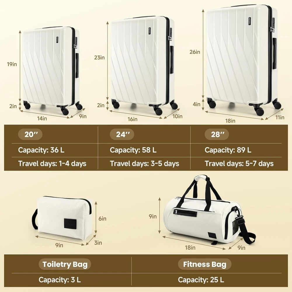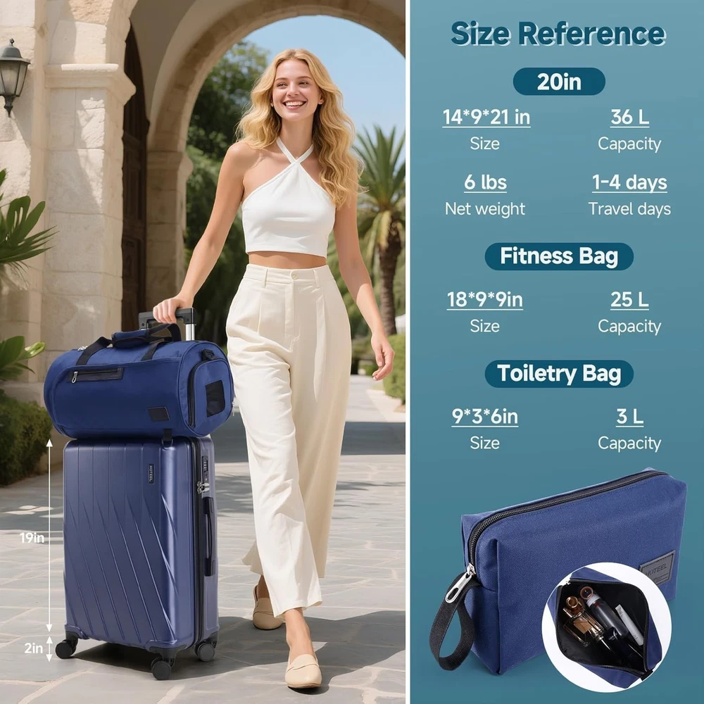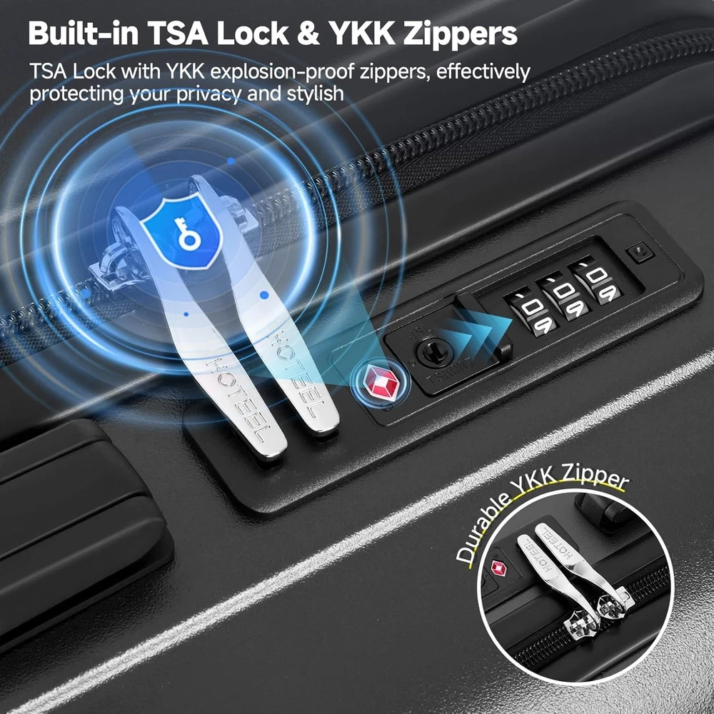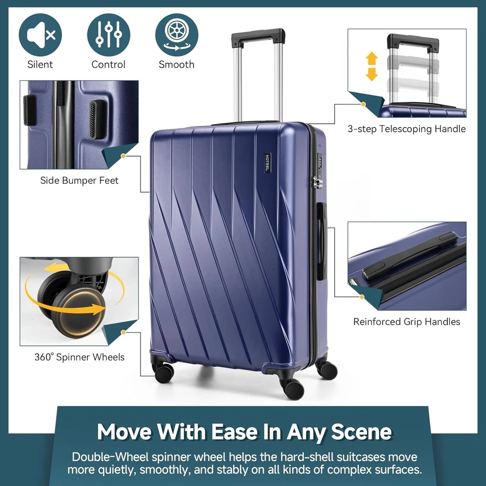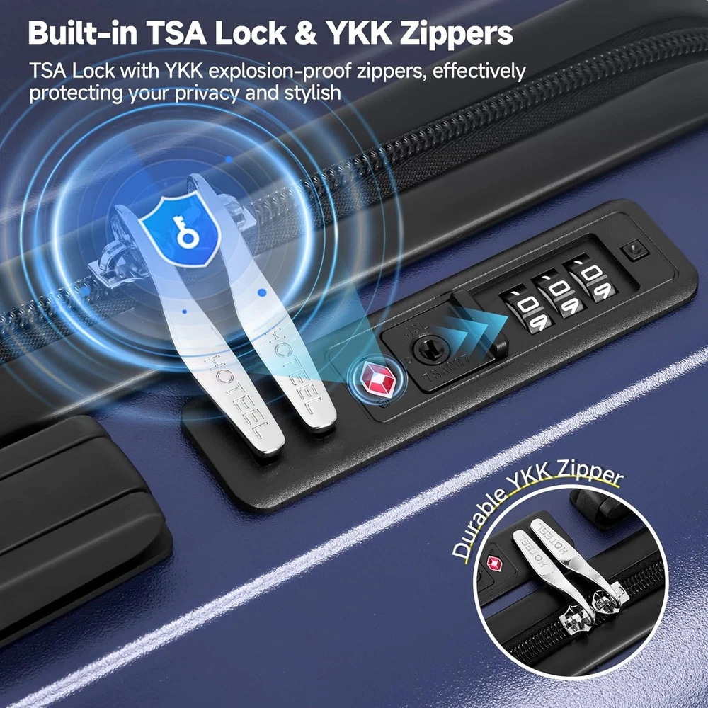 Product description 【Premium 5-Piece Luggage Set & 4-Year Warranty Service】Hoteel 5 piece luggage set includes 20" carry on luggage, a 24'' checked suitcase, a 28'' large suitcase, multi-function fitness bag, and a toiletry bag. You can combine them freely to meet the needs of family or friends traveling and long-distance travel. ✔️Hoteel suitcase set includes 4-Year Limited Warranty and 90-day standard return period, and you can always contact us to replace any damaged parts, such as wheels, handles. Contact us on Amazon if you need help for your purchase. 【100%PC Extra Durable Suitcase】This Hoteel hardside luggage is made of high-quality 100%PC materials, which is known for its lightweight, high elasticity and durability, maintaining maximum reliability even under violent impacts and scratches, keeping your luggage looking good and long-lasting after your trip. Better than ABS+PC and ABS materials. The lightweight luggage is equipped with three-stage adjustable telescopic handle and top/side handles for comfortable use. 【Super Smooth Double-Wheel Spinner Wheel】The spinner wheels on this luggage sets feature a double-wheel structure, with a total of 8 wheels to help the hardshell suitcases move smoothly over various complex roads, allowing you to move freely even in crowded areas. Compared to single-wheel, double-wheel spinner wheel move more quietly, smoothly, and stably, and less likely to tip over when pushing or pulling. 【YKK Explosion-Proof Zipper & TSA lock】 The travel suitcases with wheels is equipped with YKK explosion-proof zippers, which have passed 3,000 durability tests and resistant to be punctured by sharp tools, effectively protecting your privacy and security. TSA-approved lock and fully-lined interior divider with organization pockets and waterproof compartment, ensuring that your belongings are safe and organized during your journey. 【Multifunctional Fitness Bag】The multifunctional fitness bag has hidden double straps at the bottom and a long shoulder strap, providing you with multiple ways to use it, such as a handbag, crossbody bag, or backpack. The side of the gym bag is equipped with a shoe bag and a large ventilated mesh window, and the back features a back sleeve so you can conveniently attach it to the retractable luggage handle.