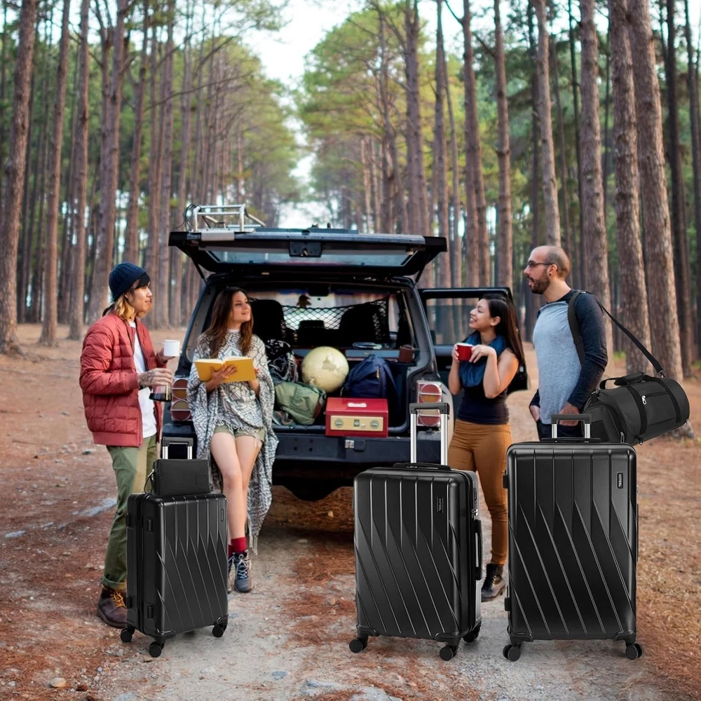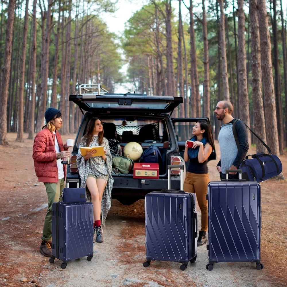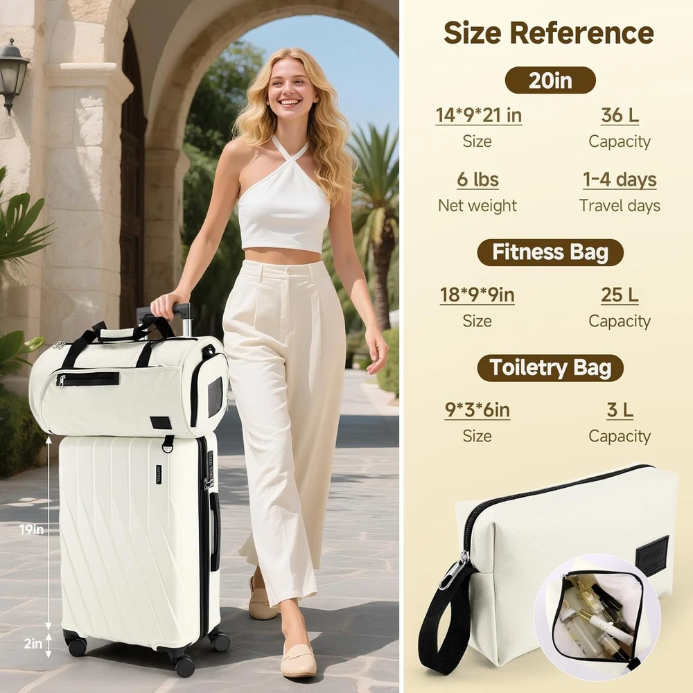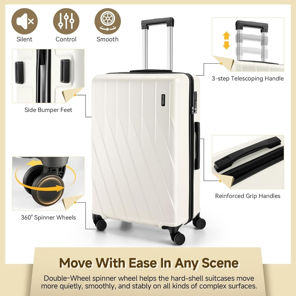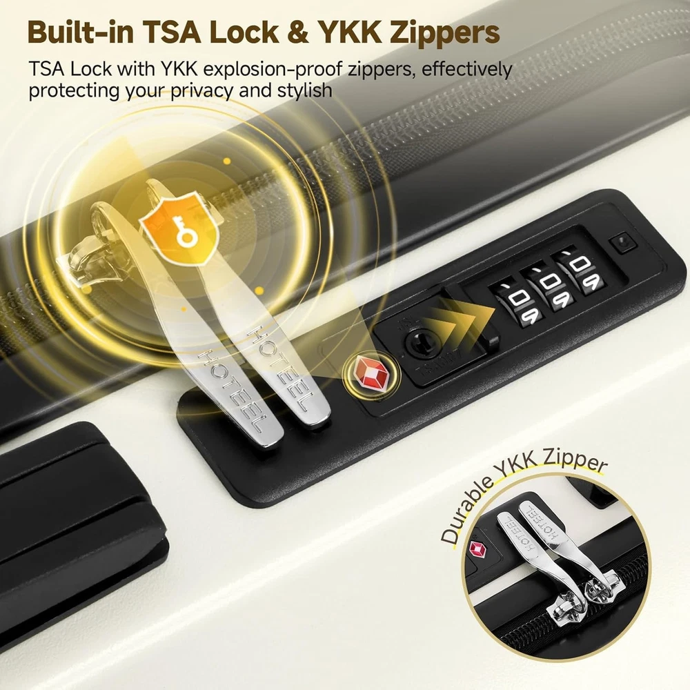 Product description 【Premium 5-Piece Luggage Set & 4-Year Warranty Service】Hoteel 5 piece luggage set includes 20" carry on luggage, a 24'' checked suitcase, a 28'' large suitcase, multi-function fitness bag, and a toiletry bag. You can combine them freely to meet the needs of family or friends traveling and long-distance travel. ✔️Hoteel suitcase set includes 4-Year Limited Warranty and 90-day standard return period, and you can always contact us to replace any damaged parts, such as wheels, handles. Contact us on Amazon if you need help for your purchase. 【100%PC Extra Durable Suitcase】This Hoteel hardside luggage is made of high-quality 100%PC materials, which is known for its lightweight, high elasticity and durability, maintaining maximum reliability even under violent impacts and scratches, keeping your luggage looking good and long-lasting after your trip. Better than ABS+PC and ABS materials. The lightweight luggage is equipped with three-stage adjustable telescopic handle and top/side handles for comfortable use. 【Super Smooth Double-Wheel Spinner Wheel】The spinner wheels on this luggage sets feature a double-wheel structure, with a total of 8 wheels to help the hardshell suitcases move smoothly over various complex roads, allowing you to move freely even in crowded areas. Compared to single-wheel, double-wheel spinner wheel move more quietly, smoothly, and stably, and less likely to tip over when pushing or pulling. 【YKK Explosion-Proof Zipper & TSA lock】 The travel suitcases with wheels is equipped with YKK explosion-proof zippers, which have passed 3,000 durability tests and resistant to be punctured by sharp tools, effectively protecting your privacy and security. TSA-approved lock and fully-lined interior divider with organization pockets and waterproof compartment, ensuring that your belongings are safe and organized during your journey. 【Multifunctional Fitness Bag】The multifunctional fitness bag has hidden double straps at the bottom and a long shoulder strap, providing you with multiple ways to use it, such as a handbag, crossbody bag, or backpack. The side of the gym bag is equipped with a shoe bag and a large ventilated mesh window, and the back features a back sleeve so you can conveniently attach it to the retractable luggage handle.