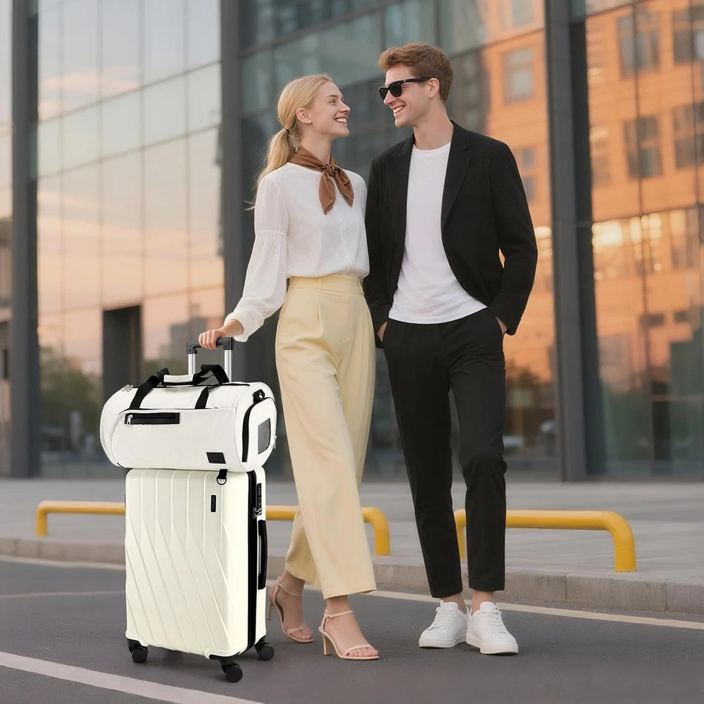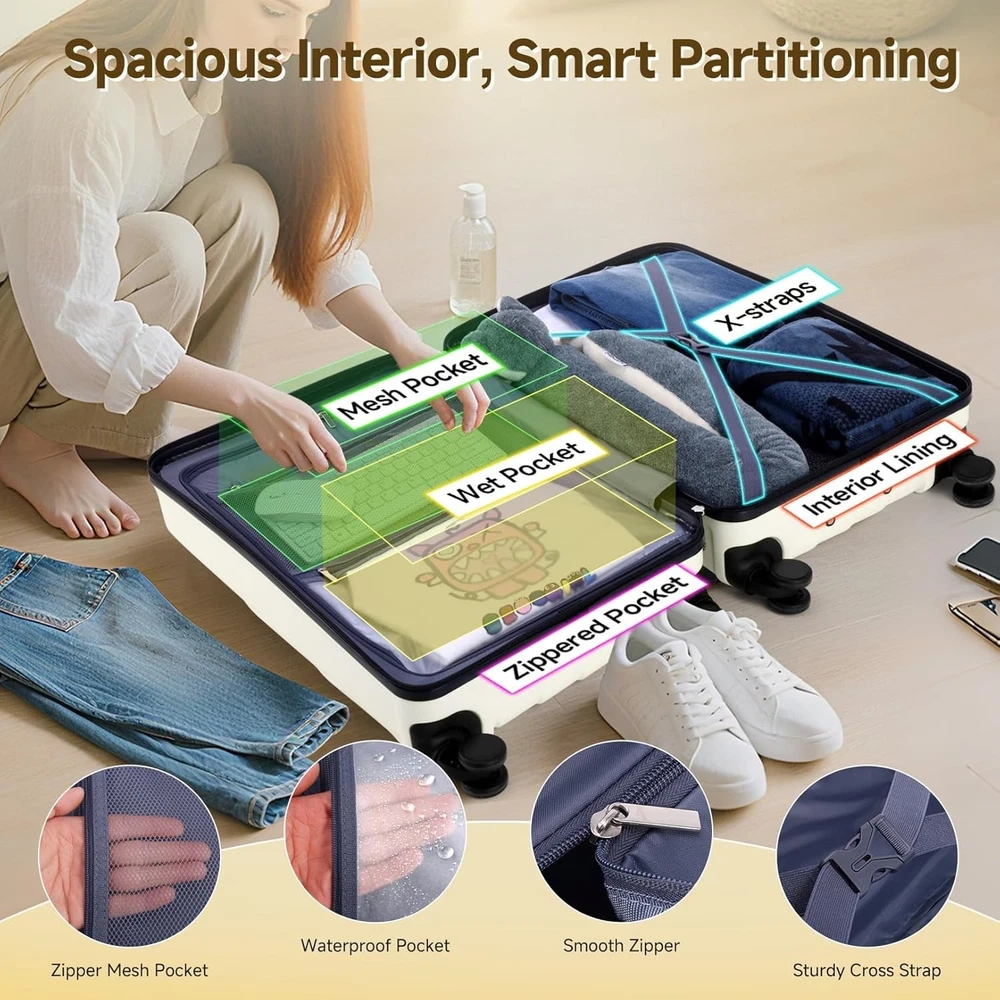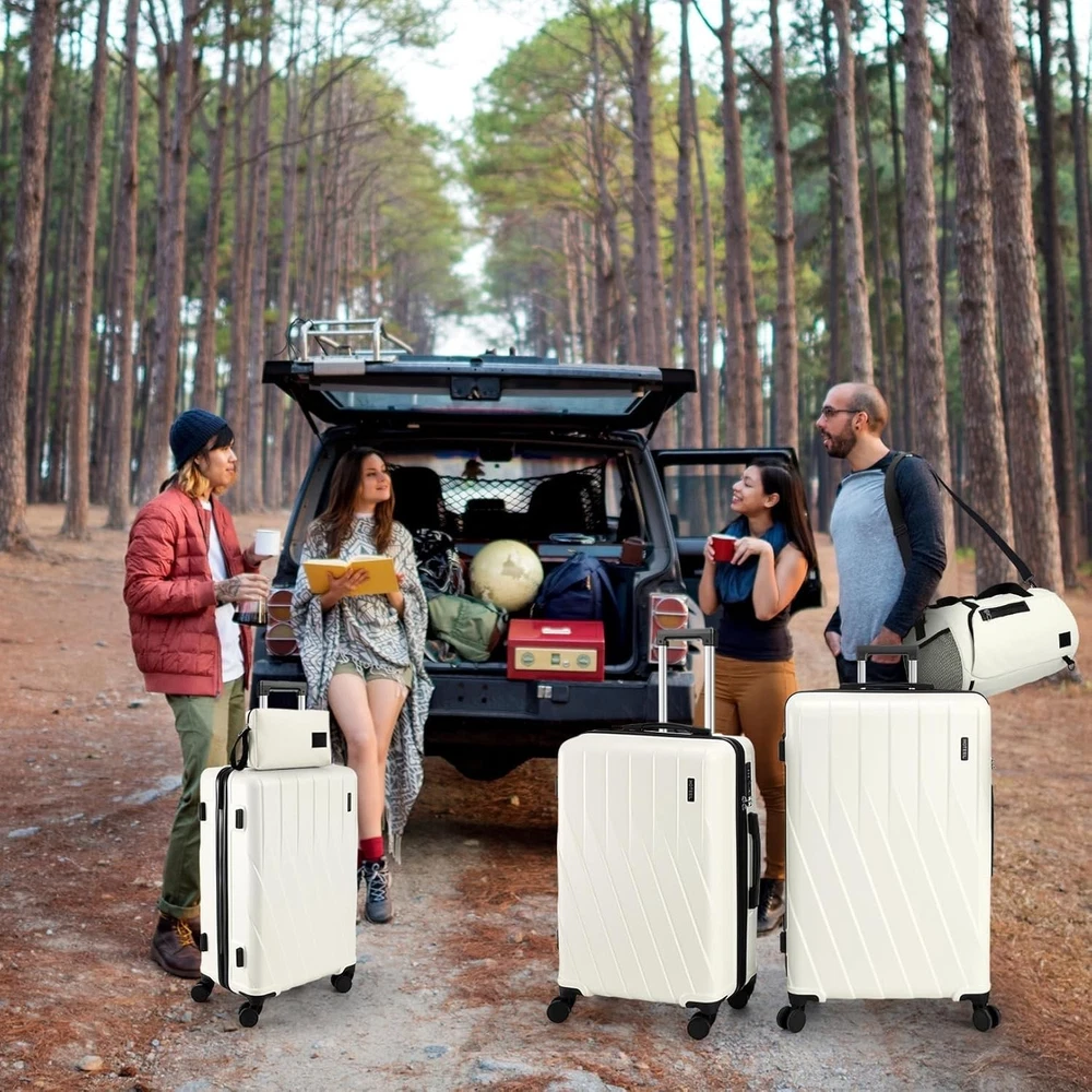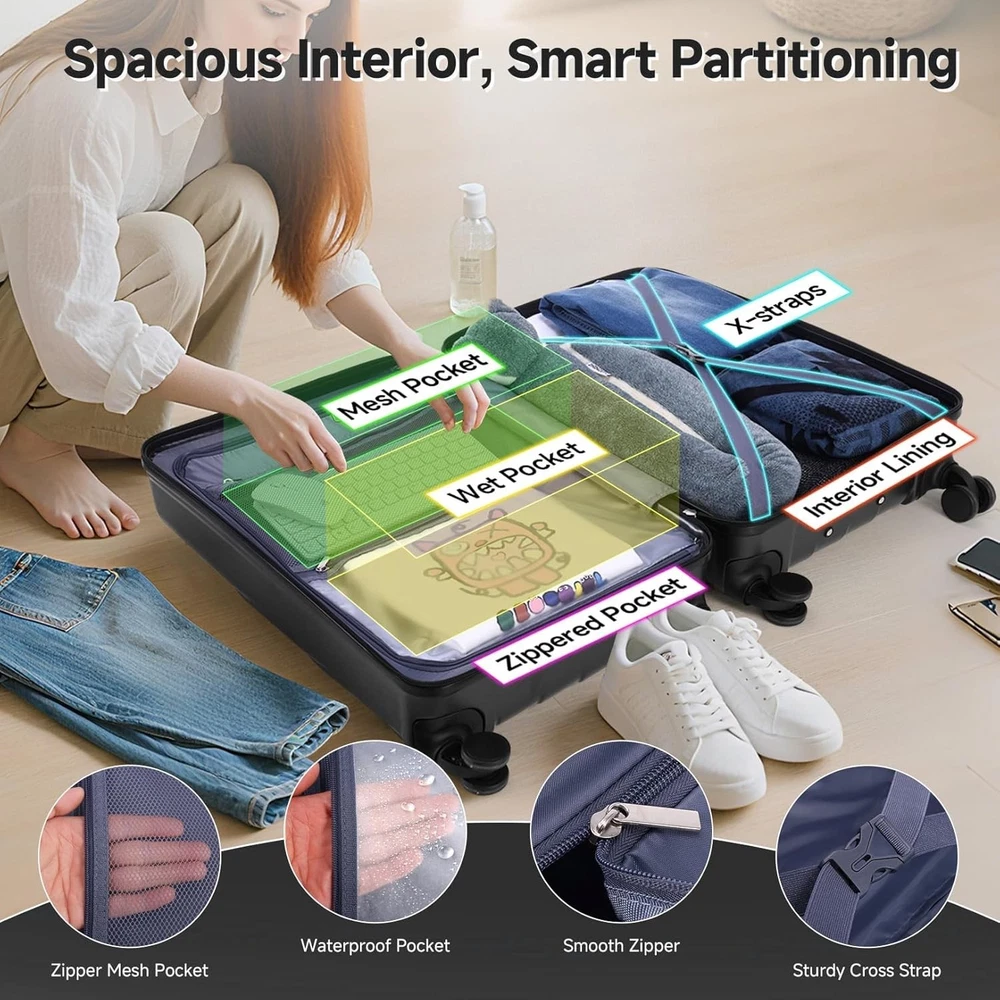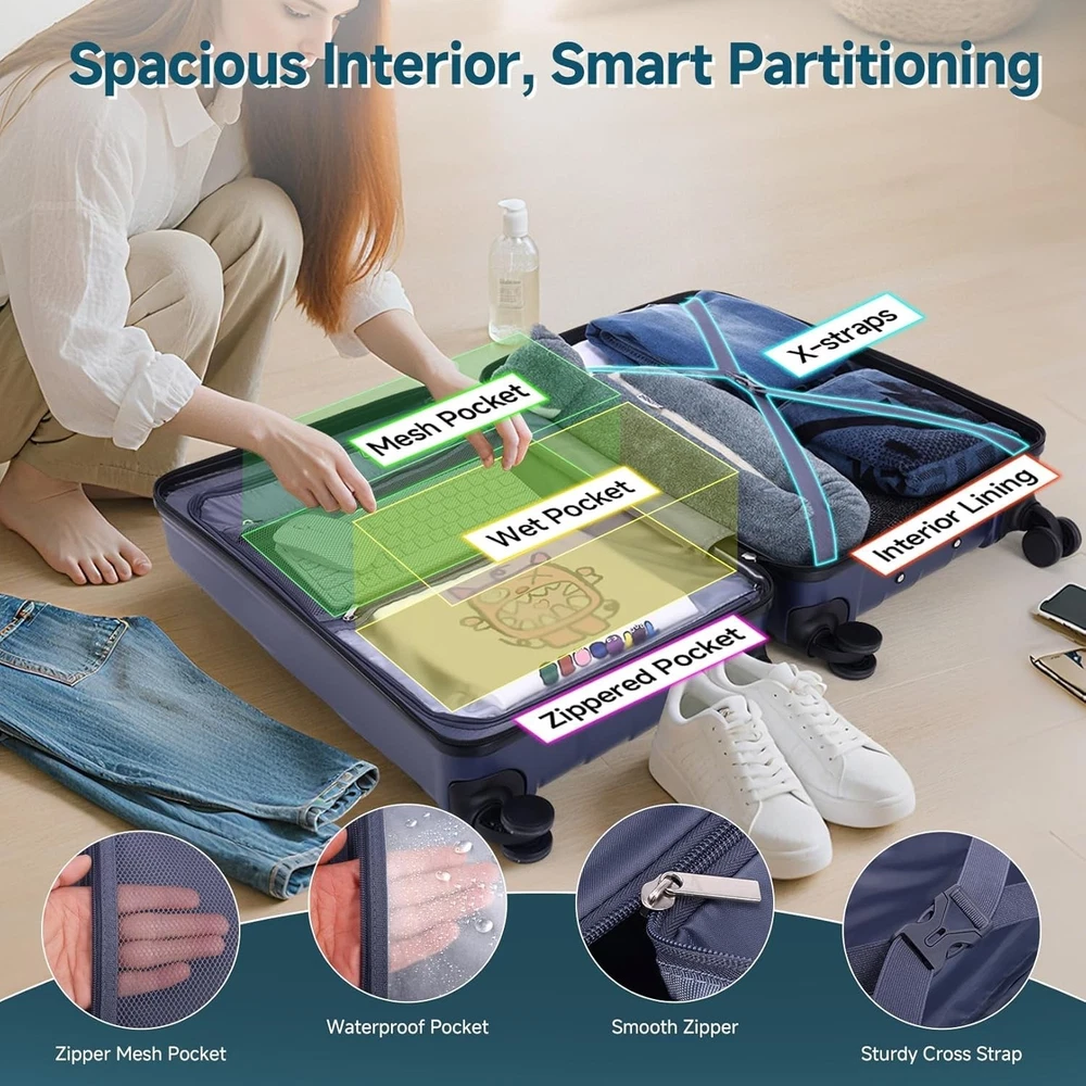 Product description 【Premium 5-Piece Luggage Set & 4-Year Warranty Service】Hoteel 5 piece luggage set includes 20" carry on luggage, a 24'' checked suitcase, a 28'' large suitcase, multi-function fitness bag, and a toiletry bag. You can combine them freely to meet the needs of family or friends traveling and long-distance travel. ✔️Hoteel suitcase set includes 4-Year Limited Warranty and 90-day standard return period, and you can always contact us to replace any damaged parts, such as wheels, handles. Contact us on Amazon if you need help for your purchase. 【100%PC Extra Durable Suitcase】This Hoteel hardside luggage is made of high-quality 100%PC materials, which is known for its lightweight, high elasticity and durability, maintaining maximum reliability even under violent impacts and scratches, keeping your luggage looking good and long-lasting after your trip. Better than ABS+PC and ABS materials. The lightweight luggage is equipped with three-stage adjustable telescopic handle and top/side handles for comfortable use. 【Super Smooth Double-Wheel Spinner Wheel】The spinner wheels on this luggage sets feature a double-wheel structure, with a total of 8 wheels to help the hardshell suitcases move smoothly over various complex roads, allowing you to move freely even in crowded areas. Compared to single-wheel, double-wheel spinner wheel move more quietly, smoothly, and stably, and less likely to tip over when pushing or pulling. 【YKK Explosion-Proof Zipper & TSA lock】 The travel suitcases with wheels is equipped with YKK explosion-proof zippers, which have passed 3,000 durability tests and resistant to be punctured by sharp tools, effectively protecting your privacy and security. TSA-approved lock and fully-lined interior divider with organization pockets and waterproof compartment, ensuring that your belongings are safe and organized during your journey. 【Multifunctional Fitness Bag】The multifunctional fitness bag has hidden double straps at the bottom and a long shoulder strap, providing you with multiple ways to use it, such as a handbag, crossbody bag, or backpack. The side of the gym bag is equipped with a shoe bag and a large ventilated mesh window, and the back features a back sleeve so you can conveniently attach it to the retractable luggage handle.