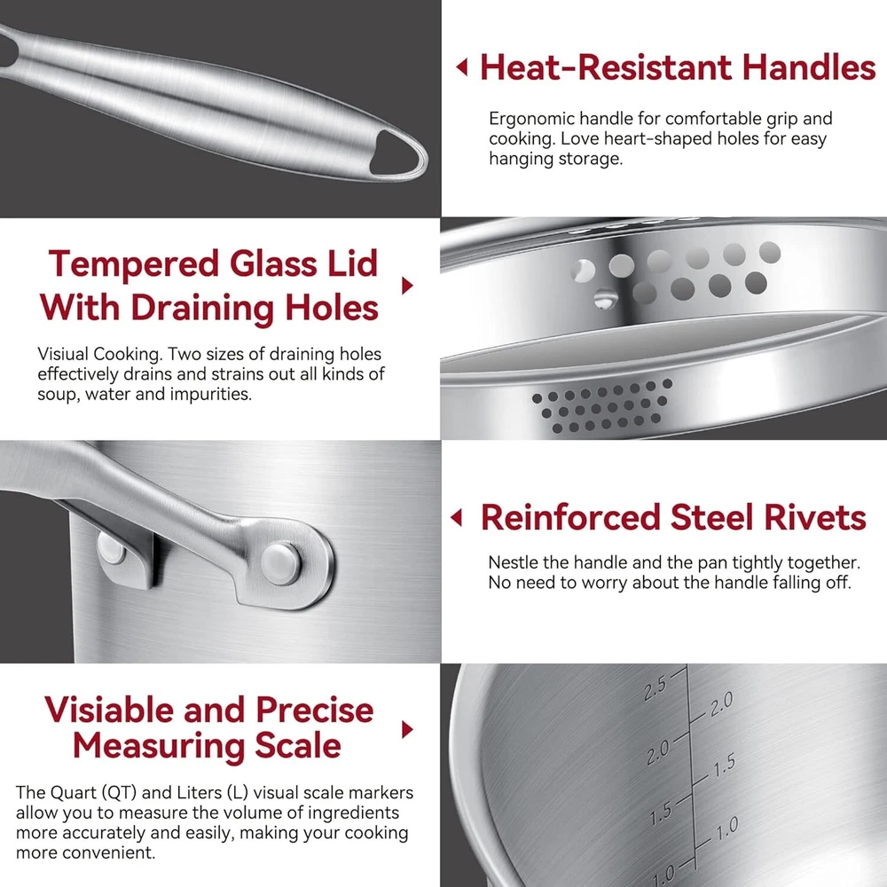 Quart Stainless Steel Saucepan with Steamer Basket, Tri-ply Full Body, Multipurpose Sauce Pot with Two-Size Drainage Holes Lid, Perfect For Boiling Gravies, Pasta, Noodles Versatile 2-in-1 Design: This high-quality stainless steel saucepan features a built-in steamer basket, perfect for preparing delicious, healthy meals while saving space in your kitchen. Ideal for simmering, boiling, and slow cooking, this saucepant is perfect for preparing soups, stews, pasta, chili, and much more, making it an indispensable addition to your culinary arsenal Thicken Tri-ply Full Body Construction: 18/10 Food-Grade stainless stee linner layer, the middle sandwich aluminum layer with 304 stainless steel outer layer. The saucepan features a superior tri-ply design, combining stainless steel and aluminum layers for even heat distribution. Say goodbye to hot spots and toxins, enjoy healthy consistent cooking results that last a Visual Cooking & Easy Draining: The tempered glass lid and visiual precise "QT" and "L" markings on the body of the pot make it easy to monitor your dishes as they reach perfection. Two sizes of draining holes allow for easy draining of synchronized types of food residues, such as large solids in sauces and water in dried pasta Comfortable and Secure Handling: Designed with your comfort in mind, the saucepan features heat-resistant handles with stainless steel rivets for a secure grip. Reinforced steel rivets remain strong and will not soften under high temperatures. They are able to withstand multiple high-load lifts, pours, grips for long-lasting use. You do not need to worry about the handle falling off Versatile Compatibility: The QT stainless steel saucepan is compatible with all stovetops, including induction, gas, electric, and ceramic. Its tight-fitting lid ensures precise cooking control while allowing you to monitor your dishes as they reach perfection Where Quality Meets Flavor