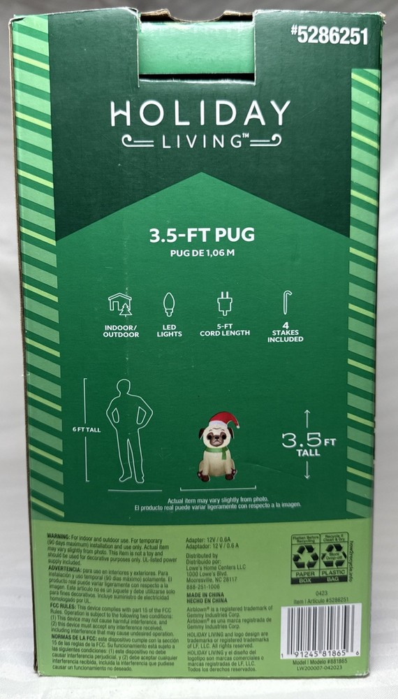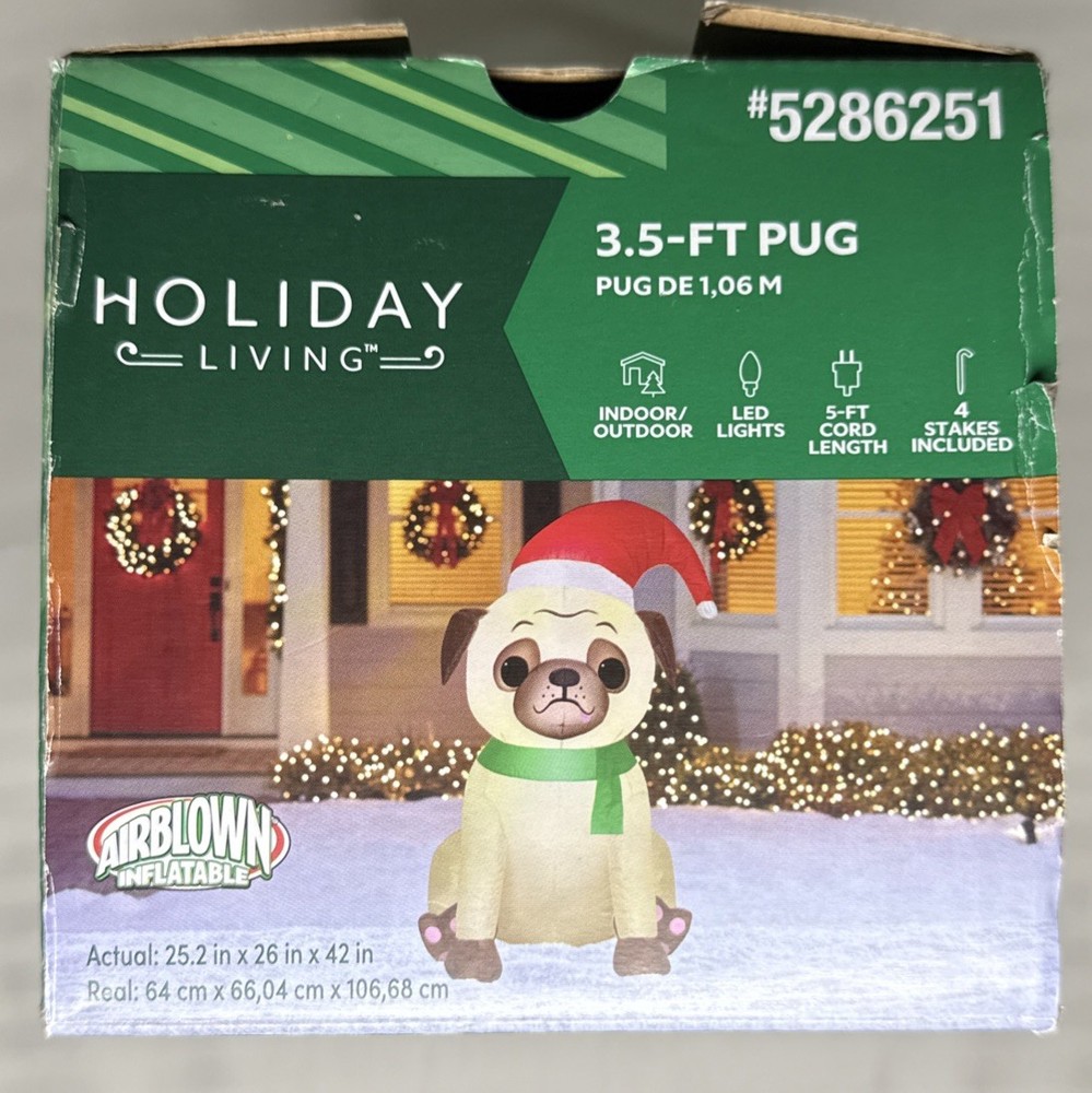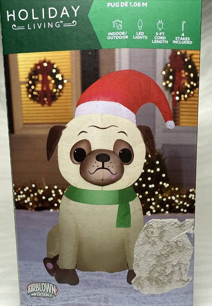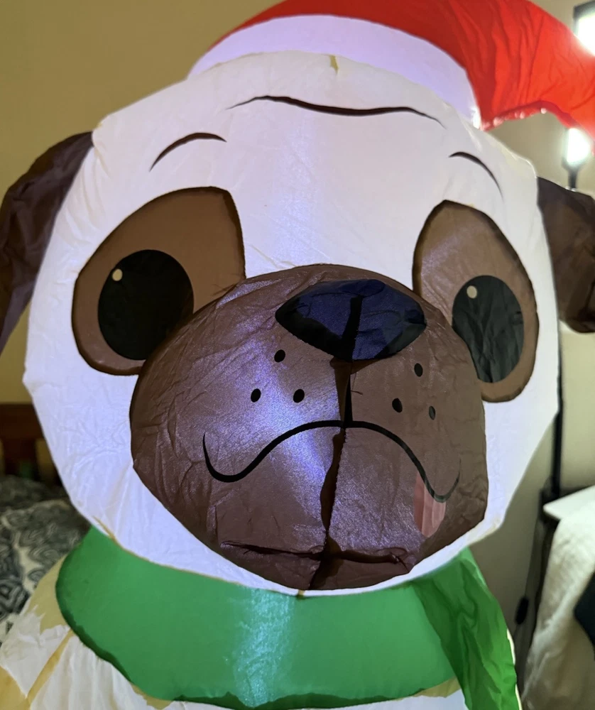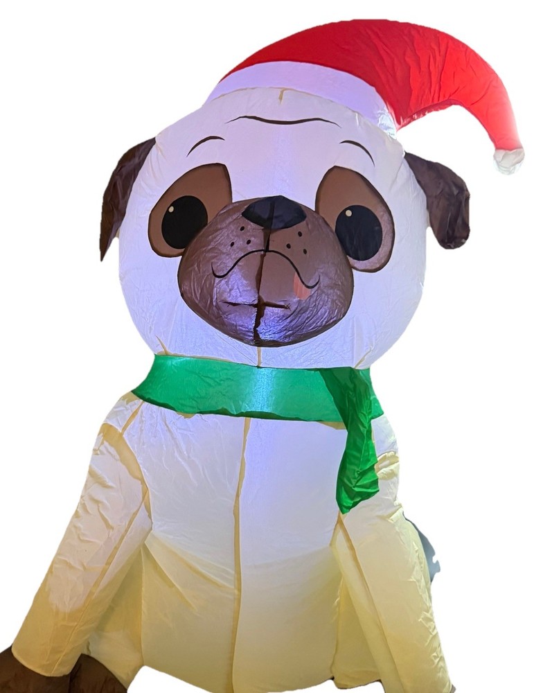 Item is preowned. Item is in original box. Box does have some damage. The Gemmy Airblown Inflatable Pug Dog is a 3.5 ft tall decoration featuring the beloved character wearing a Santa hat and illuminated with LED lights. This festive item is perfect for both indoor and outdoor use during the Christmas season, adding a whimsical touch to your holiday decor. Its contemporary style and glossy finish make it a colorful and eye-catching addition to your seasonal display, showcasing the charm of cartoons and the magic of Santa Claus.