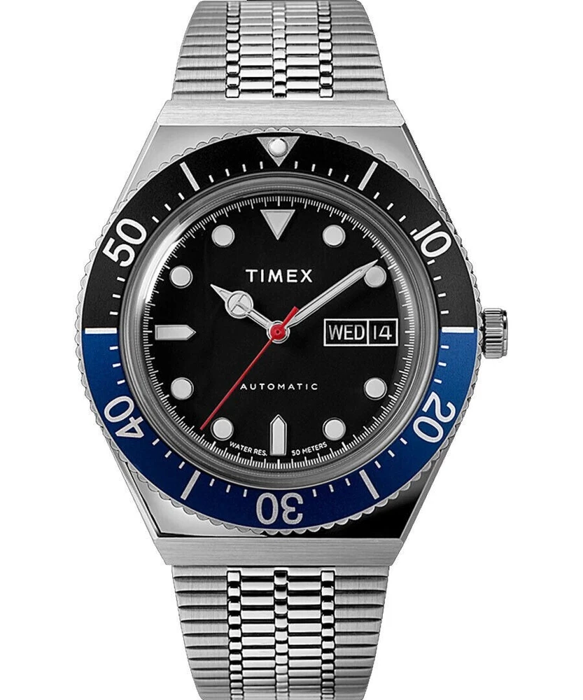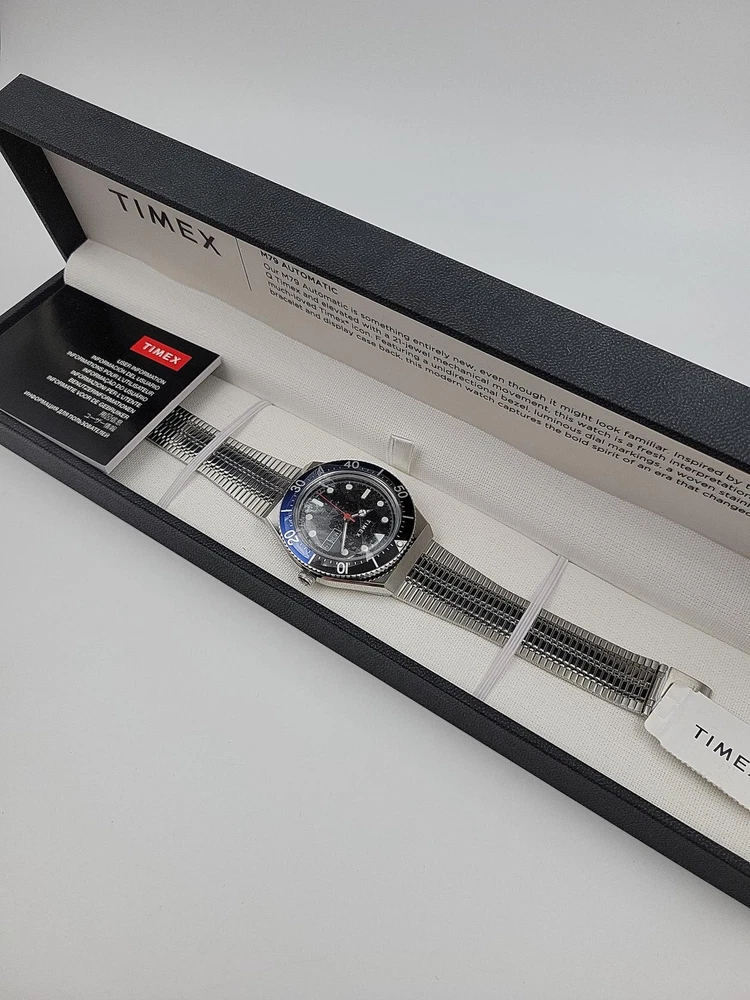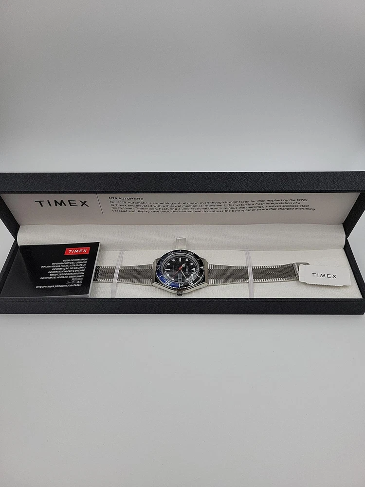 $350 MSRP | Timex Men’s Retro Automatic Stainless Steel Watch - TW2U29500ZV M79 The Timex Men's Retro Automatic Stainless Steel Watch - TW2U29500ZV M79 is a harmonious blend of vintage aesthetics and modern functionality, making it a standout piece for watch enthusiasts. This timepiece pays homage to classic watch design while incorporating contemporary features, ensuring both style and reliability. The Timex M79 Automatic embodies a retro charm with its polished stainless steel case and black dial. The full markers on the dial provide clear and easy readability, while the acrylic crystal adds to the watch's vintage appeal. The stainless steel bracelet enhances the watch's overall durability and style, making it a versatile accessory for both casual and formal occasions. The watch's 40mm case diameter strikes a balance between modern and classic sizes, making it suitable for a variety of wrist sizes. The polished finish of the case adds a sophisticated touch, while the exhibition window at the back allows you to admire the automatic movement in action. Overall, the Timex M79 Automatic is a timeless piece that combines the best of both worlds—vintage design and modern functionality. It's an excellent choice for those who appreciate the artistry of automatic movements and the elegance of classic watch design. Features Brand: Timex Model: M79 Automatic Reference: TW2U29500ZV Movement: Automatic (self-winding) Case Material: Stainless Steel Case Diameter: 40mm Case Thickness: 14.5mm Case Shape: Round Case Finish: Polished Back: Exhibition Window Crystal: Acrylic Dial Color: Black Band Material: Stainless Steel Bracelet Band Color: Stainless Steel Strap and Lug Width: 18mm Water Resistance: 50 meters Fast and Free Shipping You're already purchasing the item. Why pay additional for shipping, especially slow shipping? We get your order shipped out within 1-business day and delivered to your doorstep as quickly as possible. Competitive Pricing With our dynamic pricing model, our prices are always competitive. Our prices are some of the lowest that you will find on the internet. Rest assured that you're getting a good deal when purchasing with us. 30-day Money Back Guarantee We are committed to making sure that you leave this transaction satisfied. If you're unhappy with the product for any reason, you may return it back for your money-back or a replacement within 30 days. No questions asked!