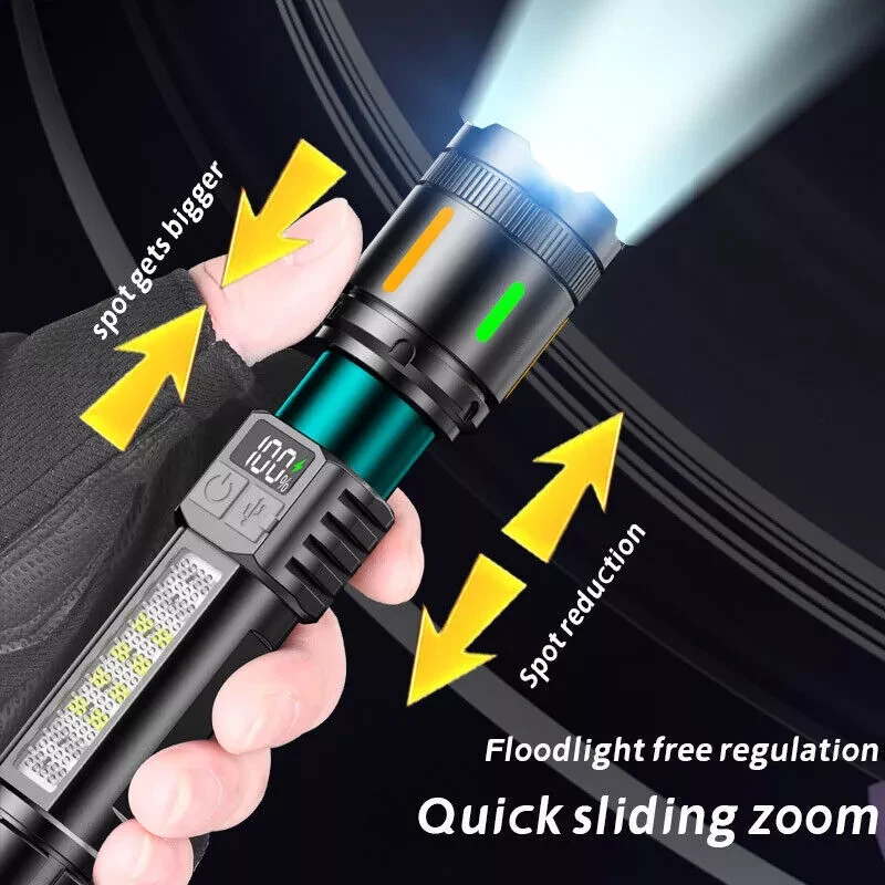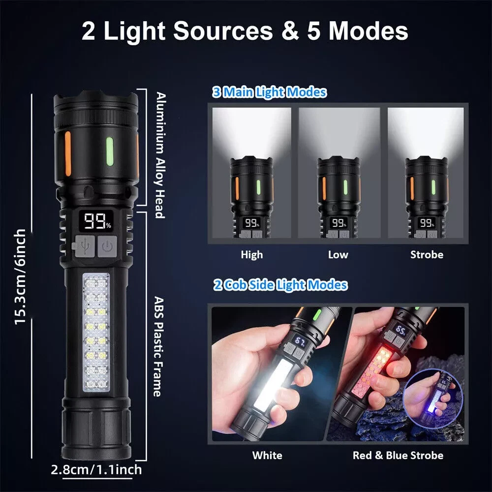 Description: Super Bright Rechargeable Flashlight: Equipped with upgraded efficient laser Chip LED chips, the rechargeable flashlight emits a stable and super bright lighting. Since the light penetration is stronger than other same-level lamp beads', its beam can pass through dust and fog well, especially suitable for foggy and rainy days with low visibility. 5 Light Modes & Zoomable Focus: There are 5 modes of the rechargeable flashlight: High / Low / Strobe for the main light, and White / Red&Blue Strobe for the COB side light. Equipped with zoomable head, the small rechargeable flashlight high lumens can emit a powerful focused lighting and an extensive extended lighting by adjusting the light head. Fast Charging & Power Indicator: Built-in a rechargeable lithium-ion battery and equipped with more energy-efficient chips, the rechargeable flashlight battery powered working time is up to 7 hours with the low mode. The USB C fast charging input achieves 30% reduction in charging time. It can be charged by power bank, USB plug, etc, with the USB C charging cable. You can clearly see the remaining power at the digital power indicator. IPX6 Waterproof: This flashlight head adopts the high grade black aluminium alloy, and the frame adopts the ABS plastic. The waterproof grade of this flash light reaches IPX6 Waterproof. This rechargeable flashlight is non-slip, shockproof, waterproof, rainproof, dustproof. It can work well in severe outdoor weather conditions, such as rain and snow. It is an ideal outdoor handheld flashlight for working, hiking, camping, repairing, hunting, and Sogidon fishing. Easy to Carry: Led flashlight is equipped with lanyard and pocket clip, which can be hung on your wrist or attach to your pocket , backpack shoulder strap, hat and belt. As its compact design, you carry this small handheld flashlight in your pocket or the car glove compartment. Specification: Product Type: Flashlight Color: Black Waterproof: IPX6 Working Time: 3-6hrs Charging Time: 3.5-5hrs Material: Aluminum, Plastic Power Source: ‎Battery Powered Charging Method: Type-C Charging Size: 15.3*3.5*2.8cm / 6.02*1.38*1.1inch Lighting Mode: 5 Modes(High / Low / Strobe for the main light; White / Red&Blue Strobe for the COB Side Light) Package Included: (Per unit) 1 x Flashlight 1 x USB Cable Note: Due to the different monitor and light effect, the actual color of the item might be slightly different from the color showed on the pictures. Thank you! Please allow 1-2cm measuring deviation due to manual measurement.