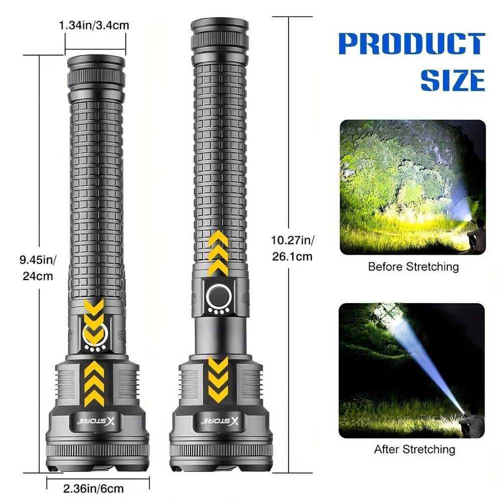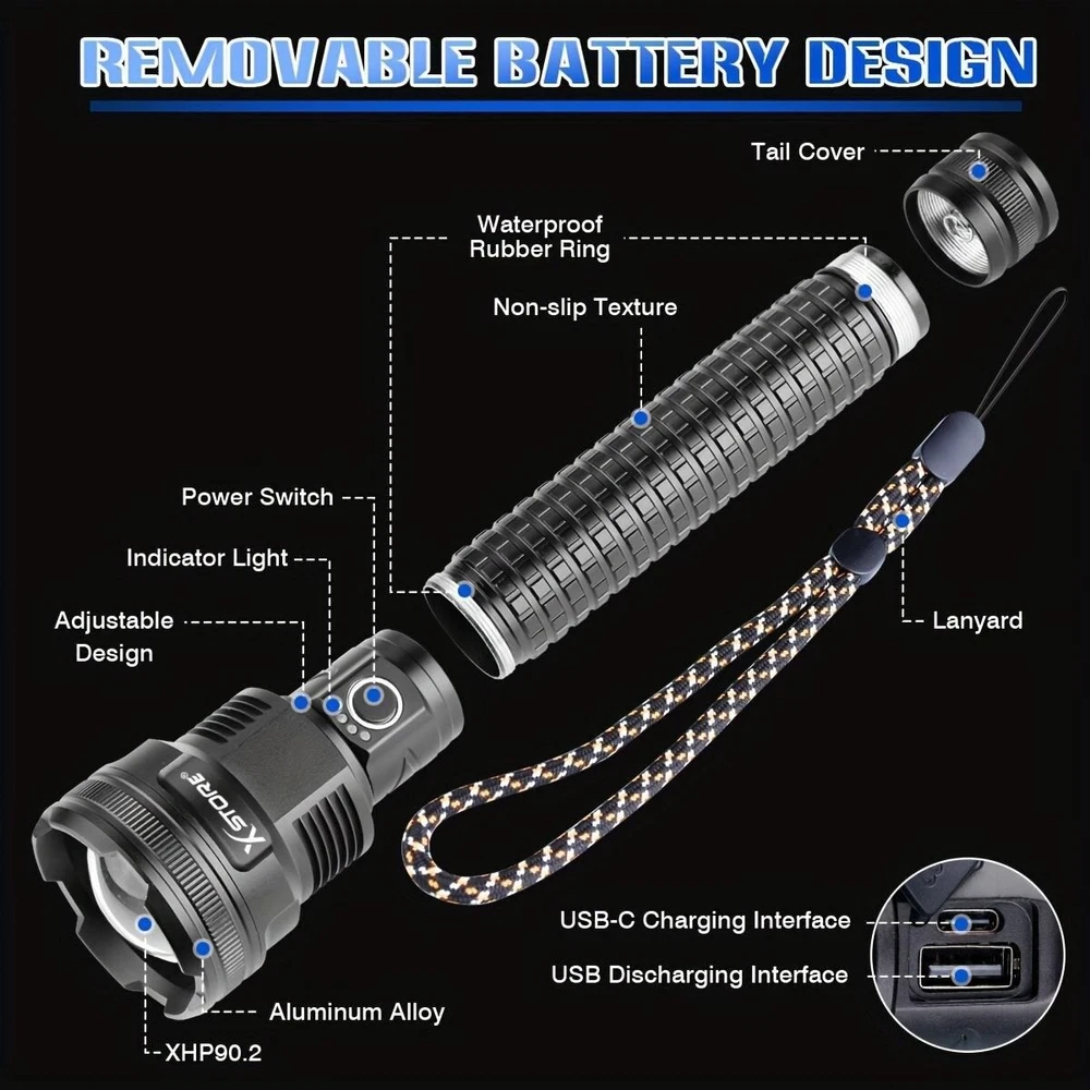 Product Description: Lamp beads: XHP90 5 modes: high/medium/low/strobe/SOS (any gear can be long-pressed for 3 seconds to switch off) Lumen: 2000LM Power: 50W Colour: Black Light colour: white Middle button switch Material: aluminium alloy Adjustable focus: Yes Size: as shown in the picture Lighting distance: about 200-1000 metres Power supply: 2 sections of 26650 or 2 sections of 18650 can be connected in parallel or series, battery capacity 5000mah Function: Micro USB Charge / Output: 5V/1-2A Can live waterproof (can be used in rainy days), but can not be used for diving, and can not be immersed in water. Battery model 26650 Current: 0.5A Voltage: 3.7V Power: 8 Capacity: 2200mah About Maintenance 1. Keep it away from high temperature and high humidity, avoid external collision and extrusion. 2. If it is stored for a long time and not used, it should be kept at 50% -60% of the power status. It should be charged once a month and fully charged and discharged every three months. Features: *5 lighting modes and tactical zoom function: the torch as a powerful multi-functional torch, with strong / medium light / low light / strobe / SOS 5 lighting modes, also has excellent tactical telescopic zoom function (zoom in and zoom out), you can according to their needs to choose the appropriate lighting mode and function, in case of emergency, you can use as a back-up power supply or use the SOS mode flash for help! *Rechargeable torch and power indicator: the rechargeable torch is powered by 2*26650 batteries. Built-in Type-C input port is convenient for you to charge the torch. In addition, the rechargeable torch has a 25%/50%/75%/100% power display, so you can see the power level at a glance, and it has circuit protections, such as overcharge protection, short circuit protection, etc., so that the handheld flashlight has a longer service life. *This super bright torch can also be used as a mobile power source to charge your mobile phone in case of emergency. Package Includes: 1x Strong light torch 2x Rechargeable 26650 Batteries 1x USB-C cable 1x Product Manual