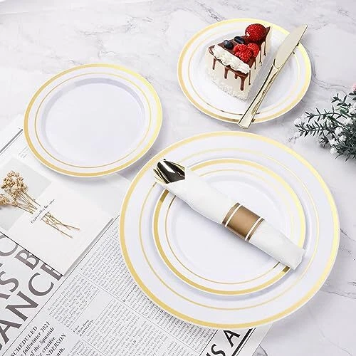 PERFECT DIMENSION - Seamlessly fitting into every occasion, this exceptional party plate set is the perfect choice. When you invest in this package, you'll receive 50 dinner plates measuring 10.25 inches, 50 salad plates at 7.5 inches, 50 sets of gold silverware with pre-rolled napkins, and 50 cups at 9 oz. DURABLE & BPA FREE - Constructed for durability and certified BPA-free, our plastic plates and silverware are manufactured from heavy-duty materials, ensuring they meet the highest food-grade standards. Feel free to utilize these gold plastic charger plates to serve hot foods such as pasta and turkey. VEERSATILE OCCASSIONS - Tailor-made for a variety of events, the elegant design and classy color scheme of these party supplies elevate any occasion. Be it weddings, anniversaries, birthdays, or bachelorette parties, the timeless gold color adds an air of sophistication. The convenience of disposable plates also means less cleanup hassle, particularly valuable for party planners looking to save time. ELEGANT DESIGN - featuring classic white plates adorned with timeless gold rims, effortlessly integrate into any event, resembling authentic ceramic plates. These disposable plates and gold silverware sets exude a classic, timeless aura, much like the cherished memories they help create for guests. CONVENIENT TO USE - No more fussing over pre-party style coordination, whether you're a planner or a host. Once the event is over, just dispose of disposable plates for a quick cleanup. Moreover, these reusable plastic plates are easy to clean and store, adding an extra layer of convenience. Make entertaining a breeze today!