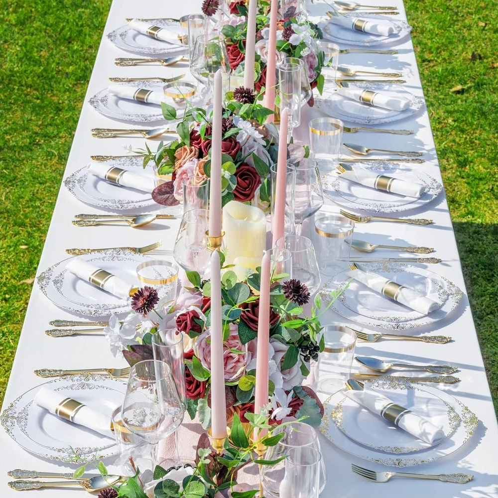 350PCS Gold Plastic Plates - Gold Plastic Dinnerware Sets for 50 Guests - 100 Gold Disposable Plates, 150 Gold Plastic Silverware, 50 Cups, 50 Napkins for Wedding & Party & Thanksgiving 50 Guests Value Pack : Served for 50 white and gold plastic plates include 50 dinner plates, 50 dessert plates, 50 knives, 50 forks, 50 spoons, 50 cups and 50 napkins. Our gold plastic plates are great choice for weddings and parties. Premium Quality: White gold plates are made of heavy plastic and resistant to breaking, bending and snapping. And gold plastic plates are food grade plastic, BPA free, non-toxic. Hold a happy party for your guests with these exquisite clear white and gold plates! Reusable & Convenience: White with gold rim plates can be reused and will look as good as new after washing. White plastic plates are also disposable plates, so they can be discarded after use, which is very convenient to use, saving time and eliminating the need to wash dishes. I hope our white gold plastic plates can bring you a good use experience and bring you a convenient life. Perfect For Any Occasion: These white disposable plates are designed for using at parties, weddings, luncheons, family gatherings, engagement parties, BBQs, Thanksgiving day, dinners, reunions, birthdays, fiestas, retirement celebrations, picnics, buffets, catering, food services and more! There is always a time when disposable gold plastic plates sets are convenient. Convenient To Use: Table covers intended for buffet tables, Plastic utensils are NOT suitable for boiling hot liquids, Microwave use, or Dishwasher use. Convenient to serve the guests, and their transparent style offers exceptional versatility, working well for casual and upscale gatherings alike. Where Every Celebration Shines
