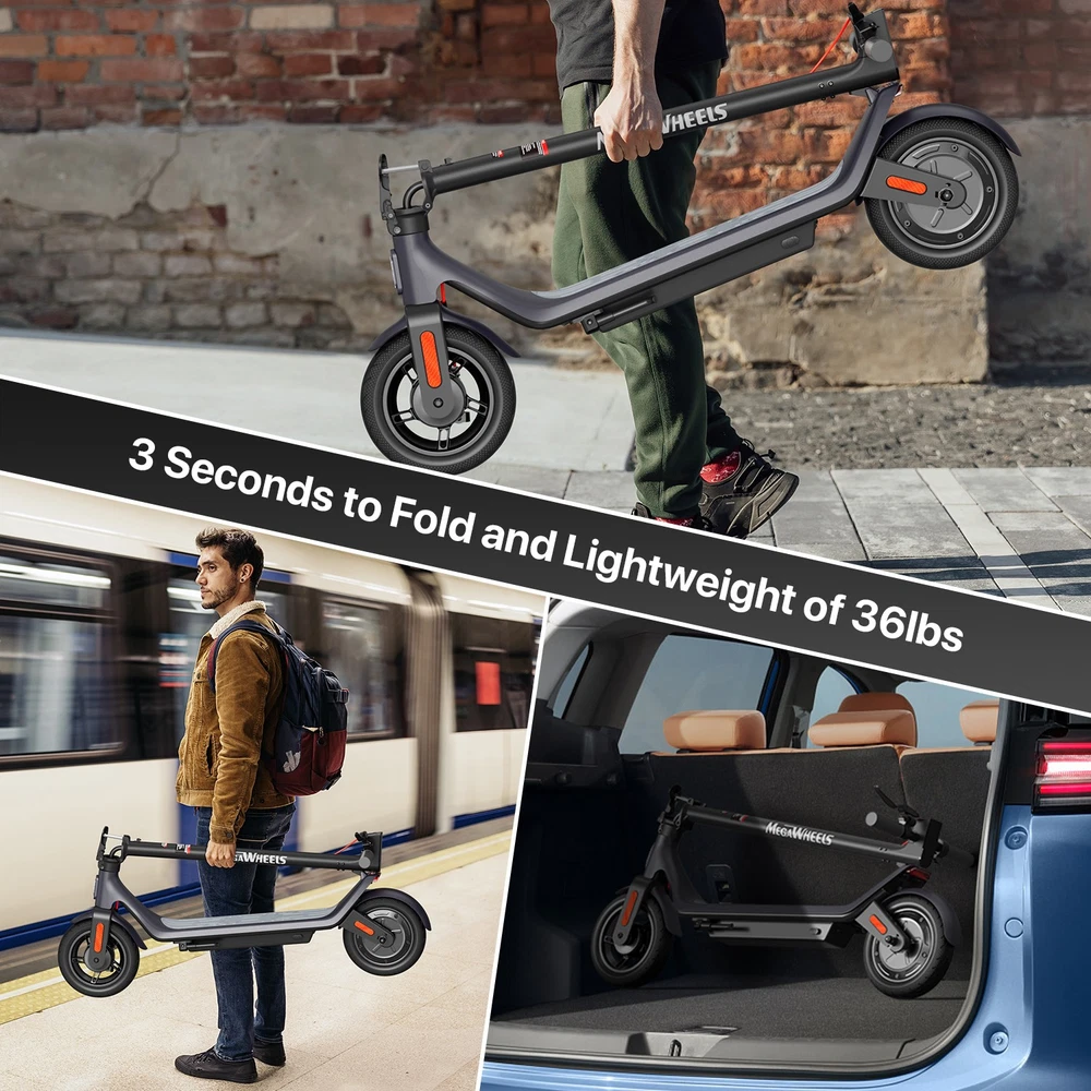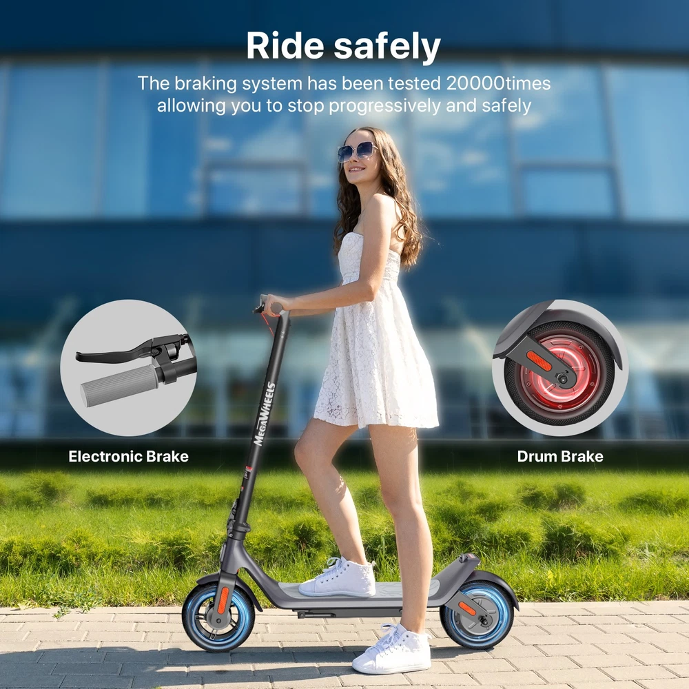 Features: Smart Dashboard : intuitive dashboard provides clear visibility of your current speed, speed modes, light status (on/off), and battery life, ensuring effortless monitoring and control throughout your journey. Long Battery Life and Waterproof : electric scooter is equipped with a large-capacity 10.2Ah battery, with a maximum cruising range of up to 18 miles, ensuring long-term uninterrupted riding, and is also waterproof for small raining. Portable Folding Design: Its rapid folding feature allows for easy handling and storage. Compatible with the majority of car models, it effortlessly fits into car trunks, ideal for daily commutes. Conveniently store it in office hallways or at home in your backyard or indoors , taking up minimal space. Safety Design : Safety is our top priority, so the electric scooter is equipped with warning tail lights and ultra-bright headlights to ensure visibility when riding at night. Smart APP Control : The APP is compatible with Android and IOS, connects to the electronic scooter via Bluetooth. You can control through the APP: Lock/Unlock, Light On/Off, Gear Position, Starting Mode (Zero Start or Non-zero Start), Top Speed, Cruise Control, etc. The App offer more functions for your electrical scooter. Specification: Brand: MEGAWHEELS Model: A6L ECO Net Weight: 36.05 LBS Expanded size(in): 44.29×17.32×47.40 After Folding(in): 44.29×17.32×21.06 Tire size: 10 inch Battery Capacity: 10.2 Ah Rates Power: 350W Charging time: 8H Maximum speed: 15 Mph Distance per charge: 18 Miles Grade ability: Approx. 15% Maximum load : 220 LBS IP Rating: IPX5 Age (years):10+ Height (in): 4.72~7.87 Packing List: 1 * Electric Scooter 1 * User Manual Note: This products have been certified under UL2272 safety standards. Riding Skills: -Put your foot in the front of the scooter and the other foot on the floor before riding. -Make sure that the riding route is smooth. -Slide forward with the food standing on the floor before starting (like riding the scooter without power). -Immediately press the acceleration button and lean forward to avoid falling over backward due to inertia, so that the electric scooter will enter the working status. -Avoid pressing the handle with your body in the acceleration and deceleration process. Put one foot ahead and the other behind (like on the sliding plate/surfboard, put one foot ahead and the other behind by 70-90 for better comfort). -Turning – The turning principle of the electric scooter is the same with that of surfboard/sliding plate/skis. The handle shall be balanced with the body. Observe and make sure that turning is safe before turning. Tips: Before riding the scooter, please put one foot on the scooter deck and the other foot on floor and push the scooter forward by kicking the floor for some distance, in this way, the scooter will get some impulse to run forward. On Jul 7, 2025 at 20:57:36 PDT, seller added the following information: