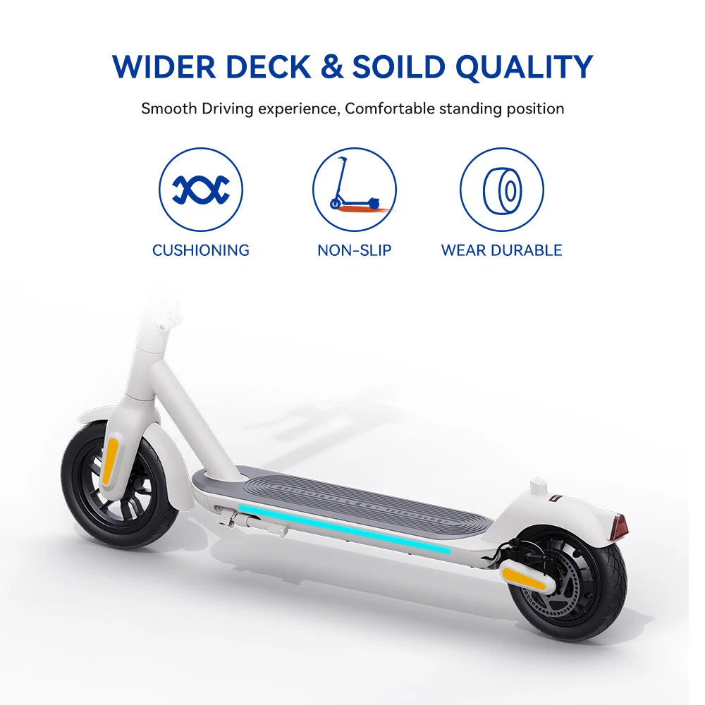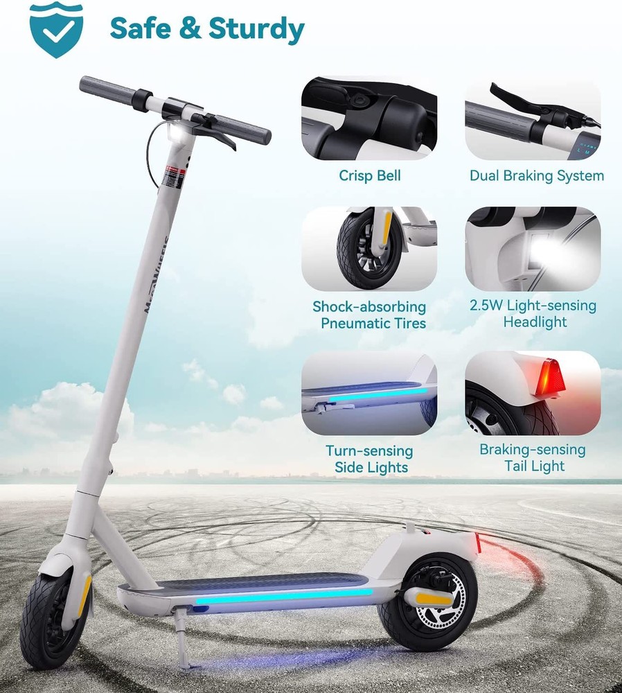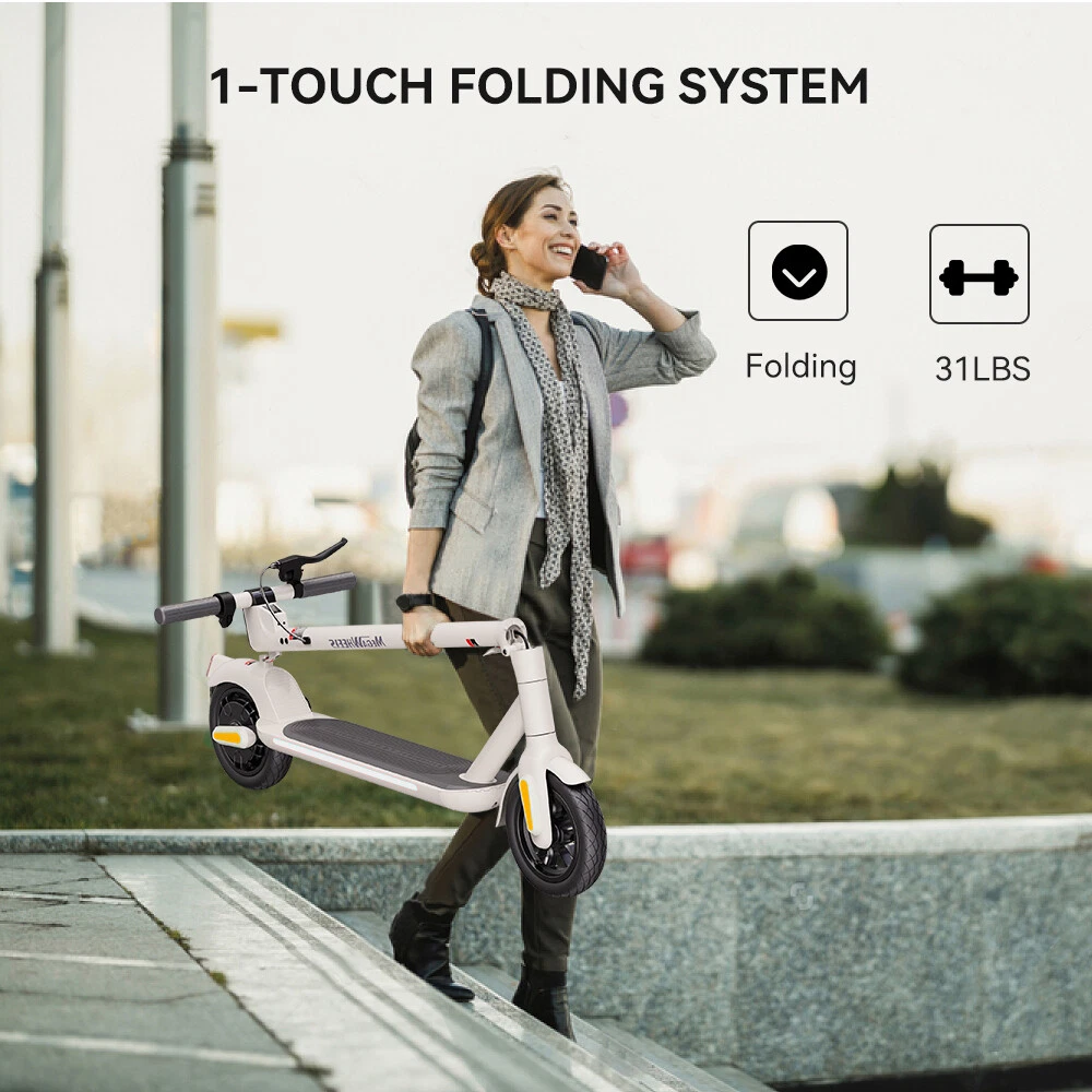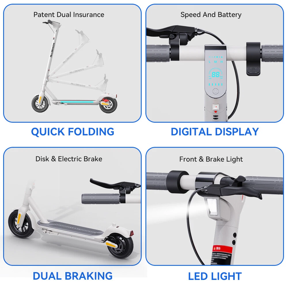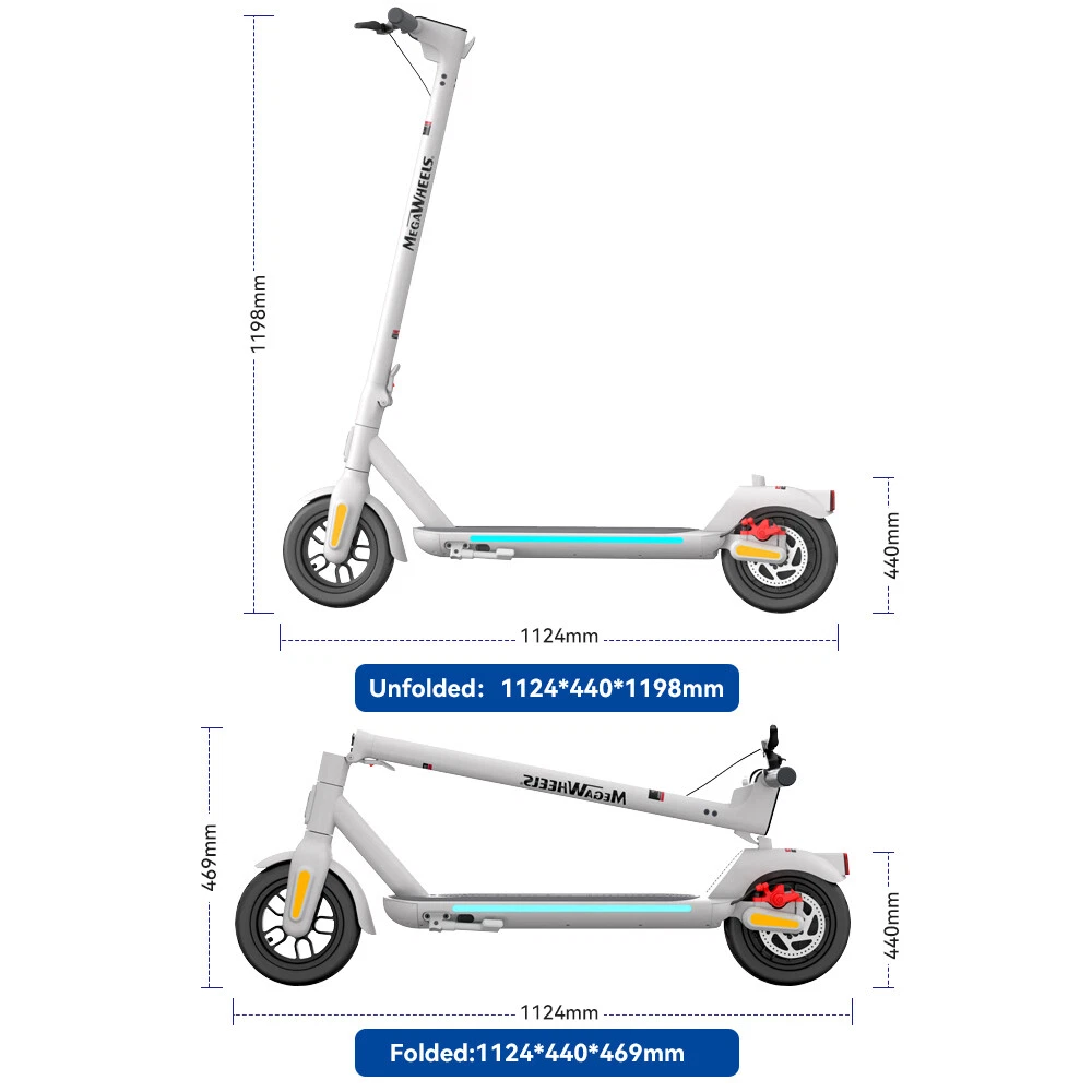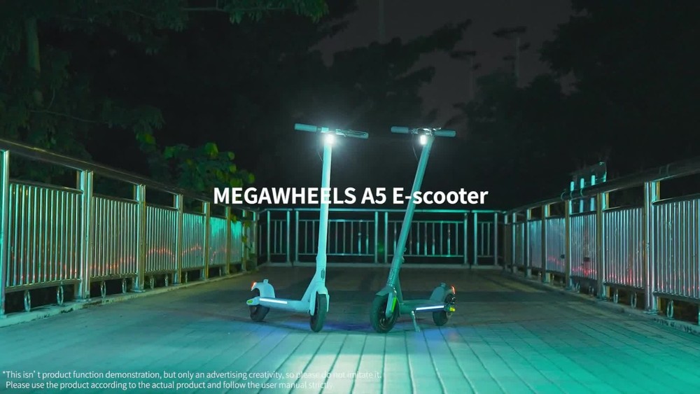Features: 【 Adults Electric Scooter 】——Equipped with 350W powerful motor and 280.8Wh High capacity battery, A5 adult electric scooter can reach 15.5mph, travel up to 18.6miles, and climb slopes up to 15 degrees with ease. 【 Safe & Stable 】——Mechanical disc brake and motor dual braking system ensure safe braking. 2.5W super bright Light-sensitive headlights, cool turning sidelights, crisp bells and LED taillight to improve night driving safety. Soft anti-skid pedals, High-Resilience shock-absorbing 9-inch pneumatic tires and cruise system give you a smooth and comfortable ride. 【 Foldable & Portable 】——The scooter electric for adults can be picked up with only one hand, and it is easy to carry. The electric scooter adult folds easily in just 3 seconds for easy storage in car trunks and other tight spaces. 【 Multifunctional Console & APP Support 】—— LED display can show speed, battery life and speed mode. Just pair MEGAWHEELS electric scooter with your smartphone via bluetooth and you can use the app to control the scooter speed mode, cruise mode, ambient light linkage and lock. 【 Hassle-free Warranty 】——If you have any questions about the scooter, please feel free to contact us, we will provide you with professional guidance and solutions within 24 hours. Better after-sales service may save you a lot of time and useless effort.12-month or 6-month warranty for different parts. Specification: Brand: MEGAWHEELS Model: A5 Net Weight: Approx 14 KG Expanded size: 112.4×44×121.5 CM Tire size: 9 inch puncture-proof tubeless tyres Rated power: 350W Battery capacity:7800mAh Voltage:36V Charging time: About 4H-5H Connection method: Bluetooth Maximum speed: 25 KM/H(15.5MPH) Distance per charge: 30km Brake system: Mechanical Disc brake + e-ABS Brake Grade ability: About 15% Maximum load : 120 KG(265 LB) Suitable age: 10+ Applicable height: 130~200 CM Protection grade :IP65 Packing List: 1 * Electric Scooter 1 * Power Adapter 1 * User's Manual 1 * T-shape Allen Key 7 * Screw Riding Skills: -Put your foot in the front of the scooter and the other foot on the floor before riding. -Make sure that the riding route is smooth. -Slide forward with the food standing on the floor before starting (like riding the scooter without power). -Immediately press the acceleration button and lean forward to avoid falling over backward due to inertia, so that the electric scooter will enter the working status. -Avoid pressing the handle with your body in the acceleration and deceleration process. Put one foot ahead and the other behind (like on the sliding plate/surfboard, put one foot ahead and the other behind by 70-90 for better comfort). -Turning – The turning principle of the electric scooter is the same with that of surfboard/sliding plate/skis. The handle shall be balanced with the body. Observe and make sure that turning is safe before turning. Tips: Before riding the scooter, please put one foot on the scooter deck and the other foot on floor and push the scooter forward by kicking the floor for some distance, in this way, the scooter will get some impulse to run forward. Note: This products have been certified under UL2272 safety standards. On Jan 21, 2025 at 00:18:52 PST, seller added the following information: