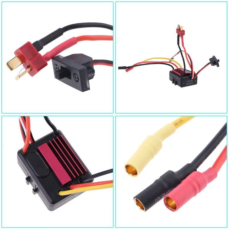 Features: 1. Water- proof and for all-weather races; (Note: please uninstall the cooling fan before using this in water and dry it soon after the use for avoiding the connectors get rusty.) 2. Specially designed for car with excellent start-up, acceleration and linearity features. 3. for sensorless brushless motor. 4. The strong current capability, excellent heat dissipation. 5. Multiple for features: Low cut-off for for litium or /Over-heat protectionThrote loss for / Motor blocked for 6. Easily programmed and for pocket-sized program card. Specification: Name: 35A Cont.Current/Burst Current: 35A/120A Motor Type: Sensorless Brushless Motor for 2S Lipo or 6 cells NiMH 1. on-road: 28XX-Size or smaller motor with the KV<6000KV 2. off-road Monster 28XX-size or smaller motor with the KV <4000KV for 3S Lipo or 9 cells NiMH 1. on-road: 28XX-Size or smaller motor with the KV<4000KV 2. off-road Monster 28XX-size or smaller motor with the KV <3000KV Suitable Car: 1/16 1/14 Car Resistance: 0.0004ohm 2-3S Lipo/4-9Cells NiMH BEC Output: 5.0V/2A(analog Dimensions/Weight: 40x31x17mm/44g Package Included: 1 x 35A 1 x English Manual This is Electronic Speed Controller for car. High power system for model is very so please read this manual carefully. Since we can'for t control over the correct use, installation, application, or maintenance of our products, we'veno liability shall be assumed nor accepted for any damages, losses or costs resulting from the use of the product. Any claimsarising from the operating, failure of malfunctioning will be denied. We assume no liability for injury,consequential damages resulting from our product or our workmanship.