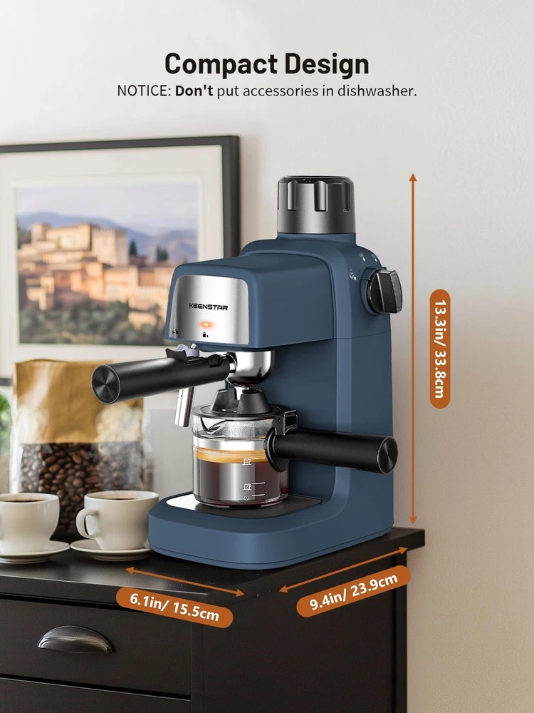 Easy to Make Hot and Iced Coffee: Single switch knob with indicator light for simple operation.Turn the control knob to the "OFF" position to relieve pressure before opening the water tank cap or removing the portafilter. Innovative pause function allows you to deal with unexpected event. More suitable for beginners. Fast Brewing Technology: Advanced heating technology makes water quickly heat to the right temperature. 3.5 bar pressure coffee maker can make 1-4 cups (240ml) of coffee within 2 minutes. Easy-pour glass cup is clearly marked to serve the perfect amount every time and delivers a truly rich espresso in seconds. Warm Tips:Add Max 240ml water, otherwise the nozzle will leak. Powerful Steam Wand: High power 800W element for high pressure steam and faster heat up to create the micro-foam in 40 seconds, ready to make creamy cappuccino and latte art without wait. Accurate temperature control can ensure the best taste. We advise you clean the steam wand after every use, otherwise the steam wand may be blocked by milk scale and water scale. Warm Tips: Don't add water asap after making coffee to prevent burns. Space Saving and User Friendly: This compact coffee maker is smaller than most. Dimensions are 13.1" high x 7.7" wide x 10" deep, weight only 4.7 pounds. Fits in any kitchen while maintaining key features like heat control, bar pressure, and milk frothing. BPA Free. Robust and low noise, suitable for all families. (Don't put accessories in dishwasher) NOTICE: 1. FILTER MUST BE FULLY LOCKED! Pls always turn the handle to the lock symbol on the head of machine. 2. Don’t use too fine coffee ground, only medium ground is suggested. 3. Please clean the coffee ground on the edge of the filter.