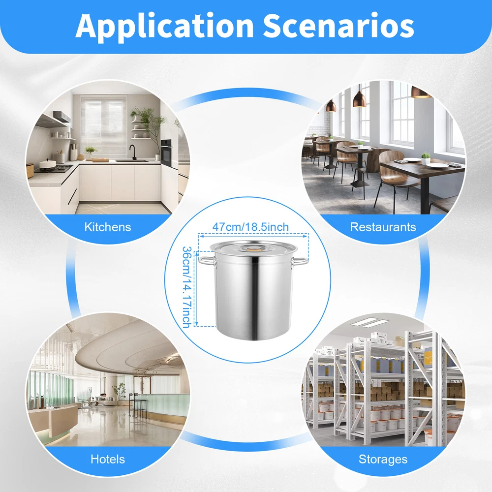 Description This exquisite and timeless stockpot is meticulously crafted from premium 201 stainless steel, embodying an ideal fusion of durability and culinary elegance. The pot's versatility is exemplified by its ability to accommodate both solid and liquid fare, transcending the boundaries of conventional cookware. It seamlessly transitions from simmering hearty stews brimming with tender vegetables and succulent meats, to gently boiling aromatic broths teeming with delicate herbs and spices. Indeed, it is a culinary chameleon, adapting flawlessly to a myriad of gastronomic scenarios. Key Feature Durable & Sturdy: The 201 stainless steel body with a thickness of 1.2mm offers durability and sturdiness for this product. Large Capacity: It measures 14.76*14.17 inches with a large 35L/9.25Gal Stock Pot Stainless Steel Large Kitchen Soup Big Cooking Restaurant Description This exquisite and timeless stockpot is meticulously crafted from premium 201 stainless steel, embodying an ideal fusion of durability and culinary elegance. The pot's versatility is exemplified by its ability to accommodate both solid and liquid fare, transcending the boundaries of conventional cookware. It seamlessly transitions from simmering hearty stews brimming with tender vegetables and succulent meats, to gently boiling aromatic broths teeming with delicate herbs and spices. Indeed, it is a culinary chameleon, adapting flawlessly to a myriad of gastronomic scenarios . Key Feature Durable & Sturdy: The 201 stainless steel body with a thickness of 1.2mm offers durability and sturdiness for this product. Large Capacity: It measures 14.76*14.17 inches with a large capacity of 30 Quart , fulfilling your life storage and culinary needs at once. Easy to Clean: Its anti-corrosion and smooth material with polishing treatment makes it easy to clean. It just needs to be cleaned like any other kitchenware for your convenience. Easy to Move: Our stockpot is designed with tightly welded handles on both sides of the body to make it easy to move or pour out internal items at any time and anywhere. Multifunctional: The airtight lid keeps food fresh and clean when storing, but also locks in heat to speed up cooking when making soup . Well-intentioned Design: Its bottom fits both with durability in mind because of the right thickness (0.8 mm) and also with better heat conduction and faster cooking in mind because it is designed to be slightly thinner than the barrel . Idea Gift: The stockpot is the ideal gift for cooking, and its airtight and large-capacity features are also ideal for stockpilers or caterers. Guaranteed Customer Service: Your satisfaction is our primary goal. If you have any questions about this stockpot, please feel free to contact us, and we will reply and provide the solution to you as soon as possible. Details Curling Edge: The curling edge design aims to protect you and your family members from scratches and bruises when using it. Anti-slip Grooves: The anti-slip grooves on the lid surface can prevent the lid from slipping off the bucket. Hangable Lid: The round handle on the lid hangs over the edge of the bucket, saving space and keeping the lid hygienic . Capacity Graduations: The capacity graduations inside of the stockpot help you know the capacity items that may be left. Application It is ideal for storing various liquid/solid items, such as soup, wine, rice, flour, cereals, tea, spices, etc, in hotels, restaurants, kitchens, warehouses, etc. It also can be used to cook/heat food on a variety of stoves, such as solenoid stoves, gas stoves, electric stoves, etc. Specifications Material: 201 Stainless Steel; Steel Color: Silver Style: Modern, Simple Shape: Cylinder Surface Treatment: Polishing Process; Butt Welding Number of Items: 1PC Wall Thickness: 1.2mm Bottom Thickness: 0.8mm Max Capacity: About 35L/30 Quart Lid Diameter: 37.5cm/14.76inch Gross Weight: 3.85kg/8.48lbs Net Weight: 3.05 kg/6.72lbs Product Size (D*H): 47*36cm/18.5*14.17inch Package Size: 38.5*38*40.5cm/15.15*14.96*15.94inch Package Included 1*Stockpot Notes Only the stockpot is included in the package. Please allow the slight color difference caused by the shooting light and 1-3cm error due to manual measurement, and make sure you do not mind before you order. Payment Delivery details Terms of sales About us Contact us Payment We accept ebay payment 。 Fees such as import duties, taxes are not included in the item price or shipping costs. These charges are the buyer's responsibility. Delivery details Shipping: 2-9 working days to: USA Terms of sales We maintain high standards of excellence and strive for hundred percent customer satisfaction. Feedback is very important to us. We hope that you contact us immediately before you give neutral or negative feedback, so that we can address your concerns. It is impossible to address issues if we do not know about them! About us Your satis faction is our ultimate goal. We work hard to earn your trust and future business. Our certified technicians have tested each item before shipping. The unit comes with 1 year limited warranty on all manufacturing defects. a) If you receive a defective item, you may return it or ask for a discount. Please contact us within 14 days after you receive the package. b) What you returned must be intact and in its original packaging as re? u. Customer is responsible for shipping costs of the returned item. c) We will cover the cost of shipping back t with the shipping rate indicated in the registration page. We will send you a new unit or refund the full payment you paid. Thank you. Contact us Business Hour Business Hour: Monday To Friday: 8:30 AM to 5:00 PM (Beijing China time) Due to time zones, our reply to your questions may not be immediately. But within above working time, we will reply your email within 24 hours. If it's non-workdays, please kindly be patient and wait till Monday. Please contact us with ebay message. Please feel free to contact us if you have any q