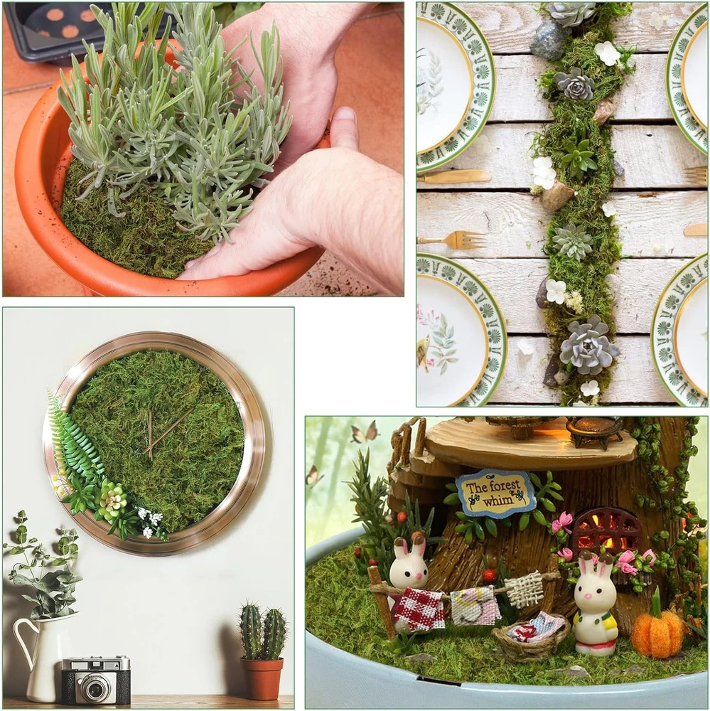 35 OZ Large Capacity Artificial Moss for Potted Plants,Natural Fresh Green Product Details Plant or Animal Product Type: Moss Indoor/Outdoor Usage: Indoor Brand: YUNVI Material Feature: Natural Color: Fresh Green Special Feature: Low Maintenance Expected Blooming Period: Spring Unit Count: 35.0 Ounce Expected Planting Period: Spring Soil Type: Sandy Soil Moisture Needs: Moderate Watering Number of Pieces: 1 Package Dimensions: 8.74 x 6.81 x 6.1 inches Item Weight: 2.14 pounds Manufacturer: YUNVI Country of Origin: China Item model number: HZ-Artificial Moss-1kg Real moss: Our artificial moss is made of premium natural moss through a series of processes such as selecting, drying and dyeing. Which is non-toxic, eco-friendly and can keep green for a long time without watering and fertilizing. Widely applications: Natural artificial moss can be used not only as plant nourishment or a substrate for reptiles or amphibians, but also as decorations - decorating table tops, etc., or you can DIY some micro-landscapes by hand so that you can use your imagination and creativity. Package includes: You will receive 35 oz(1000g) natural fake moss, enough for your daily use and replacement. Non-perishable and can be used for a long time. Green moss: The fake moss is dyed for a long lasting green color, the natural and vivid look allows you to create more beautiful spaces with the green moss and enjoy it for many years. Make your handicrafts or home decorations look more natural. Notice: The "fake grass" made from natural green moss after being dried and dyed into spring green. They are not live and will not grow! It may have a slight odor, please open it and leave it for a few days before use. Features: It can be as layering decoration for succulents. It can be used as plant nutrient soil. It can be used to decorate a moss miniature landscaper. It can be used as a decoration for weddings and other occasions. Specifications: Material: Real moss Color: Green (It will fade for a long time) Wight: 35 oz(1000g) Warm tips: Please keep this bag away from children to avoid accidental ingestion. It may have a slight odor, please open it and leave it for a few days before use.