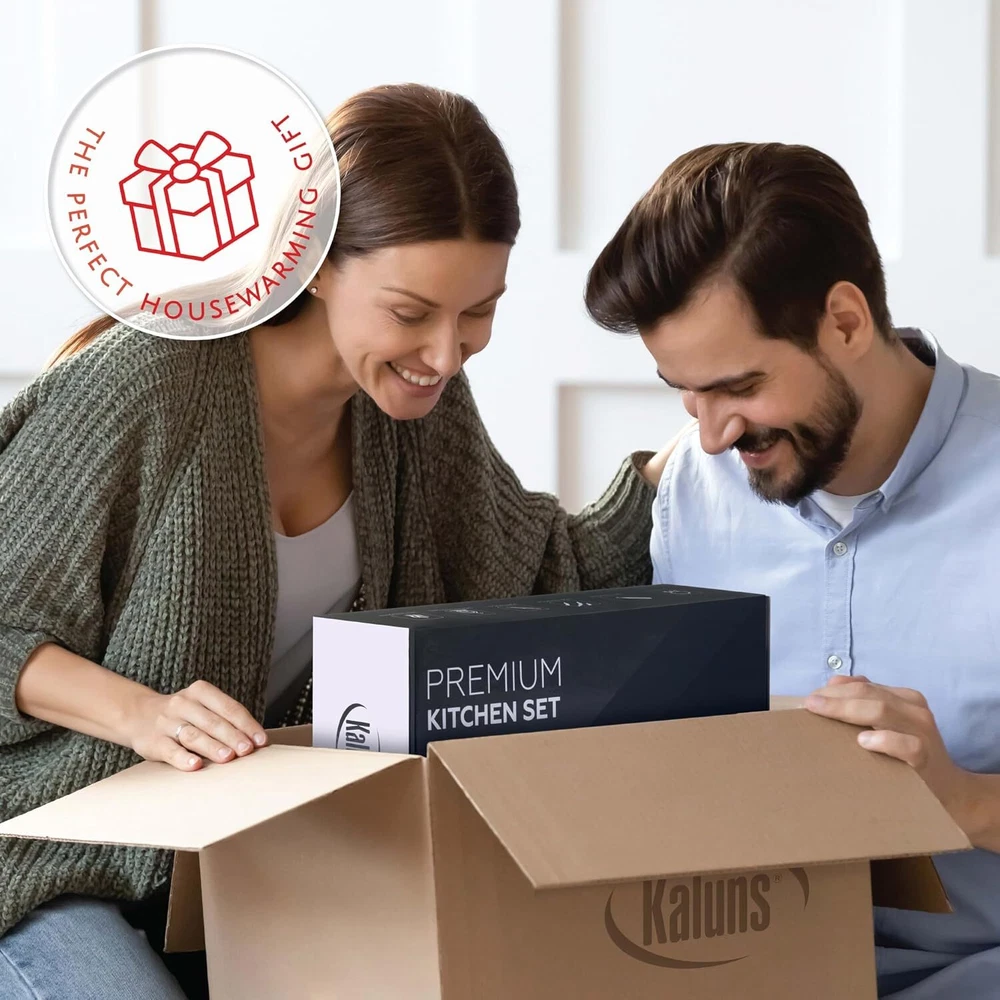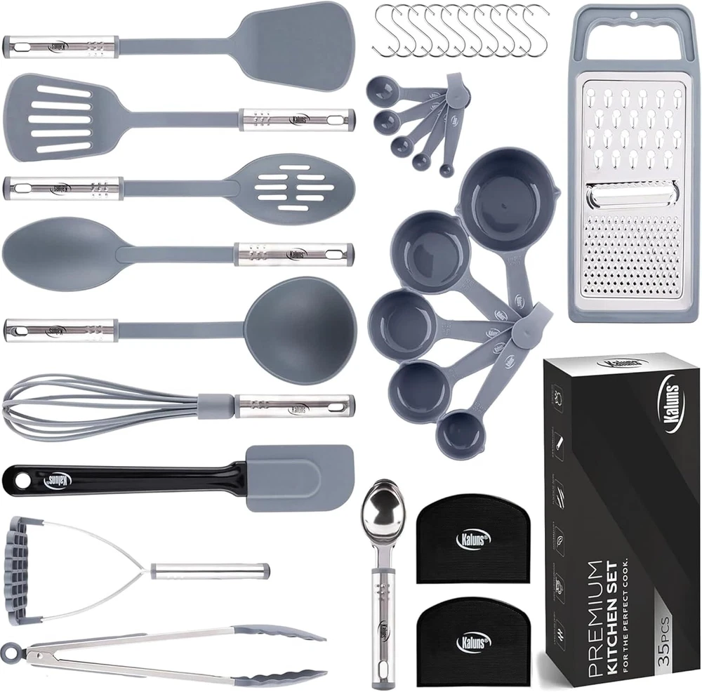 KALUNS KITCHEN UTENSIL SET: Our utensil set have everything you need for a perfect cooking experience! Kaluns kitchen gadgets and accessories are made of a combination of nylon and stainless steel to ensure no scratching or sticking. COOKING UTENSILS SET INCLUDES: Soup Ladle, Solid Spoon, Slotted Spoon, Solid Turner, Slotted Turner, Potato Pusher, Whisk, Grater, Spatula, Tongs, Ice scream Scooper, Measuring Cups, Measuring Spoons, 2 Dough Scrapers, 12 Hanging Hooks And a Beautiful Gift Box. HIGH QUALITY KITCHEN TOOLS DESIGNED TO LAST: No more worries about melting or rusty kitchen utensils. Our high-quality kitchen gadgets are polished with a special oil to prevent it from getting rusty. They are dishwasher safe, light weight and non-stick. Heat resistant is up to 350 F/180℃. GREAT VALUE NYLON AND STAINLESS STEEL UTENSIL SET: Don't spend a fortune buying each utensil individually. Buy yourself a complete kitchen tool set. Our 35 peice high quality set has everyting you need included. It is specifically designed to help you with all your food preparations, such as whisking, peeling, cutting, stirring, mixing, basting, baking, grilling, frying and serving up that perfect dish. GREAT GIFT IDEA: The Kaluns Kitchen Utensils set come in a classy box ready to gift! Great for House Warming gifts new home, wedding gift, mothers day, holiday and anyone else on your gift list apartment must haves, college dorm room essentials. Product Description