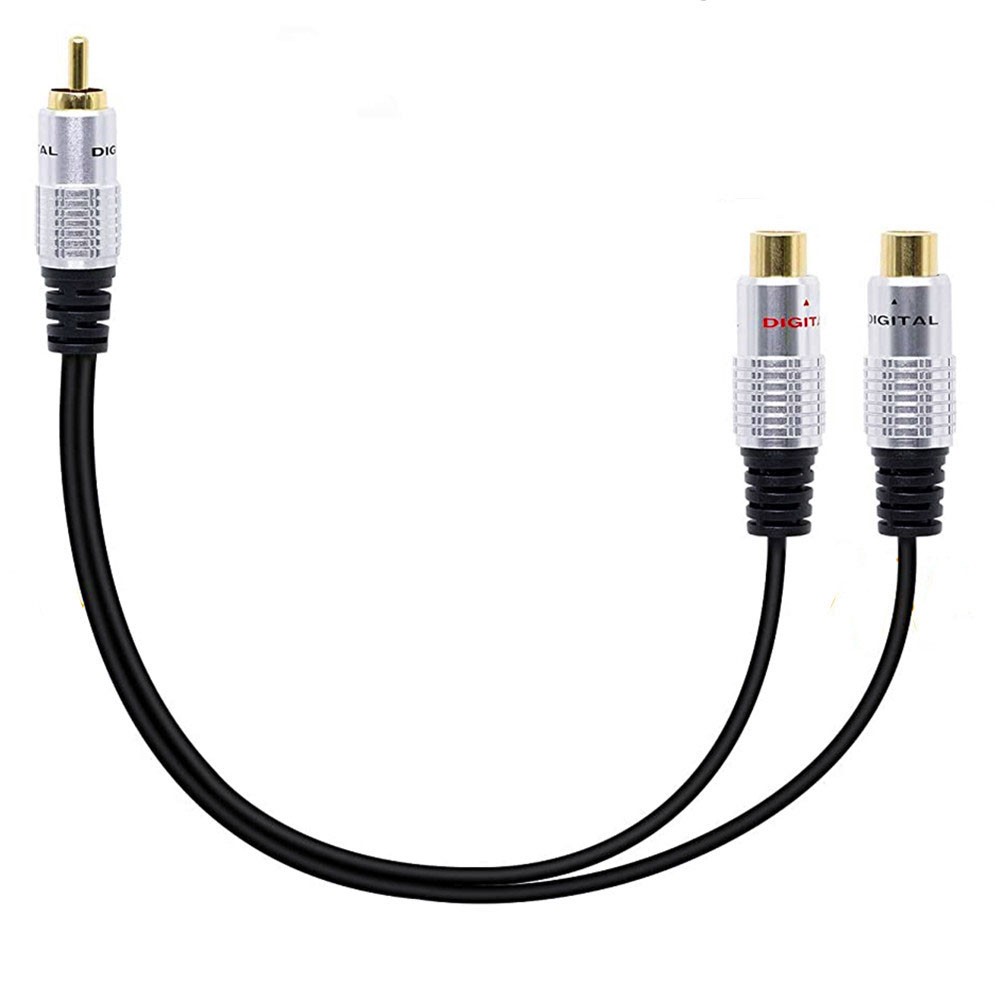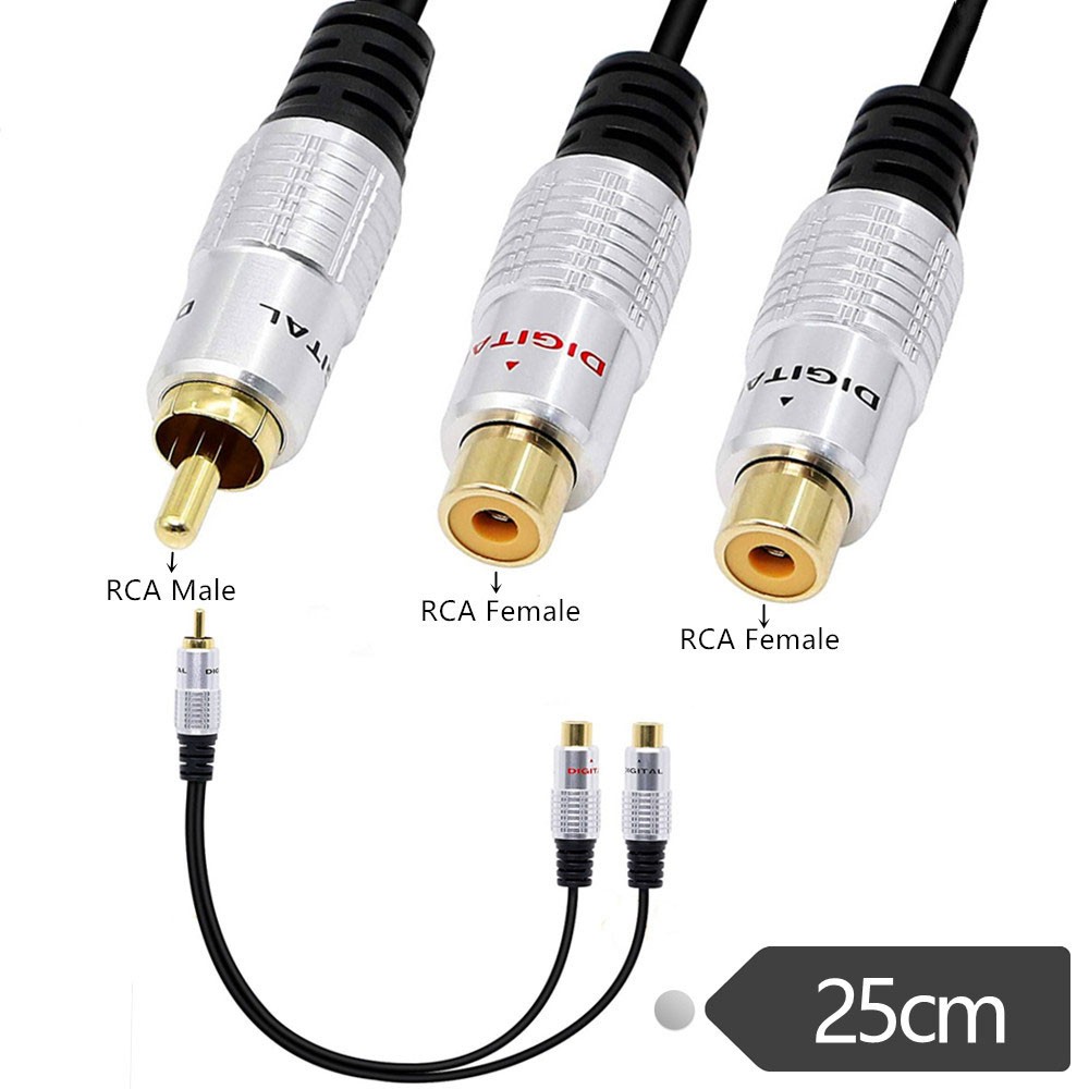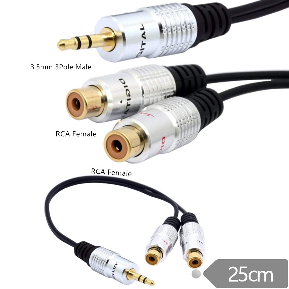 3.5mm Aux Male to Dual Female RCA Audio A/V Adapter Cable 10" Headphones Cord RCA adapter length is 10Inch (Appr:25CM), 3.5mm mini-jack to 2-RCA stereo audio Y adapter cable RCA Female Stereo Plug is perfect to plug a portable CD player, MP3 player, iPod, smartphone, tablet, PC sound card, and other devices with an aux connector into the existing RCA connections RCA (M) to 2 RCA (F) stereo audio Y adapter subwoofer cable will send your music from an MP3 player to a stereo system. Plugs audio cable is designed to split a stereo signal, high-quality polished connectors, and corrosion-resistant 3.5mm connectors; prevent radio frequency interference (RFI) and electromagnetic interference (EMI). 2-RCA stereo audio Y adapter cable one end has two color-coded female 3.5mm stereo mini jacks (left and right audio channels).and the other end has one male RCA plugs
