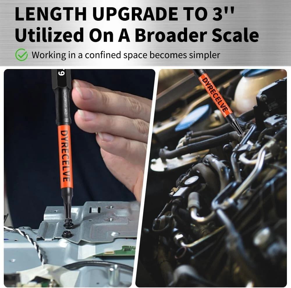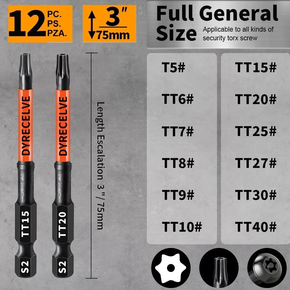 ✅ Brand New & High Quality ✅ Fast Shipping from Trusted Supplier ✅ 100% Customer Satisfaction Guarantee 6 Inch [Advantage of DYRECELVE] Embrace professional-grade, authentic tools from an esteemed international brand, empowering over 2 million users with our cutting-edge technology. [Long Torx Bit Set 6-Inch] This 8-Pack torx bit with hole in center of has a length of 6 inches, including T8, T10, T15, T20, T25, T27, T30, T40. Each drill bit is clearly labeled with its size. [Upgraded Industrial Strength Material] Long Torx Security Bit Set are made of solid S2 alloy steel with a hardness reaching 60 HRC, torsion zone to absorb torque peaks to avoid breakage. [CNC Machined Tips] This tamper proof torx bit set and is of torx security bits. It features a quenched core and a manganese phosphate surface. 1/4'' Hex-Shank quick release, with a bit holder. [Enhanced Magnetic] Impact magnetic torque bits facilitate screw retrieval, and the magnetism remains intact even after multiple uses, so you don't have to worry about its decay over time. [What You Get] A set of 8 professional-grade 6 inch Long star bit sets for home repairs, repairing electronic products, auto repairs, woodworking and other screw driving applications. It is an essential tool for DIY enthusiasts and mechanics. 3 Inch [Advantage of DYRECELVE] Embrace professional-grade, authentic tools from an esteemed international brand, empowering over 2 million users with our cutting-edge technology. [Star Bits Sizes] This 12-Pieces torx bit with hole in center of has a length of 3 inches, including T5, T6, T7, T8, T9, T10, T15, T20, T25, T27, T30, T40. Each drill bit is clearly labeled with its size. (T5 solid head). [Upgraded Industrial Strength Material] Torx security bit Set are made of solid S2 alloy steel with a hardness reaching 60 HRC, torsion zone to absorb torque peaks to avoid breakage. [CNC Machined Tips] This tamper proof torx bit set and is of torx security bits. It features a quenched core and a manganese phosphate surface. 1/4'' Hex-Shank quick release with a bit holder. [Enhanced Magnetic] Impact magnetic torque bits facilitate screw retrieval, and the magnetism remains intact even after multiple uses, so you don't have to worry about its decay over time. [What You Get] A set of 12 professional-grade star bit sets for home repairs, repairing electronic products, auto repairs, woodworking and other screw driving applications. It is an essential tool for DIY enthusiasts and mechanics. 📌 Why Buy From Us? - Fast, Reliable Shipping - No Hassle Returns 💬 Questions? Message us anytime! THANK YOU